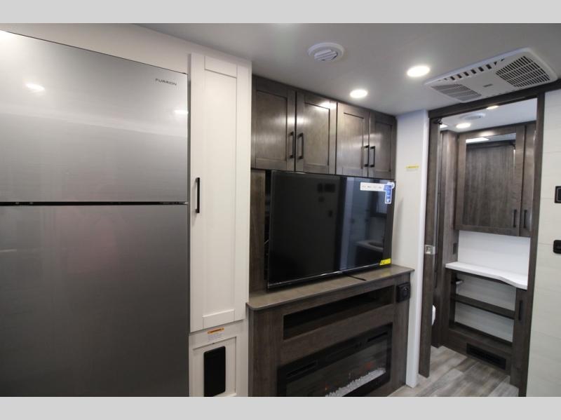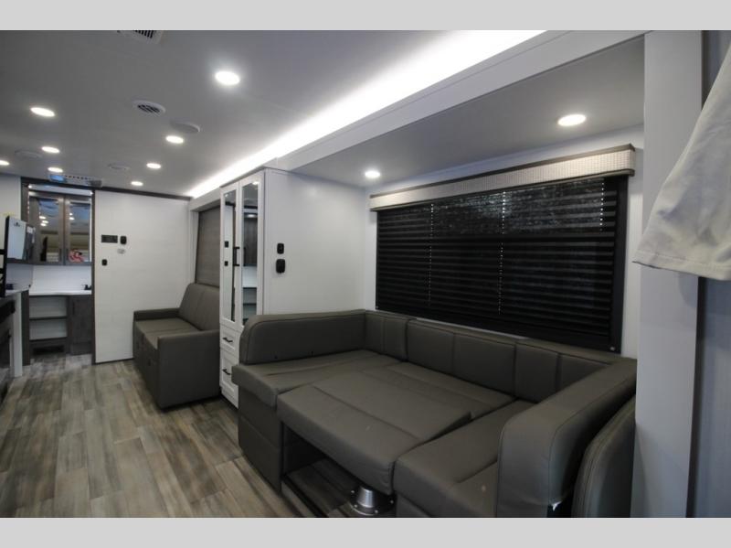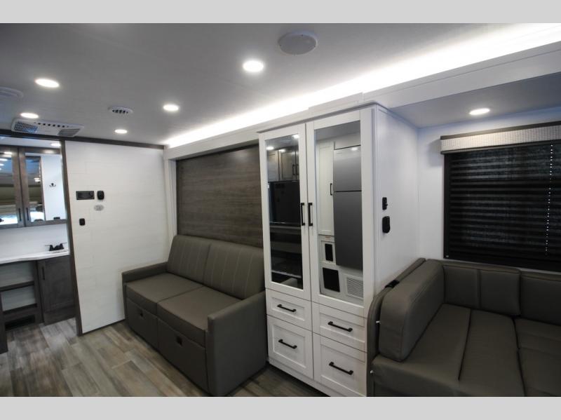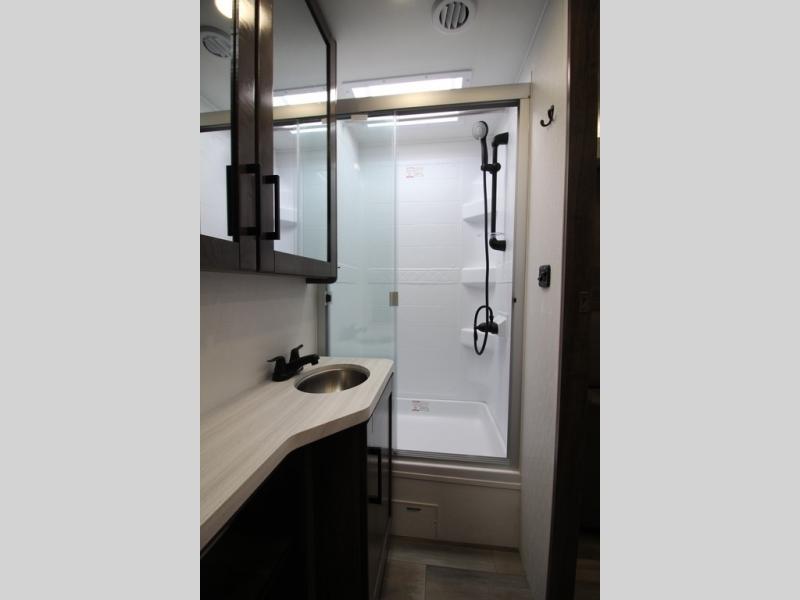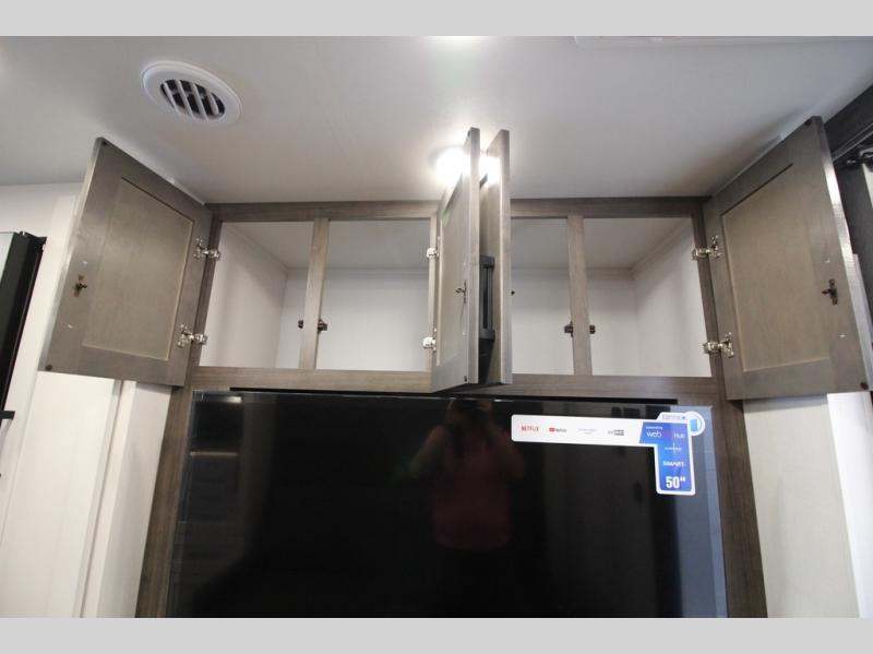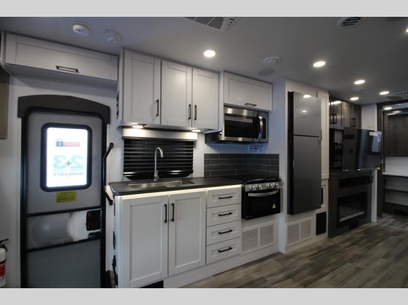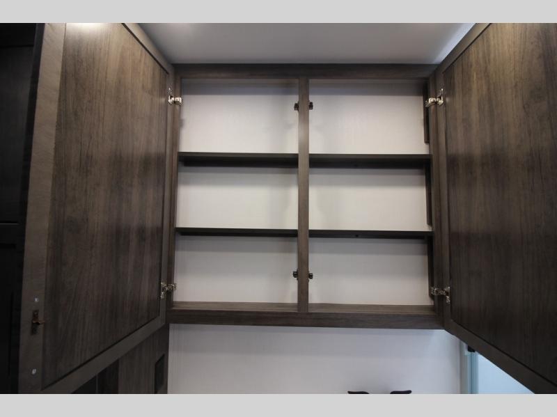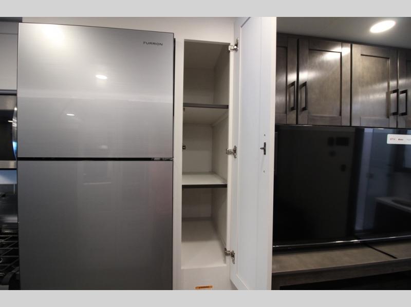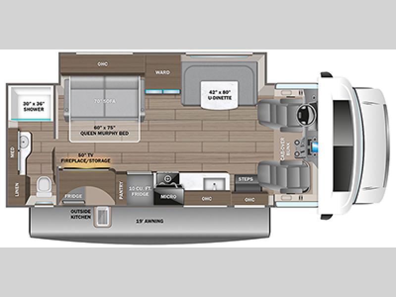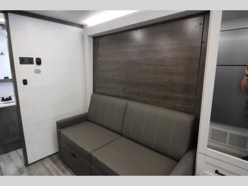 Enjoy a versatile space with the queen Murphy bed and sofa combination which allows you to relax and watch the 50" LED HD Smart TV with a fireplace. The rear full bathroom is spacious, and provides extra counter space, linen storage, plus a space savings sliding door. The cook will love the galley kitchen with everything nearby including a residential-size microwave, a pantry and the 10 cu. ft. refrigerator. The cook can use the outside kitchen as well. Dine at the U-shaped dinette or while outside sitting under the 19' electric awning, yet you might choose the theater seating option if you like that type of comfort. And the cab over bunk is sure to be a popular place to sleep when you have guests.