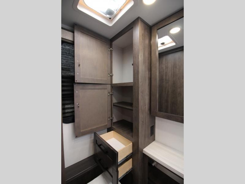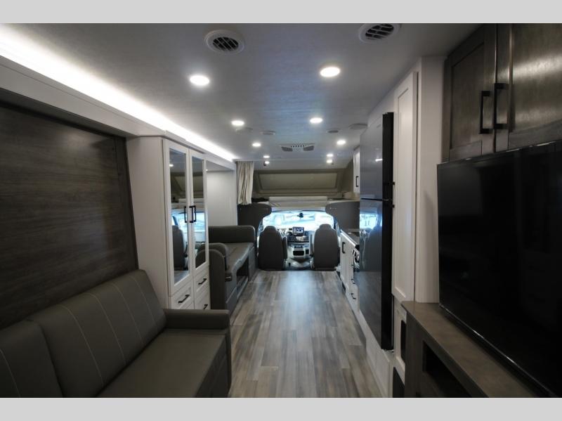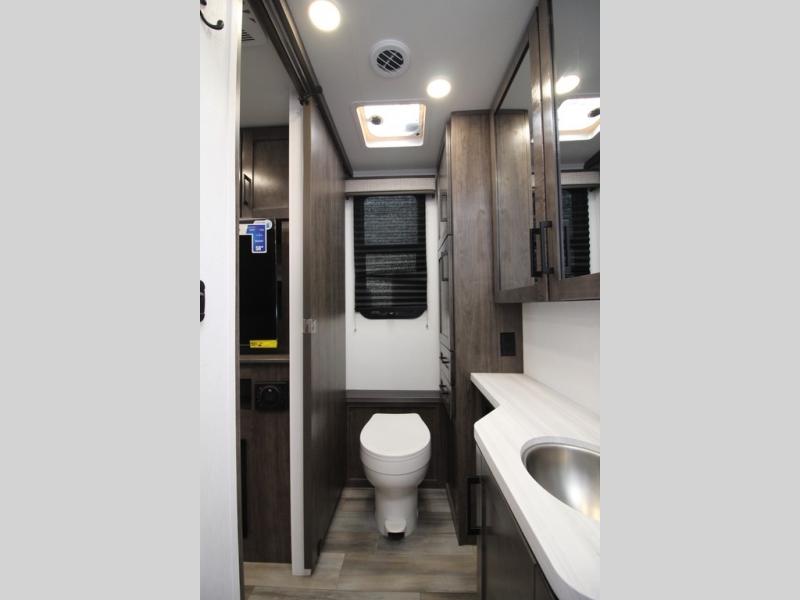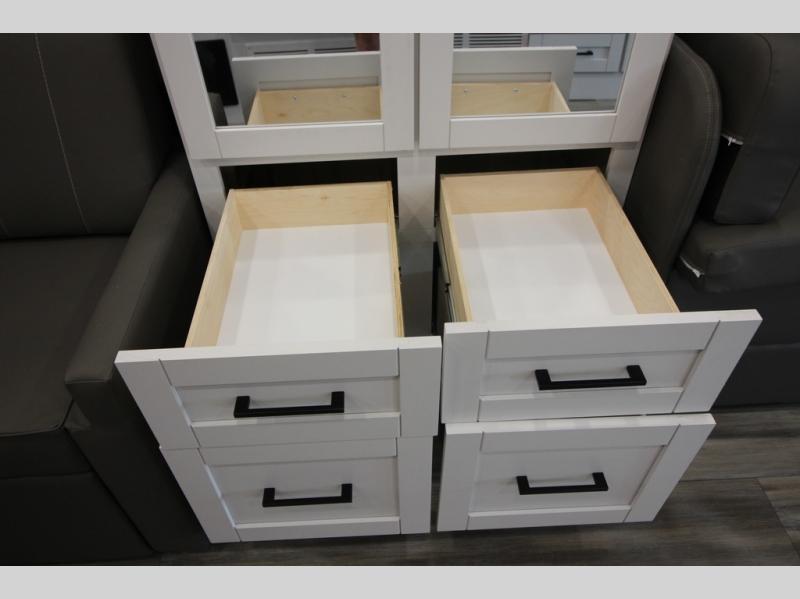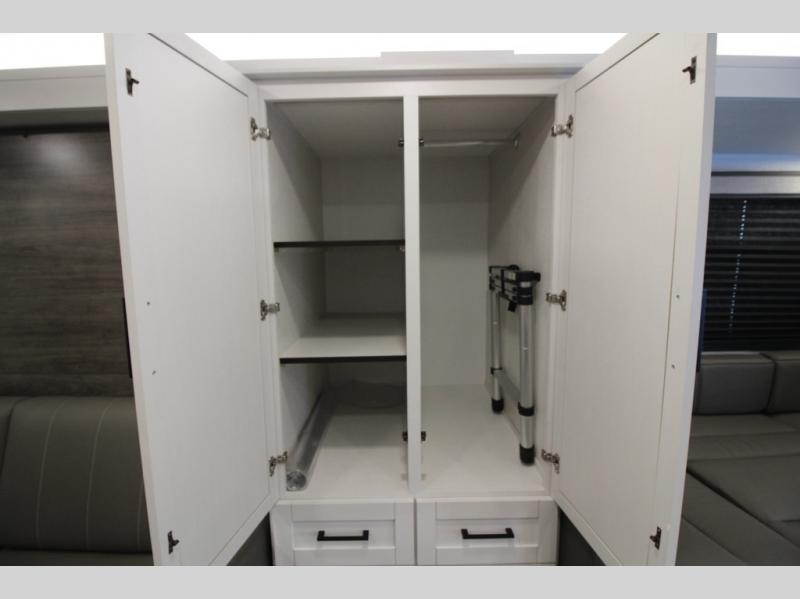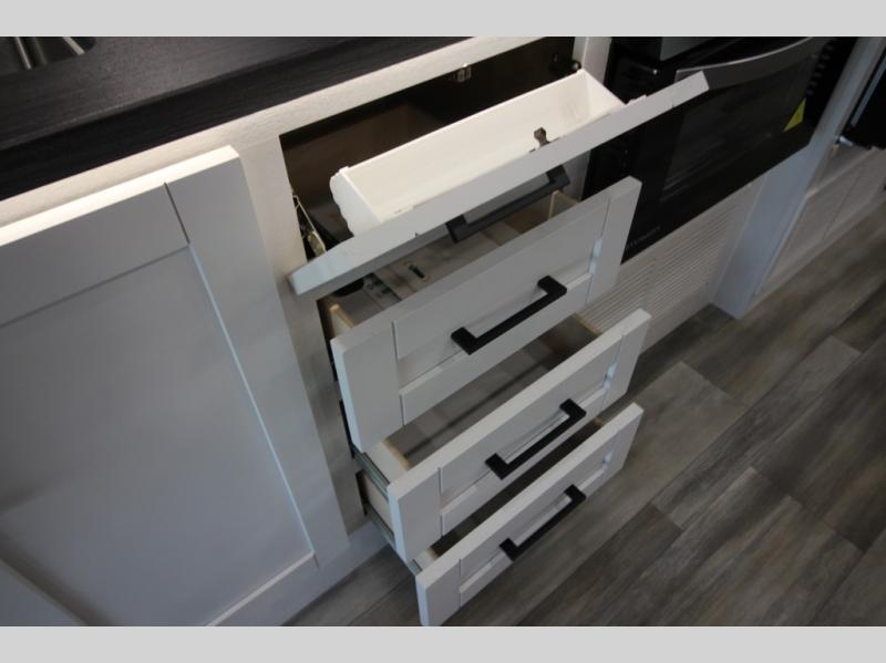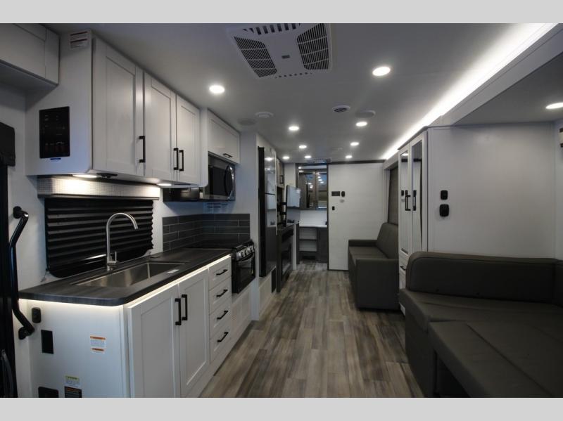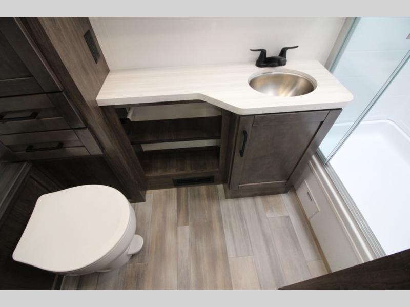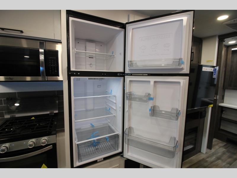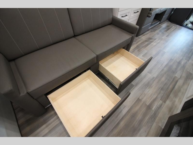 Enjoy a versatile space with the queen Murphy bed and sofa combination which allows you to relax and watch the 50" LED HD Smart TV with a fireplace. The rear full bathroom is spacious, and provides extra counter space, linen storage, plus a space savings sliding door. The cook will love the galley kitchen with everything nearby including a residential-size microwave, a pantry and the 10 cu. ft. refrigerator. The cook can use the outside kitchen as well. Dine at the U-shaped dinette or while outside sitting under the 19' electric awning, yet you might choose the theater seating option if you like that type of comfort. And the cab over bunk is sure to be a popular place to sleep when you have guests.