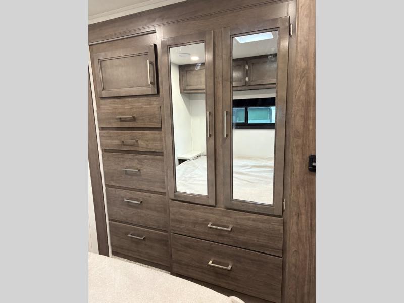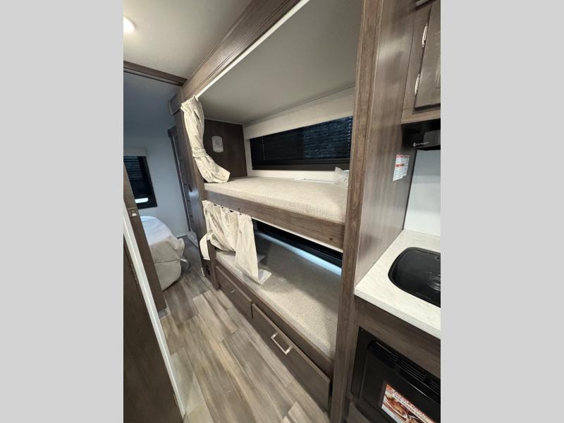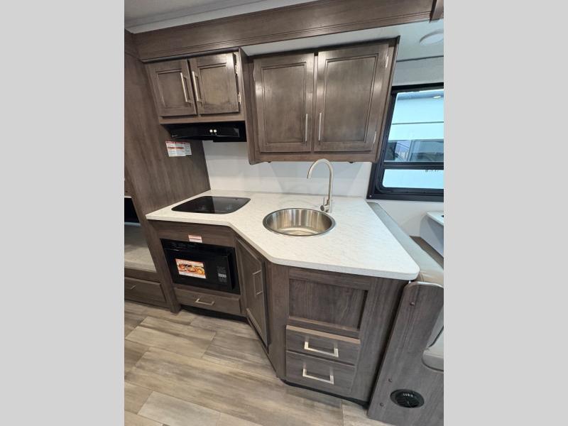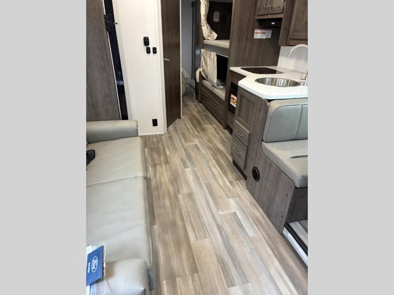 Searching for an RV to travel with family and friends? This coach offers up to seven sleeping spaces when you utilize the queen bed, the bunk beds, the cab over bunk and the furniture. The private master bedroom is in the rear and has access to the double entry bathroom, and the bunk beds are just across from the main entrance which is convenient. The kitchen provides a Furrion all-in-one cooktop and oven, a residential-size microwave and an 10 cu. ft. refrigerator, plus a pantry. You can dine at the Jayco exclusive, easy-operation legless dinette table or while sitting on the sofa. You might like to add the theater seating option in place of the sofa if you prefer that setup. And the cab seats swivel for more seating.