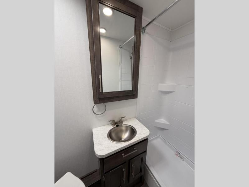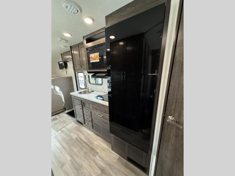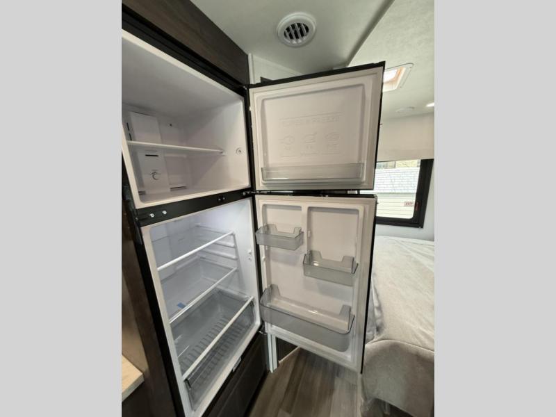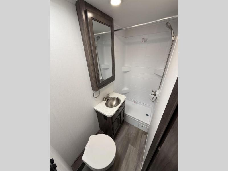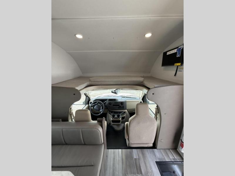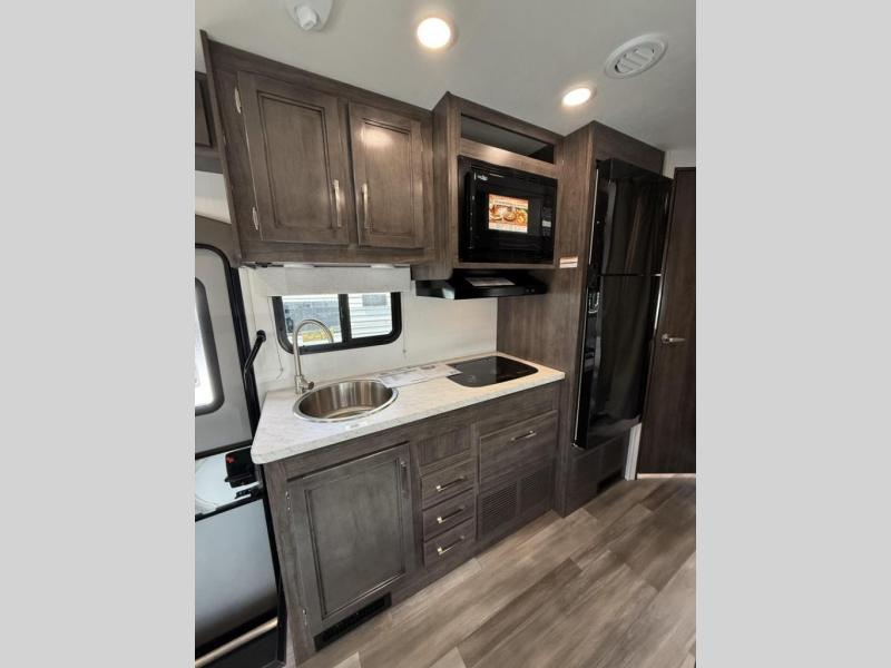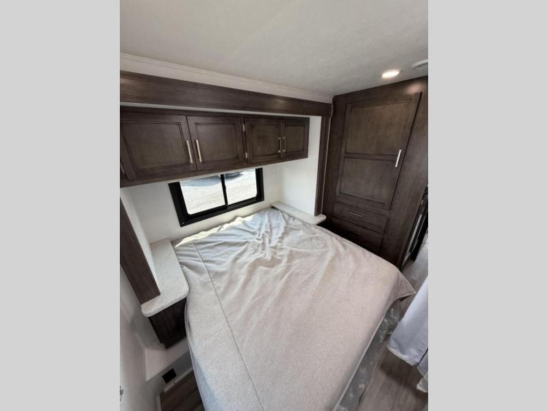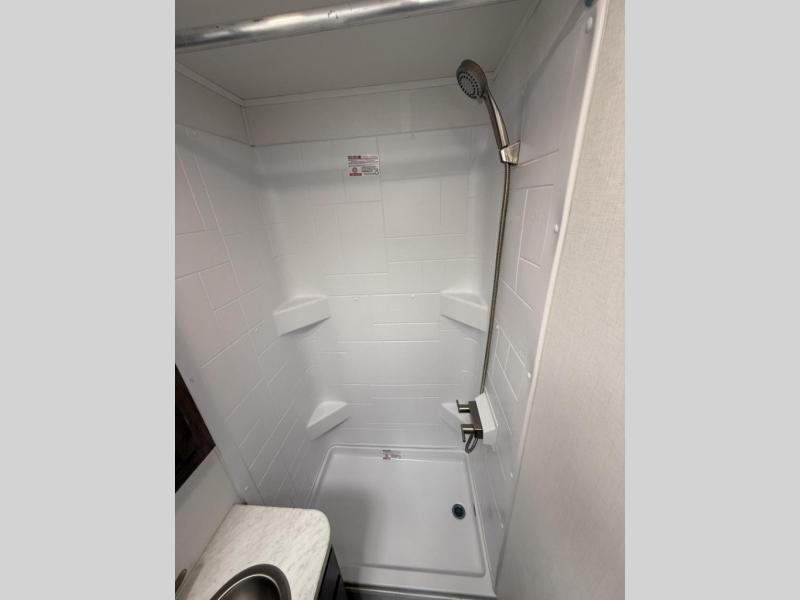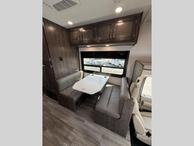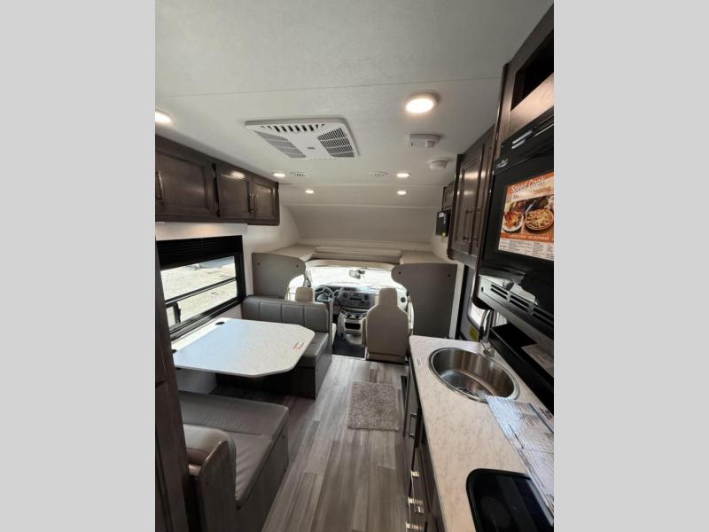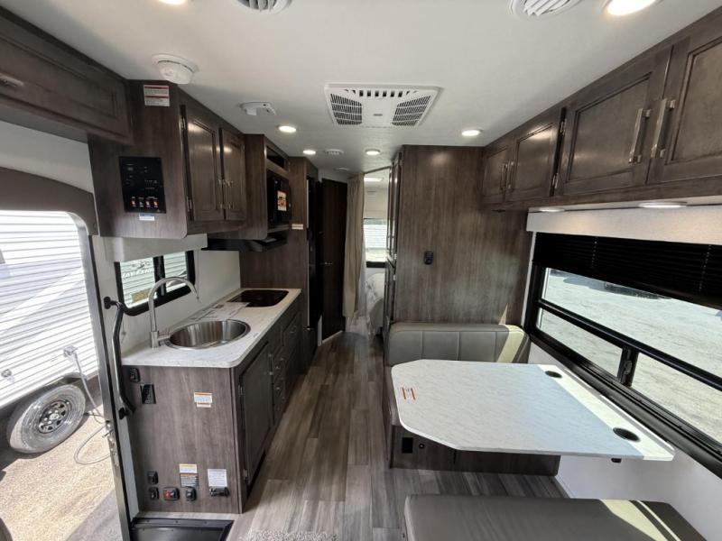 There's a comfortable place to sleep for everyone in this motorhome! From the corner 60" x 70" queen bed that slides out to the bunk over cab, and even the 42" x 70" booth dinette once converted. You can store your favorite snacks and hang up your clothes in the wardrobe/pantry. The chef can prepare delicious meals with the two burner cooktop and if there happens to be any leftovers then they can be stored in the 10 cu. ft. 12V refrigerator. The rear corner bathroom has a 24" x 36" shower that you are sure to enjoy after a long day of traveling!
