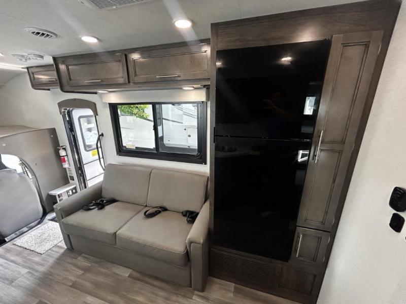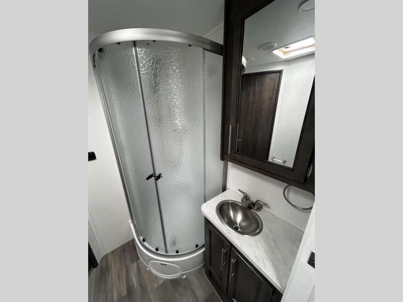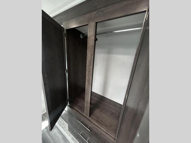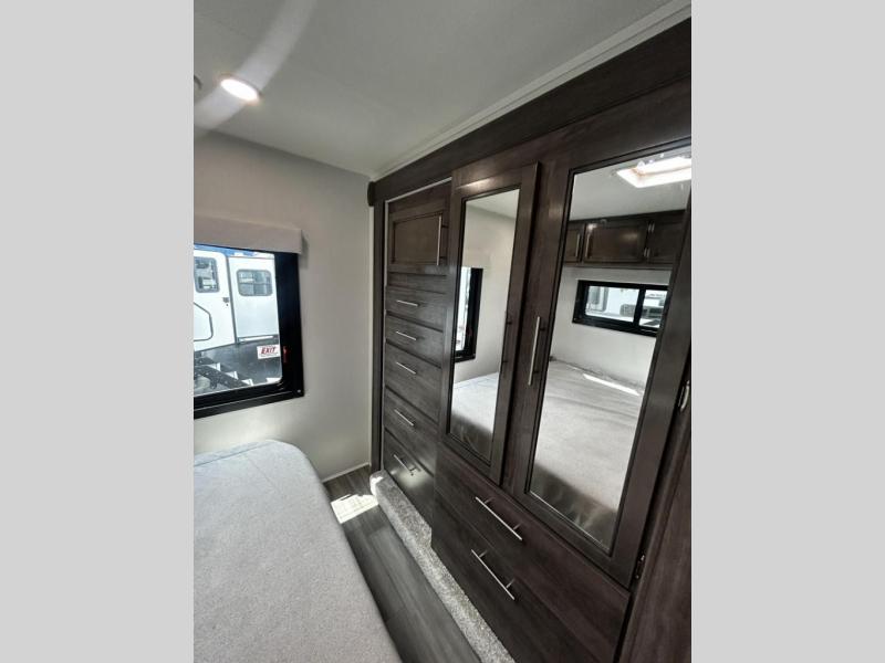 This coach will be perfect if you enjoy traveling with a larger group. Between the cab-over bunk and bunk beds, plus the RV queen bed and living area furniture, you can comfortably sleep eight! You can prepare meals for your crew on the two burner cooktop or in the convection microwave, and there is a 10 cu. ft. 12V refrigerator plus a pantry for food storage. The bunk beds are across from the dual entry bath for easy nighttime use, and you'll appreciate the rear private bedroom all to yourselves. Along with the RV queen bed, there is a wardrobe and drawers to keep shoes, clothes and more stored away!