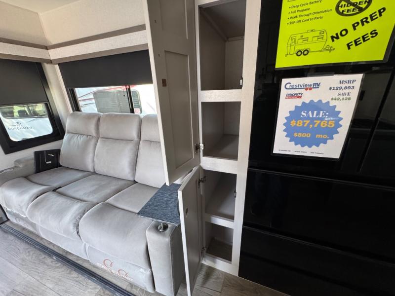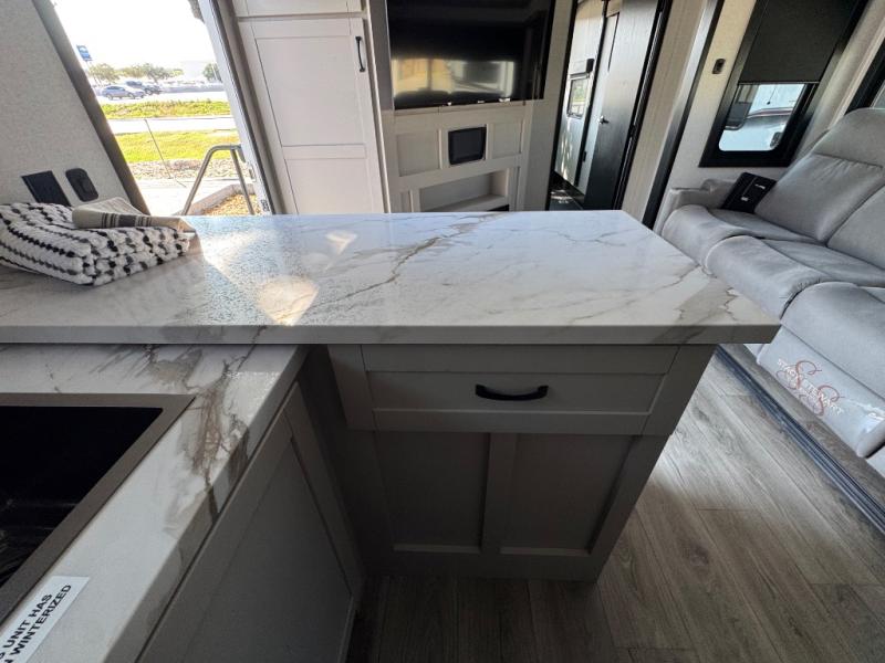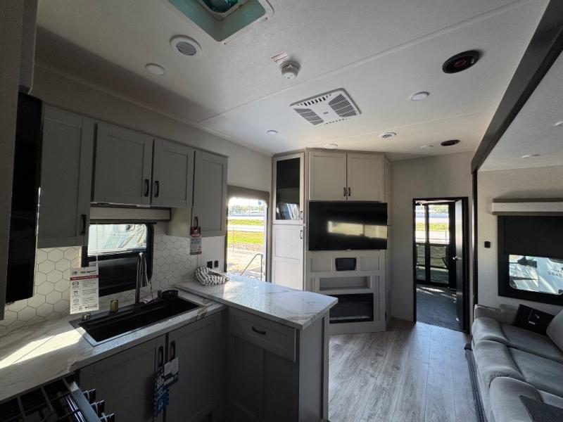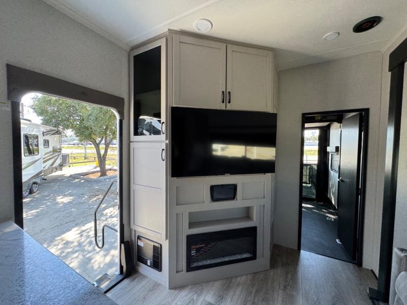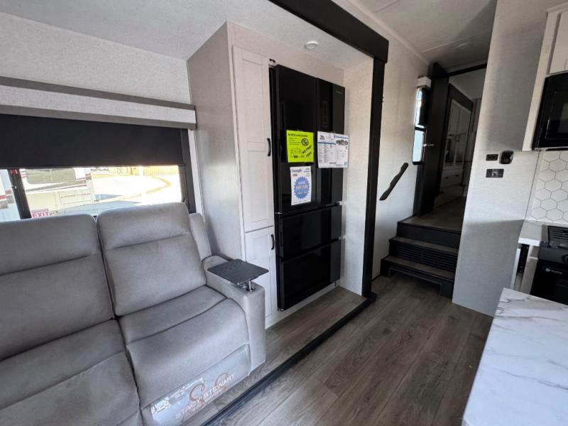 Get ready for outdoor adventures in this spacious toy hauler. Your guests will have the 11' separate garage area with its own half bath, a queen bed with rear convertible sofas, plus an overhead storage area for their things. The main living area includes a large slide out for added space, and here you can relax on the sofa that sits across from the entertainment center and fireplace. The chef will love the U-shaped kitchen counter, 17 cu. ft. 12V refrigerator, and residential oven with a three burner cooktop. You will feel right at home in the front private bedroom with its slide out wardrobe and king bed for all-around comfort.