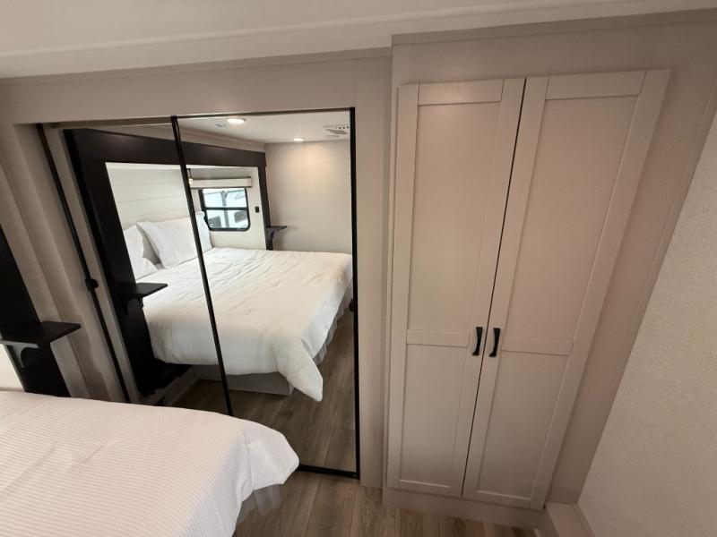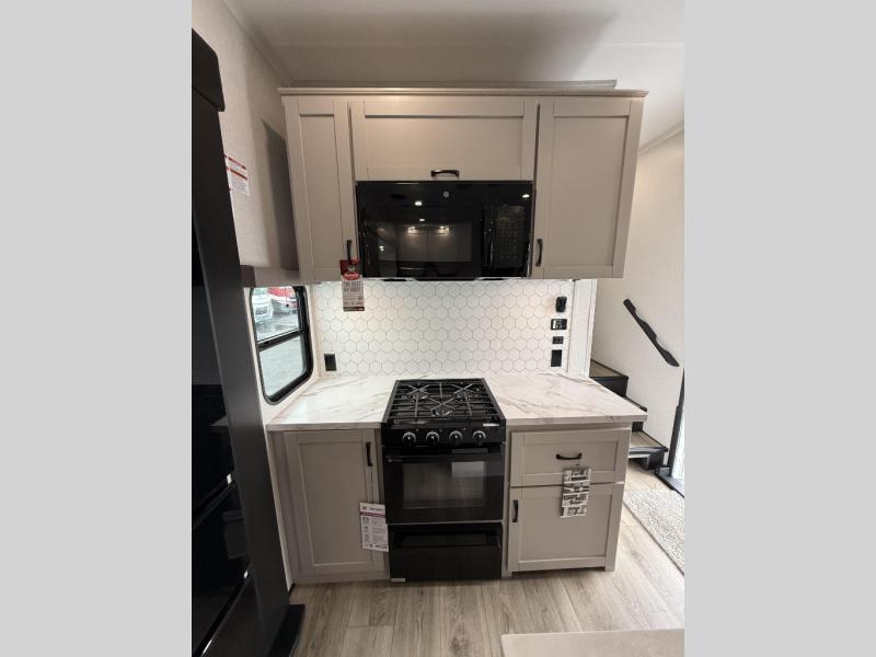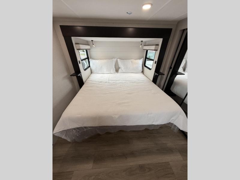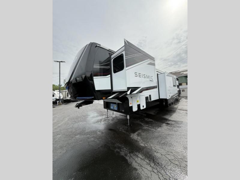One look at the Seismic toy haulers by Jayco, and you'll never go back! Each model features a custom automotive-grade vinyl exterior graphics package, a painted fiberglass front cap with built-in LED lighting, and 102" wide-body structural steel I-beam construction. You'll find the pass-through storage with Slam-Latch baggage doors will make unpacking easier than ever, and the rear ramp door/patio with anti-slip, non-skid flooring will allow you to unload your toys with no trouble at all. These toy haulers feature a three seasons garage wall/doors, a 30 gallon fuel tank with a timer, and exterior marine-grade speakers to keep the party going. The Climate Shield zero degree tested weather protection includes a 35,000 BTU furnace, PEX plumbing, and a fully enclosed and heated underbelly so you can enjoy your adventures year around. And we haven't even touched on the interior luxuries you'll find, like solid hardwood cabinet doors, residential vinyl flooring made in the USA, night shades, and more!