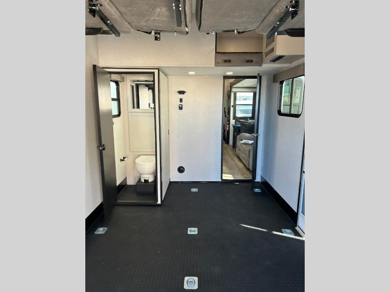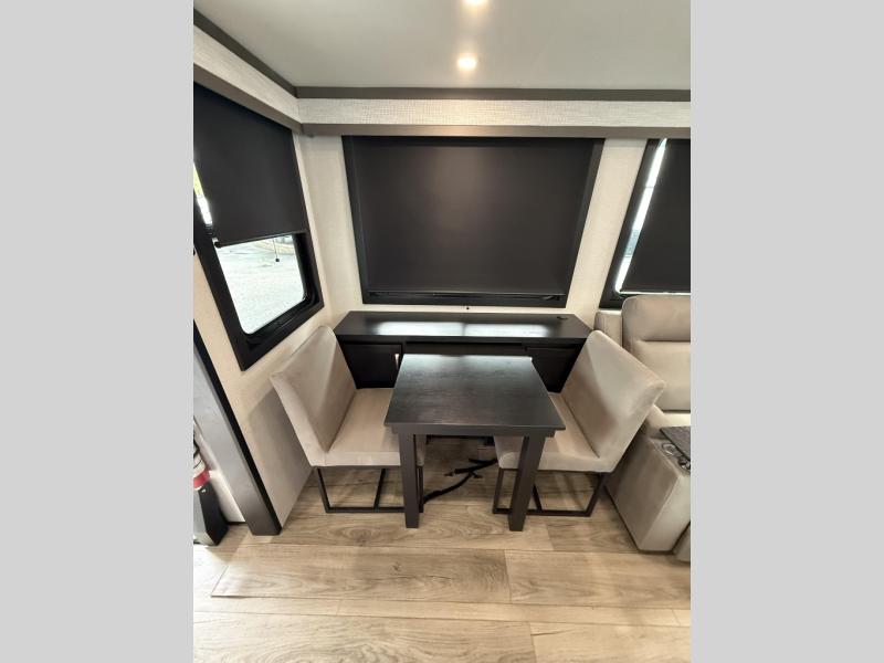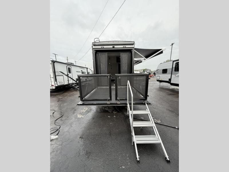Take your outdoor adventures up a notch with this Seismic toy hauler. You can take the whole gang along for some fun with triple slides and dual entry for easy access going in and out. Your friends will sleep comfortably on the convertible sofas with overhead queen bed above in the 14' cargo garage space. There is also a storage space/loft above for their things and additional sleeping if needed. Inside, a full bath can be shared by all to get cleaned up each day, and all can gather inside in the spacious living area featuring dual opposing slides. Theater seating and an L-shaped tri-fold sofa create plenty of space for lounging. There is also a dining table for four inside and the second table in the garage area allows for more seating during meals inside when the weather isn't that nice. Two side awnings provide protection from the elements, along with a rear awning, and the rear ramp party deck with steps create even more outdoor living space to enjoy!