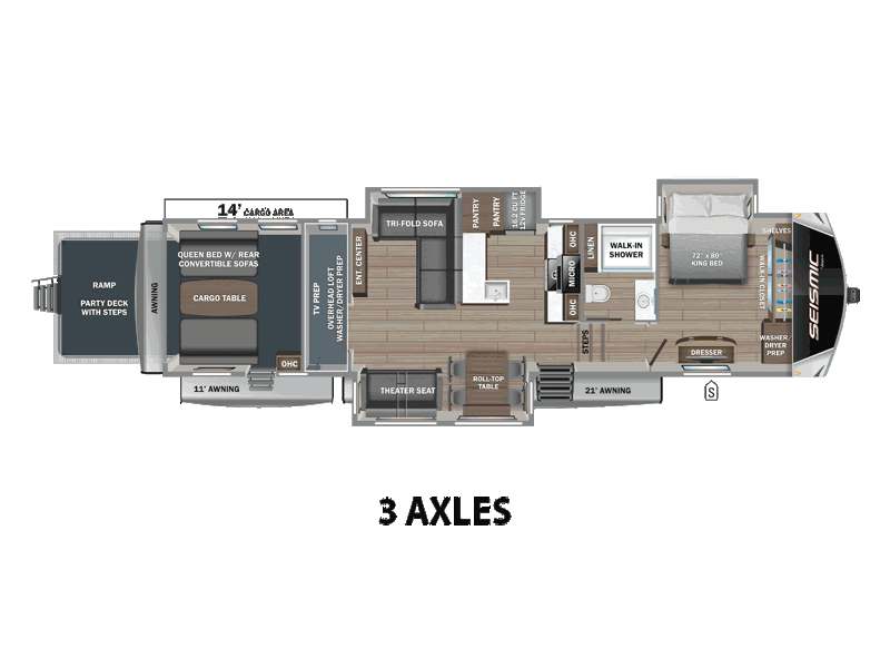 Take your outdoor adventures up a notch with this Seismic toy hauler. You can take the whole gang along for some fun with triple slides and dual entry for easy access going in and out. Your friends will sleep comfortably on the convertible sofas with overhead queen bed above in the 14' cargo garage space. There is also a storage space/loft above for their things and additional sleeping if needed. Inside, a full bath can be shared by all to get cleaned up each day, and all can gather inside in the spacious living area featuring dual opposing slides. Theater seating and an L-shaped tri-fold sofa create plenty of space for lounging. There is also a dining table for four inside and the second table in the garage area allows for more seating during meals inside when the weather isn't that nice. Two side awnings provide protection from the elements, along with a rear awning, and the rear ramp party deck with steps create even more outdoor living space to enjoy!
