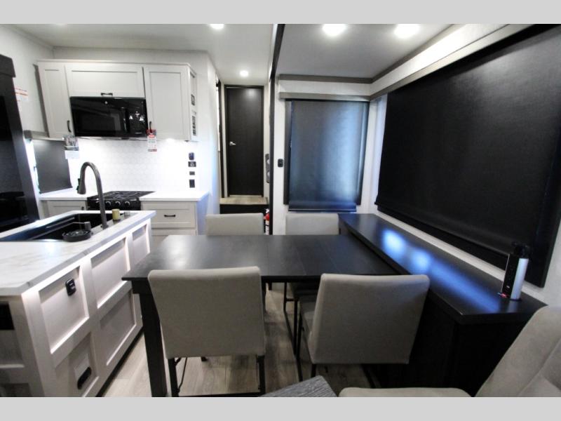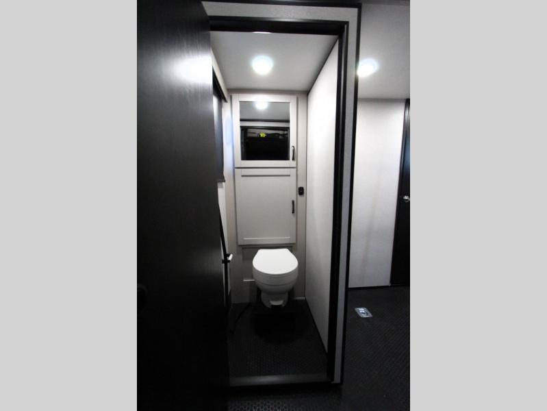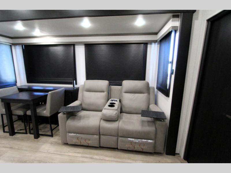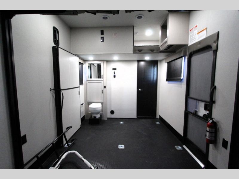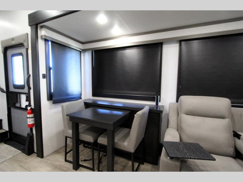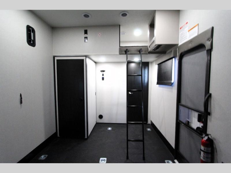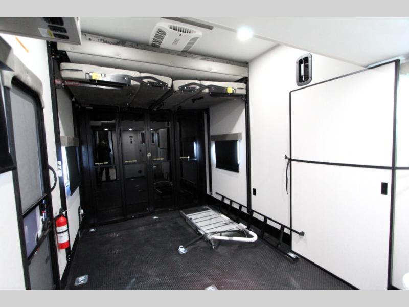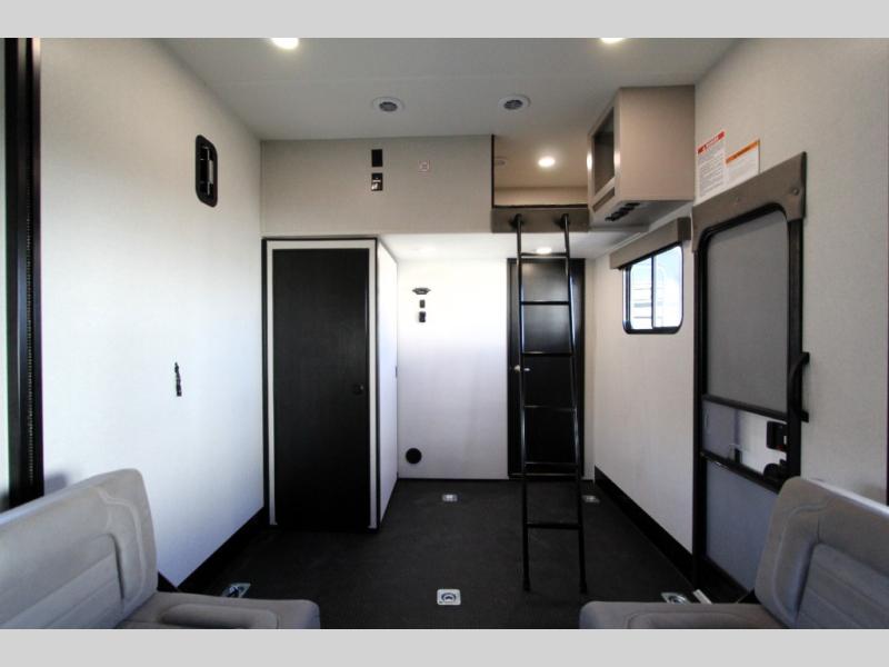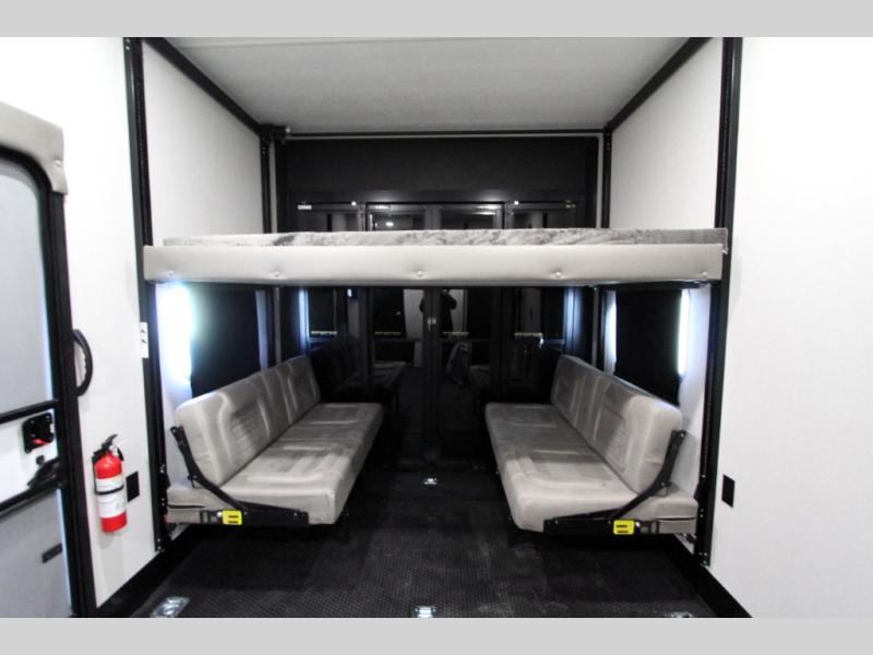 Take your outdoor adventures up a notch with this Seismic toy hauler. You can take the whole gang along for some fun with triple slides and dual entry for easy access going in and out. Your friends will sleep comfortably on the convertible sofas with overhead queen bed above in the 14' cargo garage space. There is also a storage space/loft above for their things and additional sleeping if needed. Inside, a full bath can be shared by all to get cleaned up each day, and all can gather inside in the spacious living area featuring dual opposing slides. Theater seating and an L-shaped tri-fold sofa create plenty of space for lounging. There is also a dining table for four inside and the second table in the garage area allows for more seating during meals inside when the weather isn't that nice. Two side awnings provide protection from the elements, along with a rear awning, and the rear ramp party deck with steps create even more outdoor living space to enjoy!