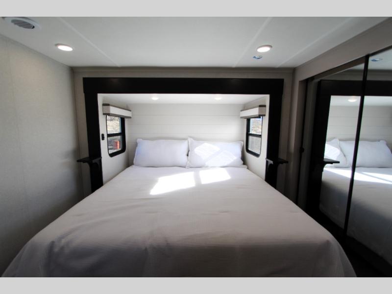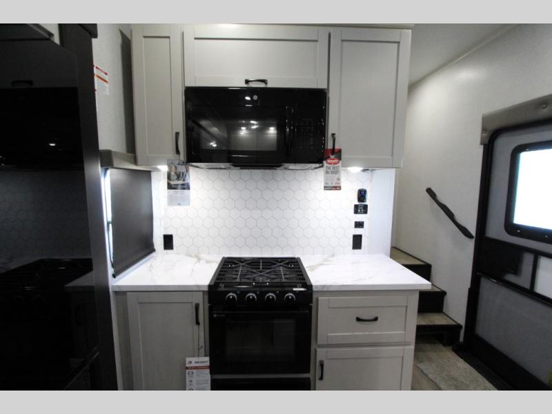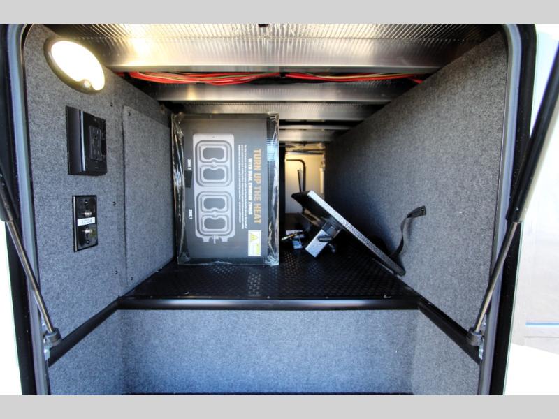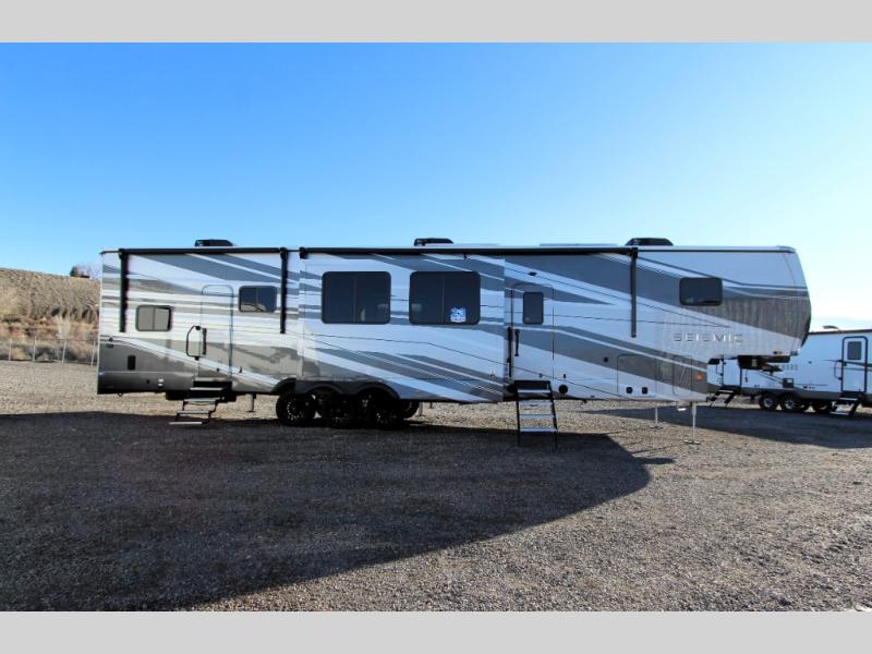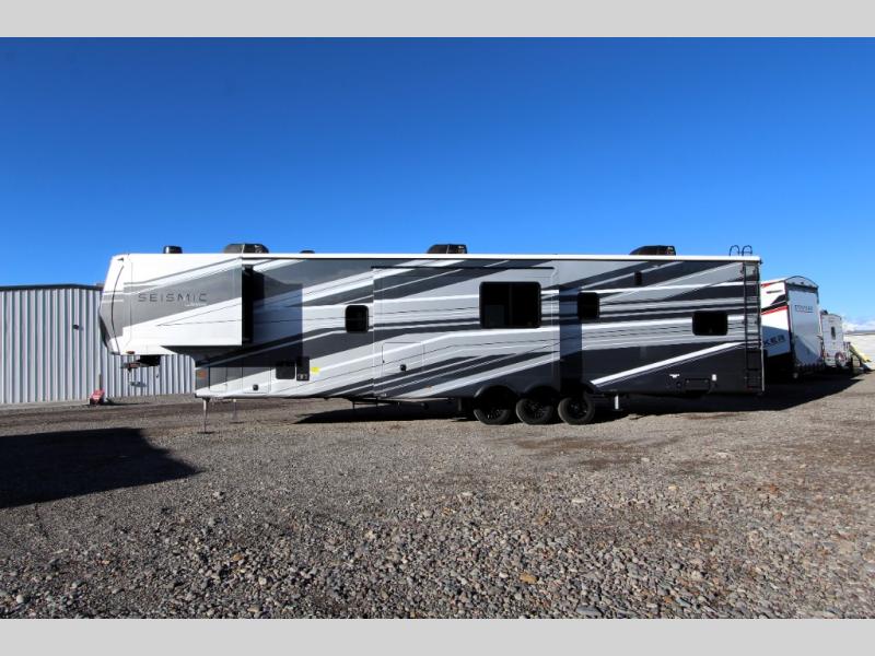 One look at the Seismic toy haulers by Jayco, and you'll never go back! Each model features a custom automotive-grade vinyl exterior graphics package, a painted fiberglass front cap with built-in LED lighting, and 102" wide-body structural steel I-beam construction. You'll find the pass-through storage with Slam-Latch baggage doors will make unpacking easier than ever, and the rear ramp door/patio with anti-slip, non-skid flooring will allow you to unload your toys with no trouble at all. These toy haulers feature a three seasons garage wall/doors, a 30 gallon fuel tank with a timer, and exterior marine-grade speakers to keep the party going. The Climate Shield zero degree tested weather protection includes a 35,000 BTU furnace, PEX plumbing, and a fully enclosed and heated underbelly so you can enjoy your adventures year around. And we haven't even touched on the interior luxuries you'll find, like solid hardwood cabinet doors, residential vinyl flooring made in the USA, night shades, and more!