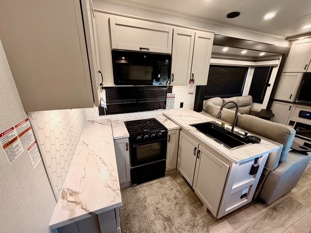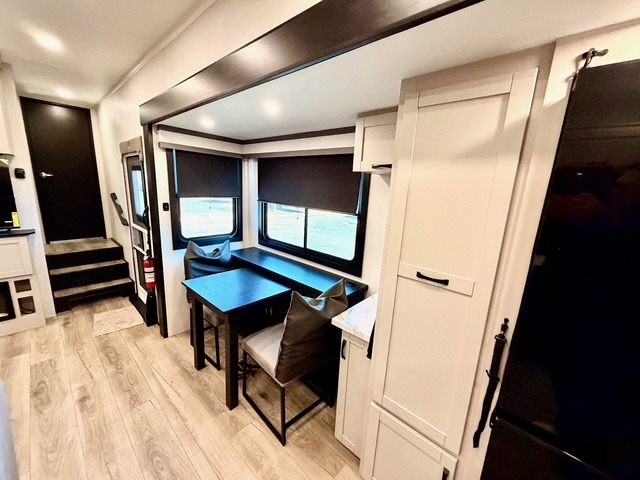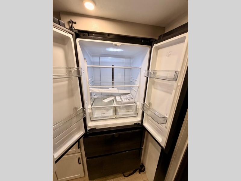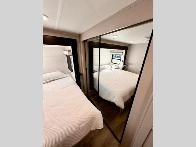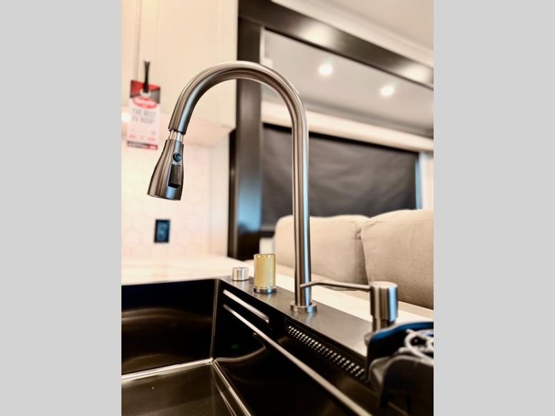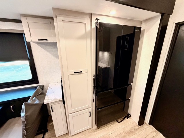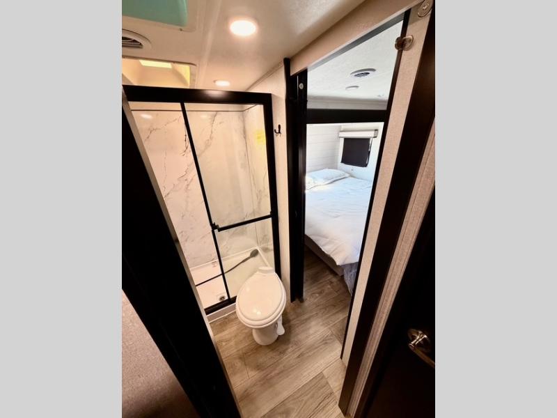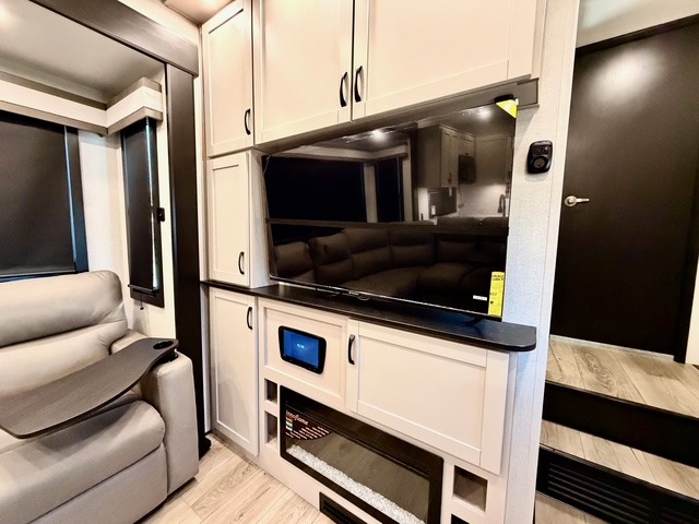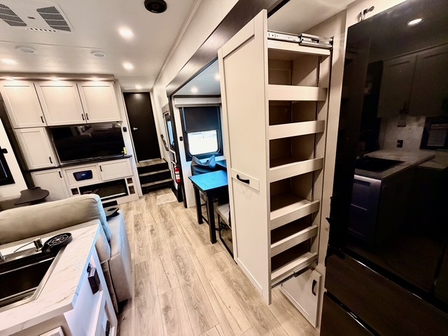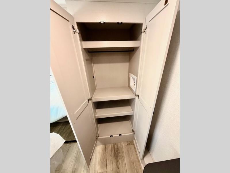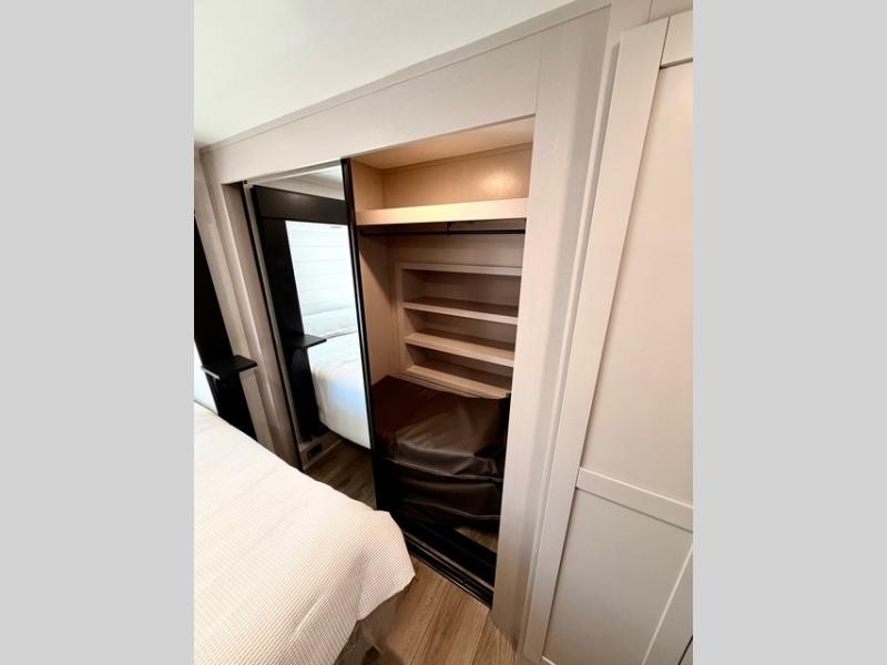 Up front, the private master bedroom provides a luxurious retreat with a 60" x 80" queen bed in a third slide out, a walk-in closet, dresser, and washer/dryer prep for full-time convenience. The dual-entry bath accessible from both the hall and master bedroom includes a walk-in shower, vanity with sink, overhead storage, and a toilet. With ample interior storage, built-in cabinetry, and high-end finishes, everyone can enjoy the comforts of home while on the road.