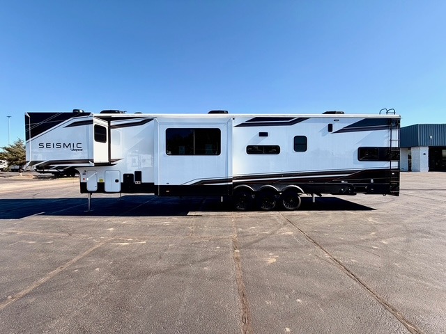 Seismic toy haulers are engineered for durability and fun. This model features a custom automotive-grade vinyl exterior graphics package, a painted fiberglass front cap with built-in LED lighting, and 102" wide-body structural steel I-beam construction. Pass-through storage with Slam-Latch baggage doors simplifies loading, and the rear ramp door/patio with anti-slip, non-skid flooring makes unloading toys safe and easy. Additional exterior features include a three-season garage wall, a 30-gallon fuel tank with timer, marine-grade exterior speakers, and dual side awnings for extended outdoor enjoyment. The Climate Shield zero-degree tested weather protection, 35,000 BTU furnace, PEX plumbing, and fully enclosed, heated underbelly make year-round adventures possible, while interior amenities such as solid hardwood cabinet doors, residential vinyl flooring, night shades, and more elevate the overall experience.