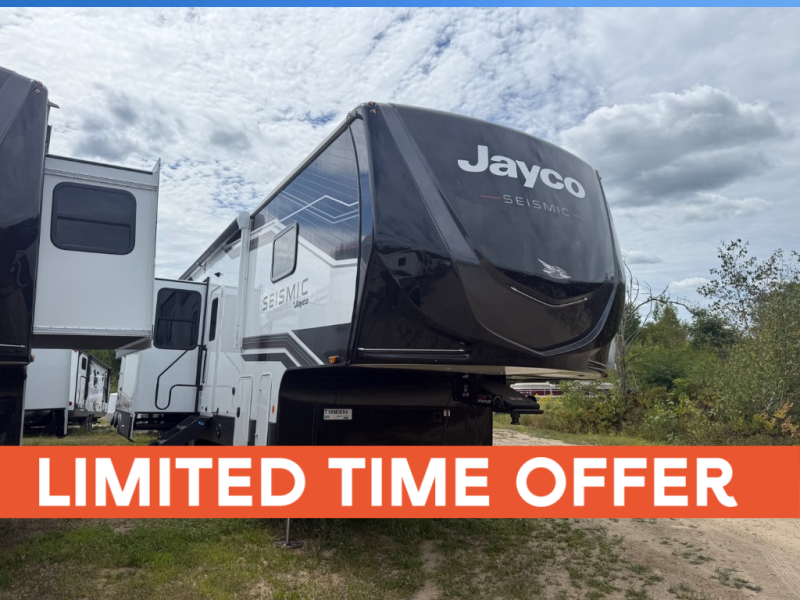 One look at the Seismic toy haulers by Jayco, and you'll never go back! Each model features a custom automotive-grade vinyl exterior graphics package, a painted fiberglass front cap with built-in LED lighting, and 102" wide-body structural steel I-beam construction. You'll find the pass-through storage with Slam-Latch baggage doors will make unpacking easier than ever, and the rear ramp door/patio with anti-slip, non-skid flooring will allow you to unload your toys with no trouble at all. These toy haulers feature a three seasons garage wall/doors, a 30 gallon fuel tank with a timer, and exterior marine-grade speakers to keep the party going. The Climate Shield zero degree tested weather protection includes a 35,000 BTU furnace, PEX plumbing, and a fully enclosed and heated underbelly so you can enjoy your adventures year around. And we haven't even touched on the interior luxuries you'll find, like solid hardwood cabinet doors, residential vinyl flooring made in the USA, night shades, and more!