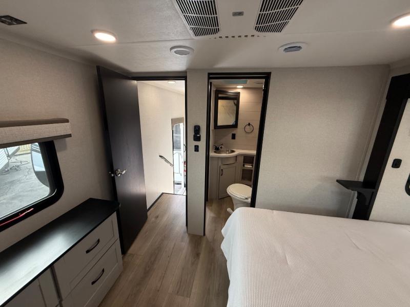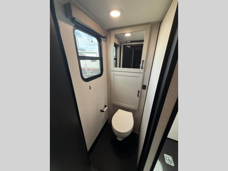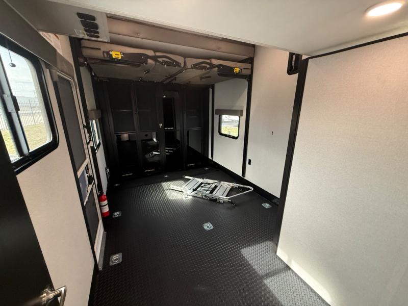 Get ready for outdoor adventures in this spacious toy hauler. Your guests will have the 13' 6" garage with queen bed with convertible sofa and a loft for added sleeping space, plus there is overhead storage for your things and a side man door to come and go easily. The main living area includes dual opposing slides with an L-shaped tri-fold sofa along the roadside and your dinette and refrigerator plus pantry in the curbside slide. Head up the steps to your front private bedroom with the dual entry bath accessible from the hall and inside the master bedroom. Here you will all enjoy a walk-in shower, toilet, and vanity with a sink, plus overhead storage. The bedroom features a third slide out housing a queen bed for added floor space, plus a full front walk-in closet, a dresser, and washer/dryer prep!