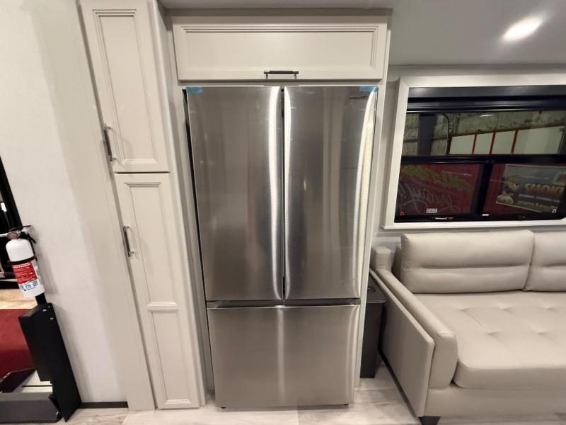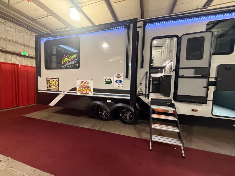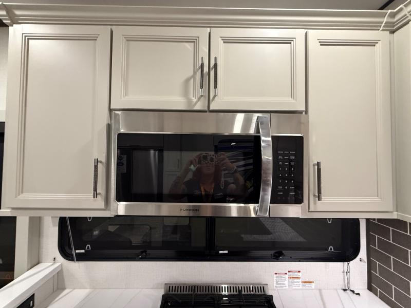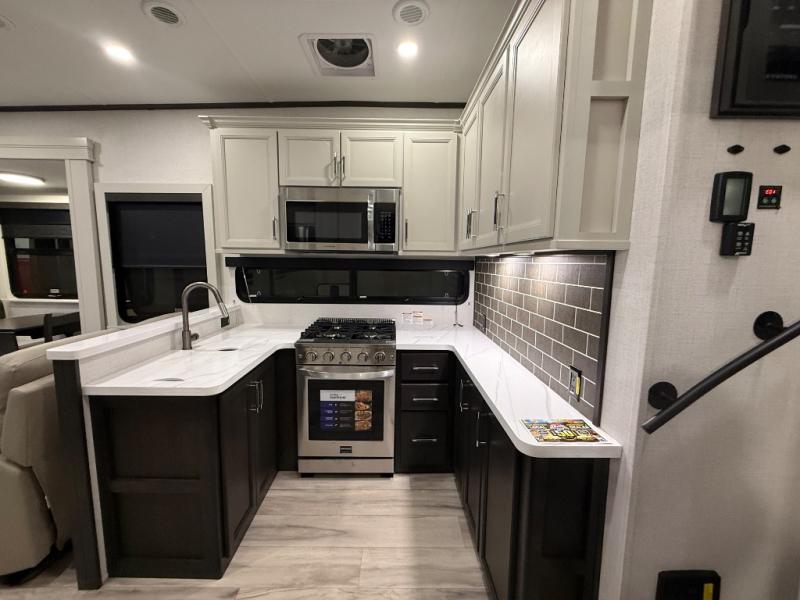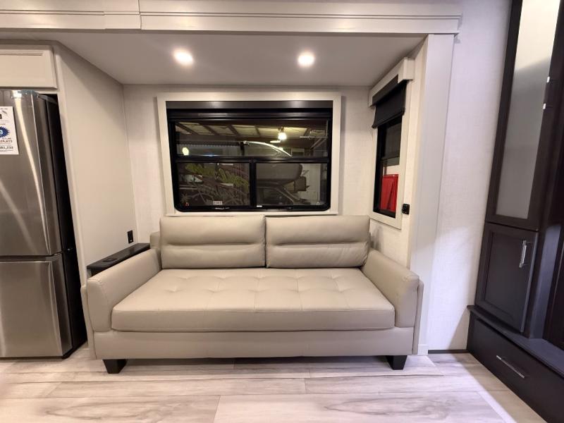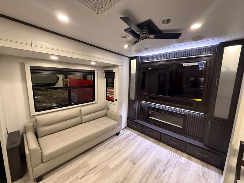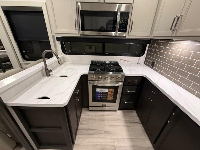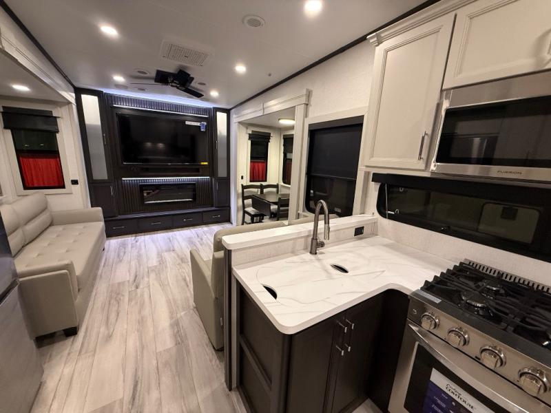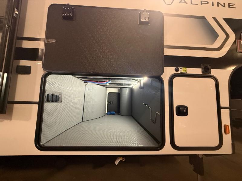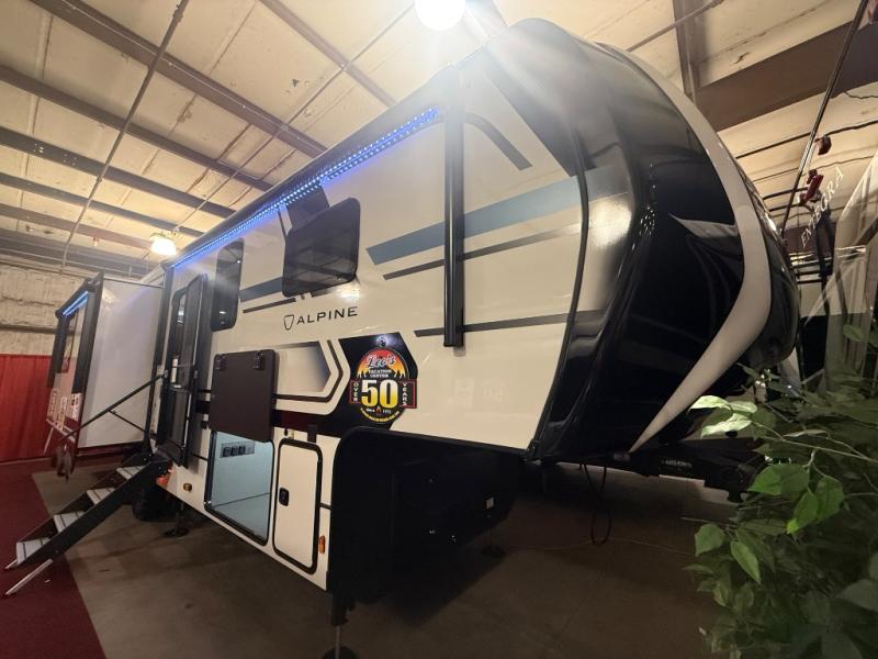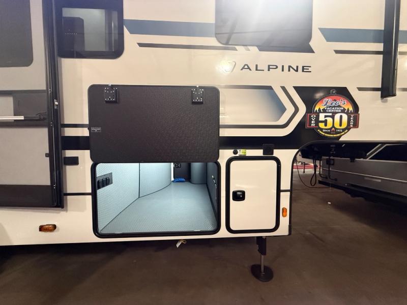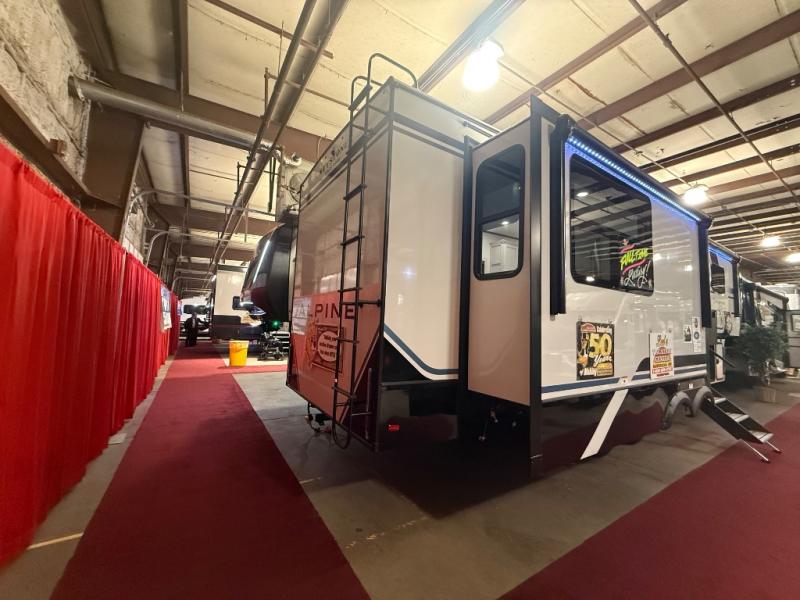 A great coach for an adventurous couple that loves to travel. This Alpine fifth wheel features wide open spaces thanks to triple slides with dual opposing slides in the main combined living and kitchen area. A center island with a sink is great for prep work, and you can easily entertain and have overnight guests with a hide-a-bed sofa sleeper. There is an entertainment center with a fireplace to enjoy when inside, and theater seating opposite for movie night. The chef will appreciate the full kitchen with an 18 cu. ft. residential refrigerator, a range hood, plus a convection microwave and a pull-out countertop to prep meals. Head up to the master suite which features a dual entry bath including a linen cabinet and large shower, plus a king bed that slides out and includes storage space underneath for extra blankets. There is also a master closet, a dresser with a Smart HDTV, and stackable washer and dryer prep if you plan to go full-time!