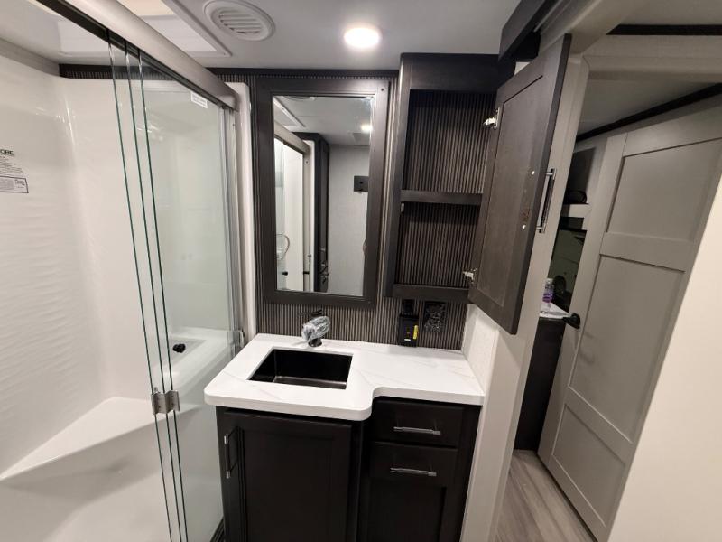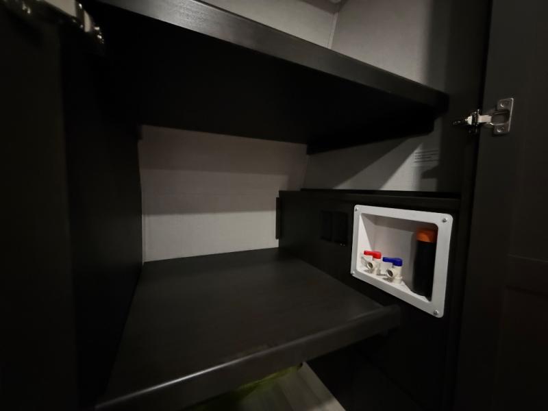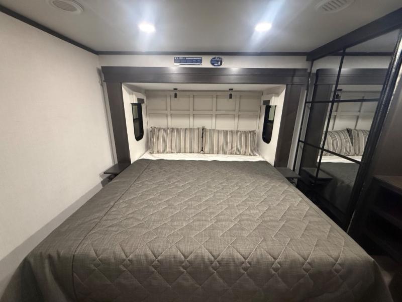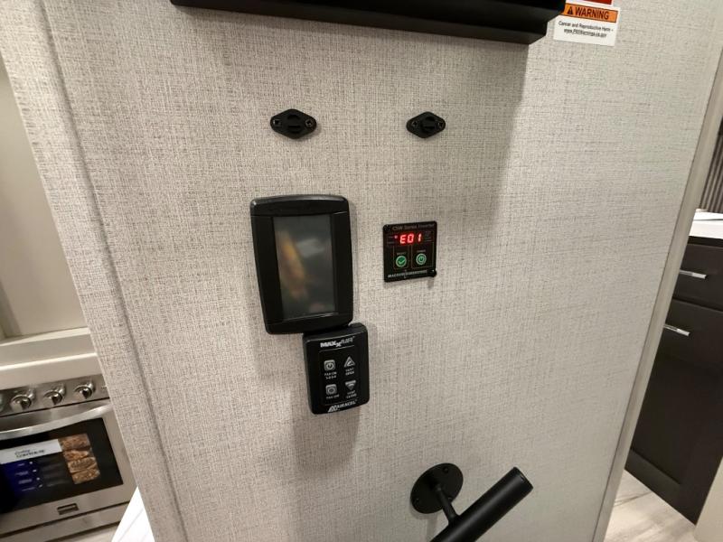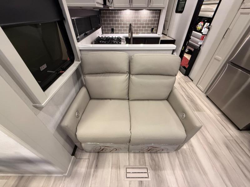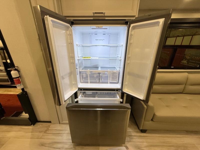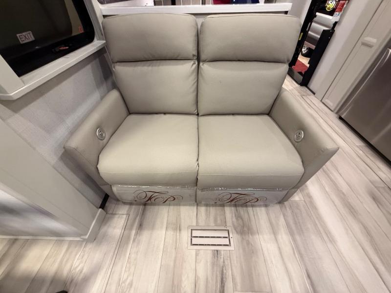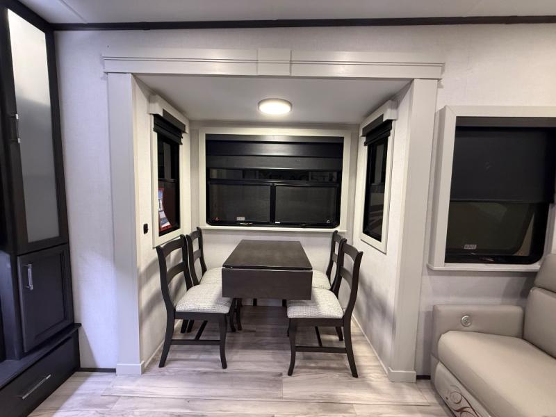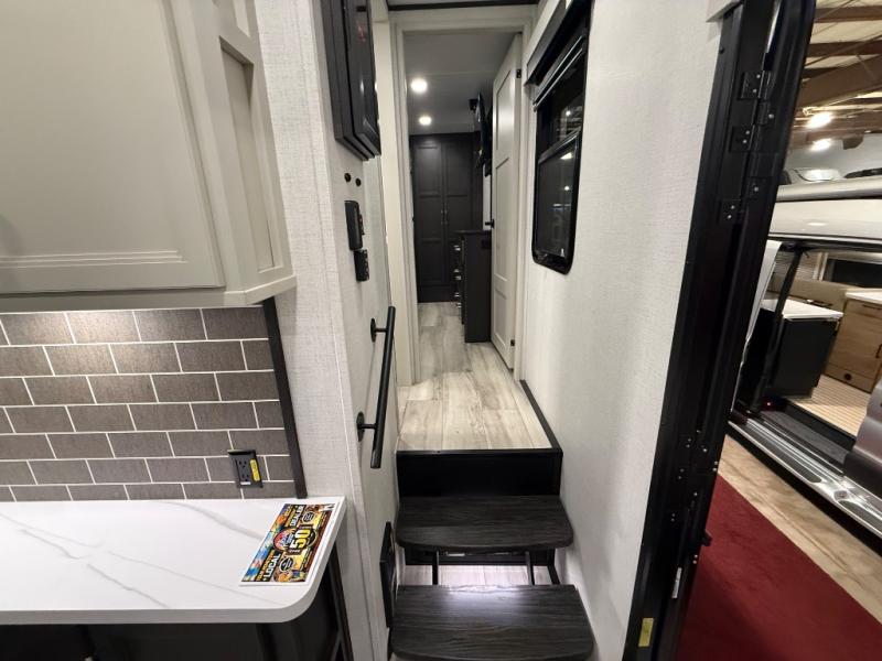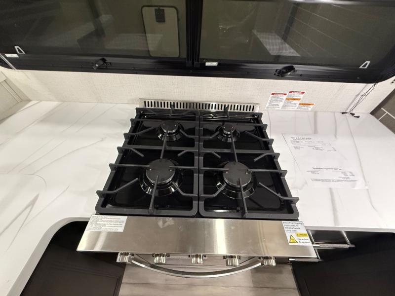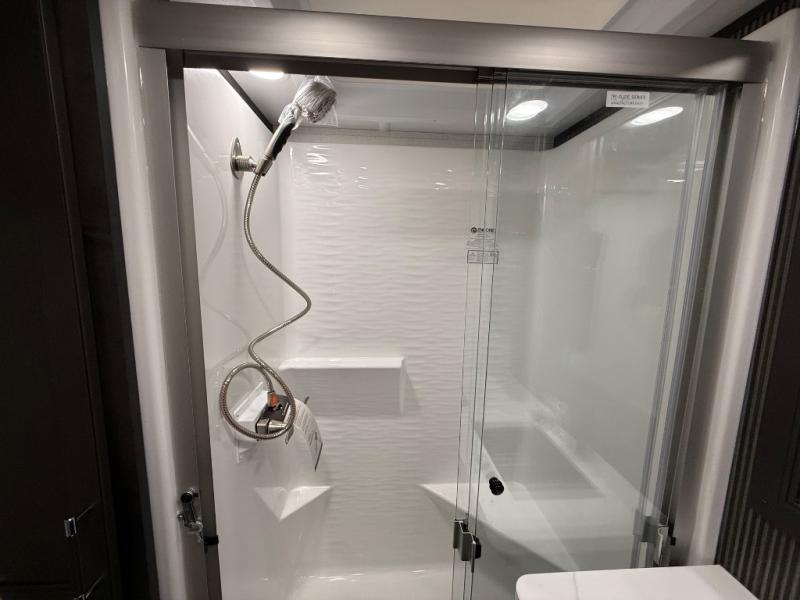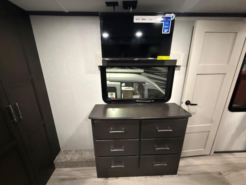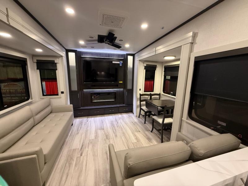 A great coach for an adventurous couple that loves to travel. This Alpine fifth wheel features wide open spaces thanks to triple slides with dual opposing slides in the main combined living and kitchen area. A center island with a sink is great for prep work, and you can easily entertain and have overnight guests with a hide-a-bed sofa sleeper. There is an entertainment center with a fireplace to enjoy when inside, and theater seating opposite for movie night. The chef will appreciate the full kitchen with an 18 cu. ft. residential refrigerator, a range hood, plus a convection microwave and a pull-out countertop to prep meals. Head up to the master suite which features a dual entry bath including a linen cabinet and large shower, plus a king bed that slides out and includes storage space underneath for extra blankets. There is also a master closet, a dresser with a Smart HDTV, and stackable washer and dryer prep if you plan to go full-time!