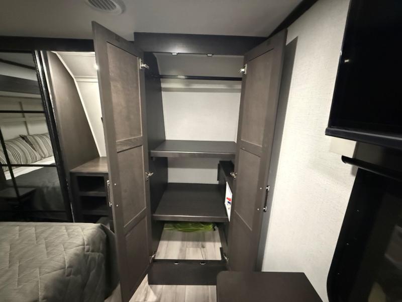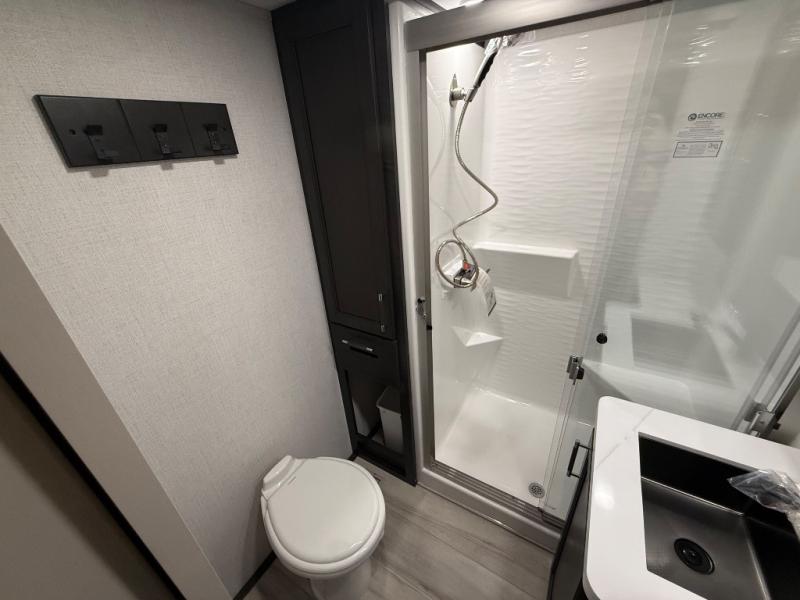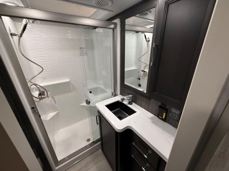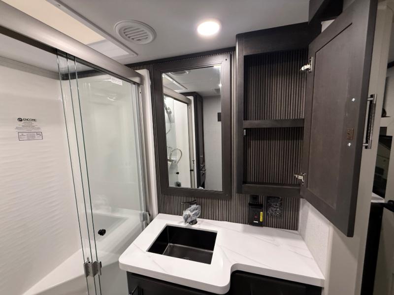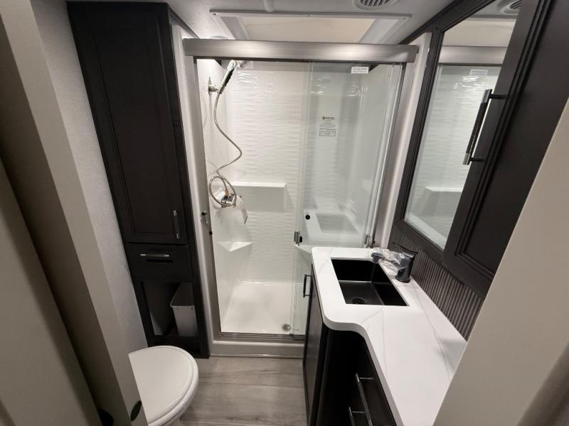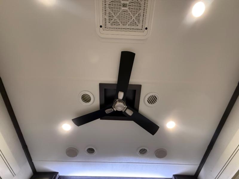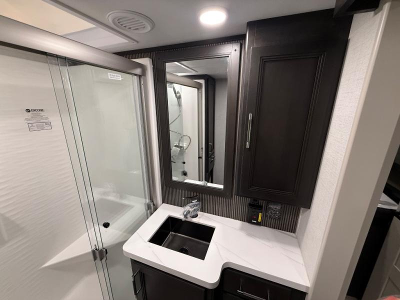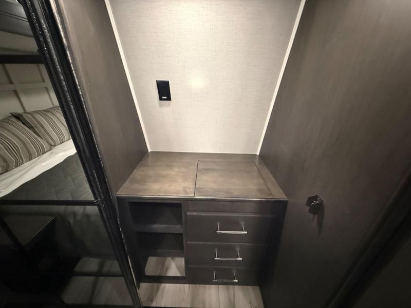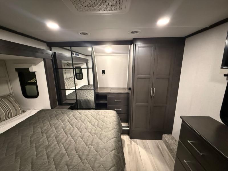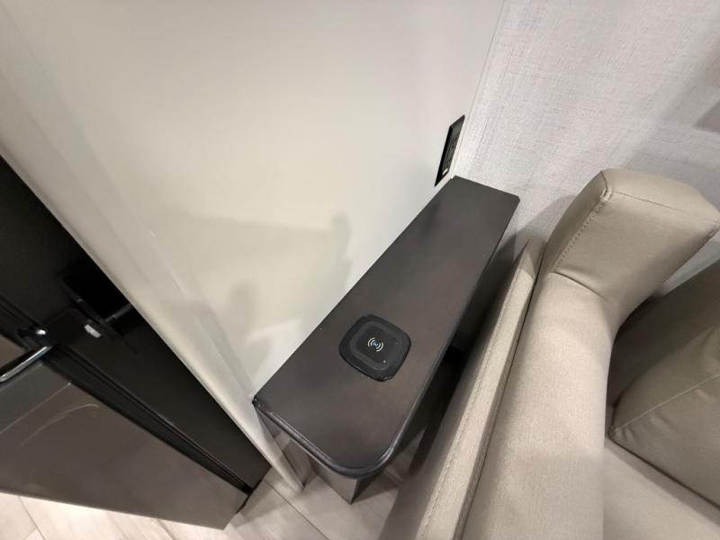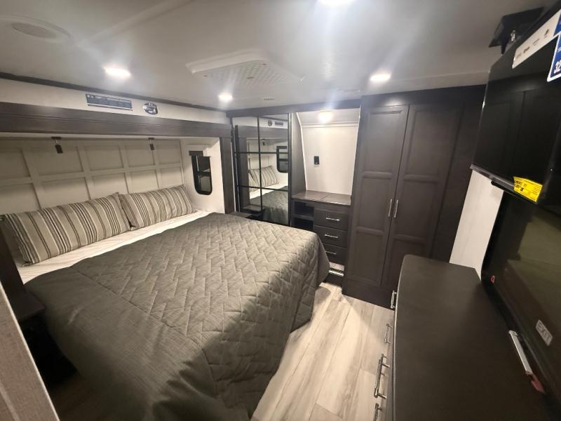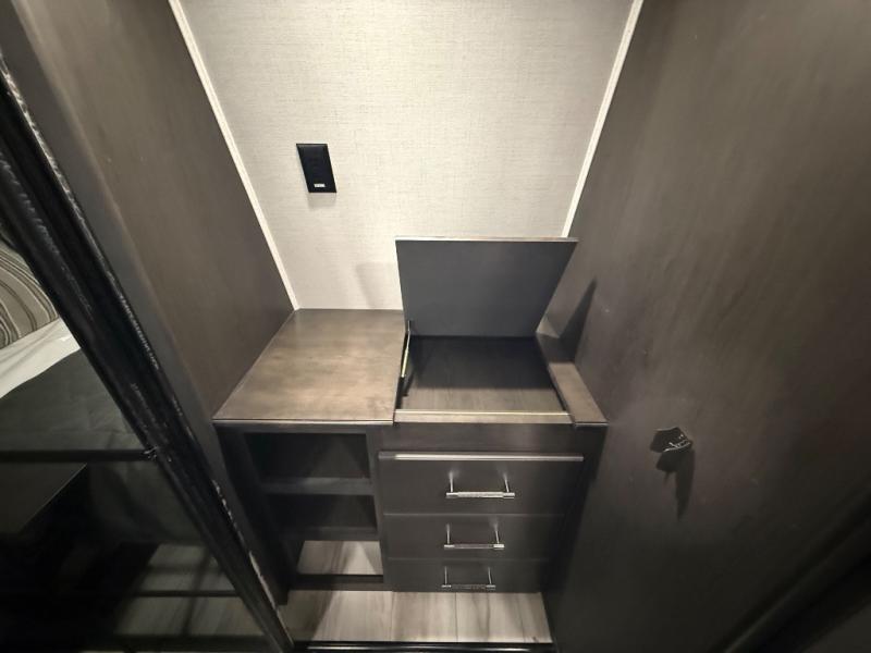 A great coach for an adventurous couple that loves to travel. This Alpine fifth wheel features wide open spaces thanks to triple slides with dual opposing slides in the main combined living and kitchen area. A center island with a sink is great for prep work, and you can easily entertain and have overnight guests with a hide-a-bed sofa sleeper. There is an entertainment center with a fireplace to enjoy when inside, and theater seating opposite for movie night. The chef will appreciate the full kitchen with an 18 cu. ft. residential refrigerator, a range hood, plus a convection microwave and a pull-out countertop to prep meals. Head up to the master suite which features a dual entry bath including a linen cabinet and large shower, plus a king bed that slides out and includes storage space underneath for extra blankets. There is also a master closet, a dresser with a Smart HDTV, and stackable washer and dryer prep if you plan to go full-time!
