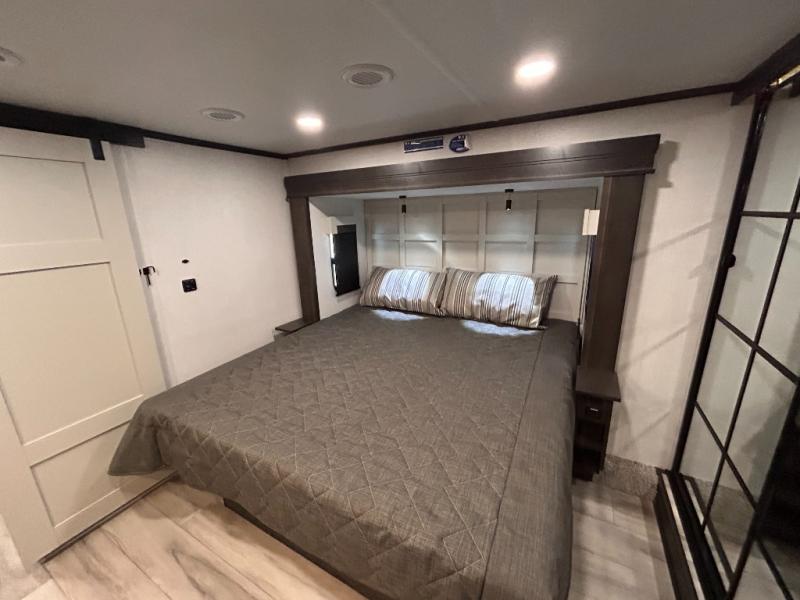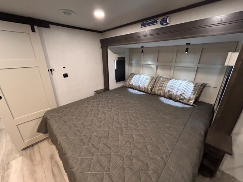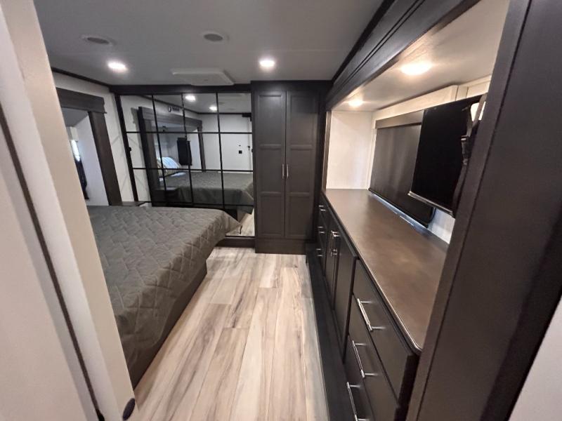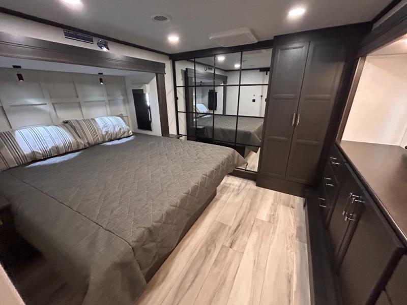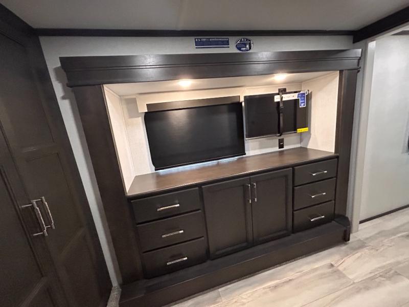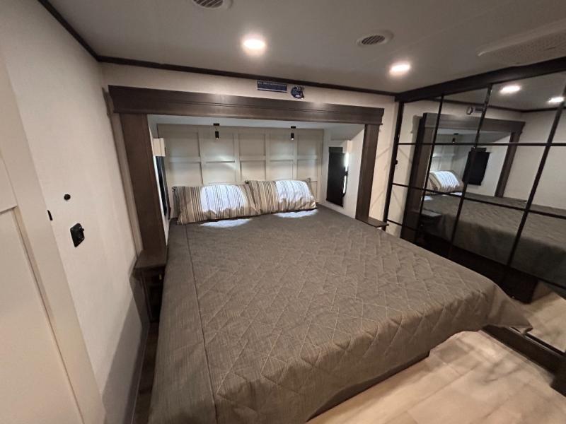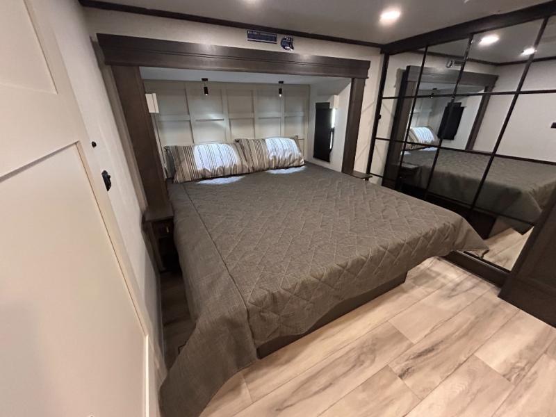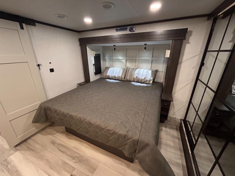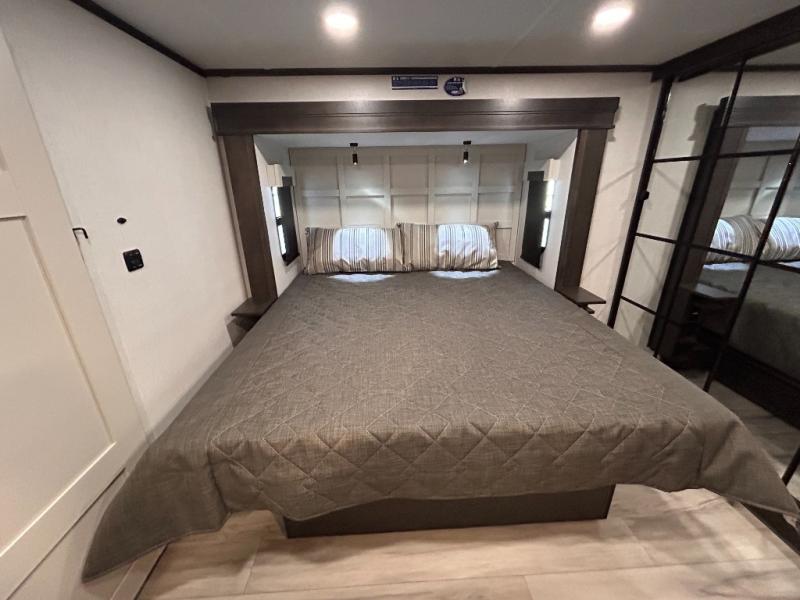 REAR LIVING/ AUTO LEVELING / KING BED / TRIPLE A/C PACKAGE / DUAL VANITY SINK/ TCS COIL SPRING/ SLIDE TOPPERS/ 440W SOLAR & 2000W INVERTER!!