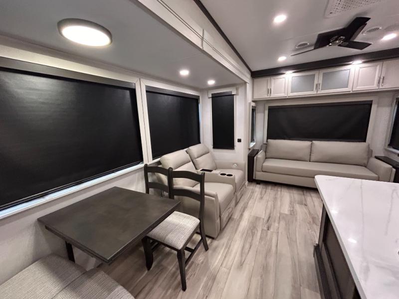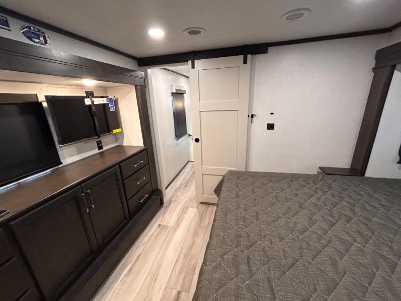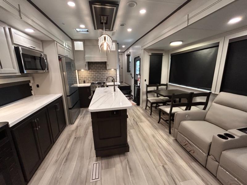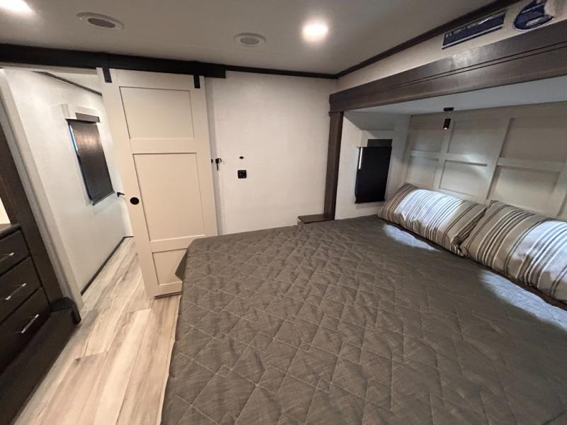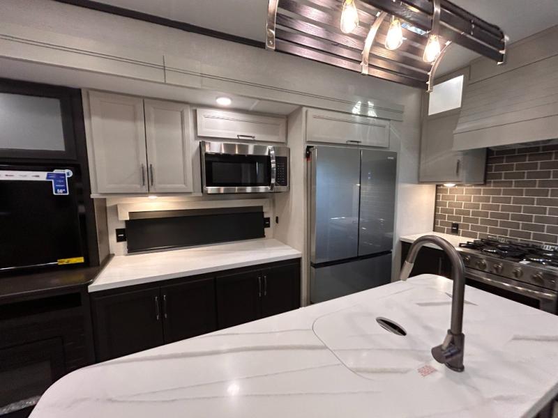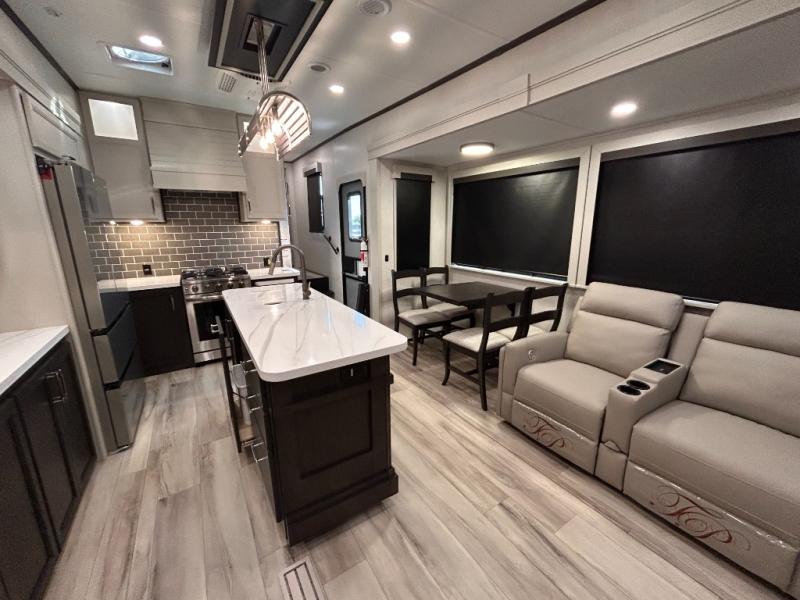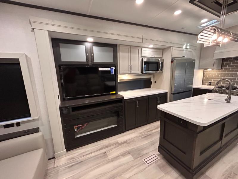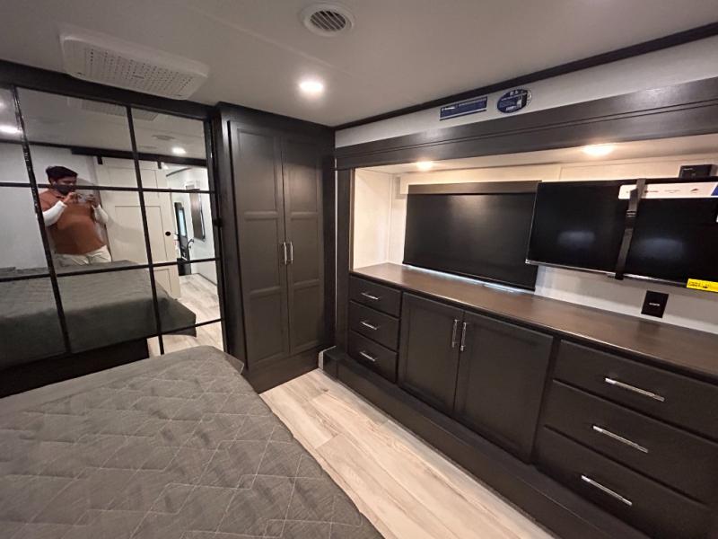 REAR LIVING/ AUTO LEVELING / KING BED / TRIPLE A/C PACKAGE / DUAL VANITY SINK/ TCS COIL SPRING/ SLIDE TOPPERS/ 440W SOLAR & 2000W INVERTER!!