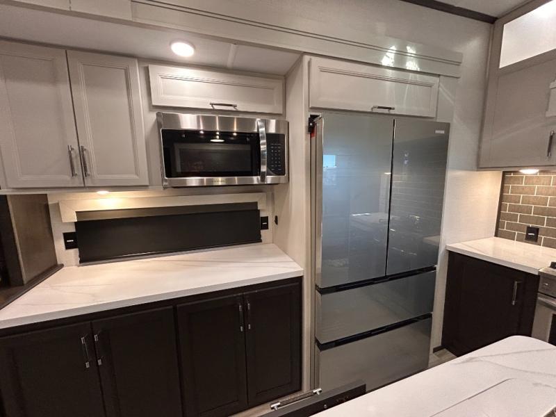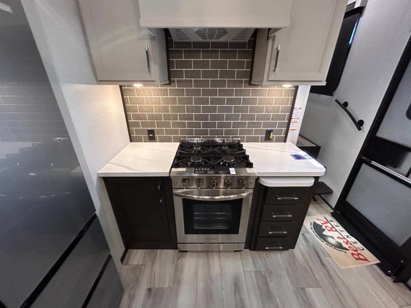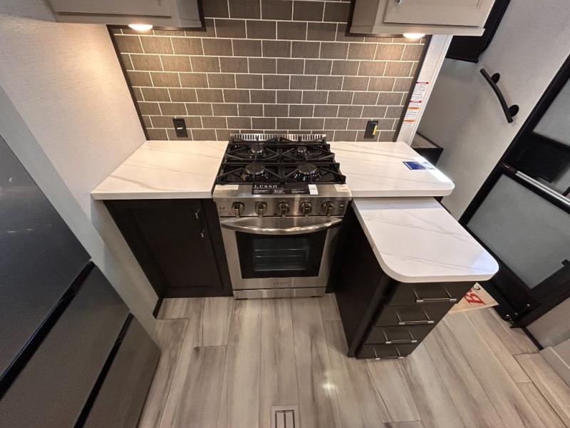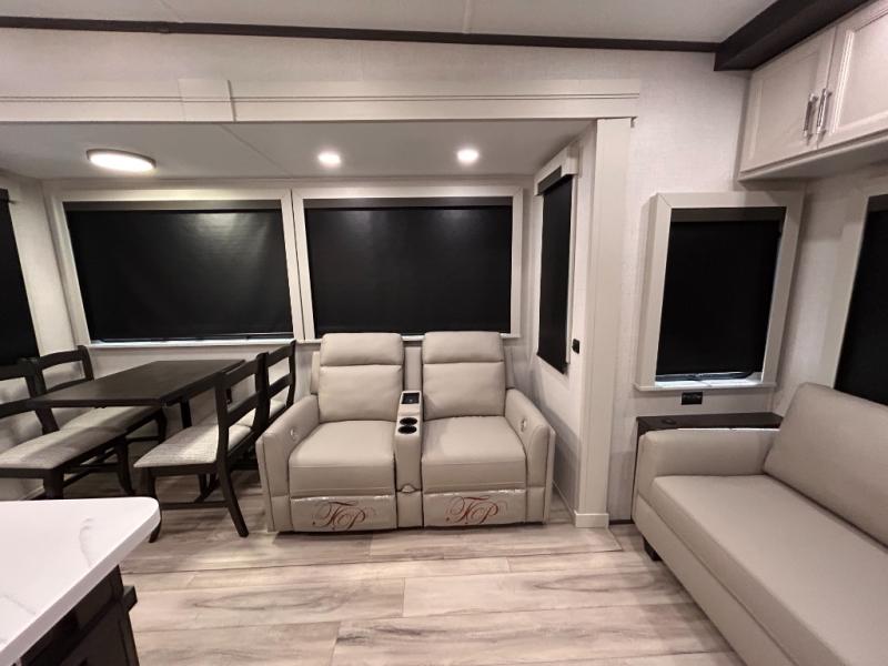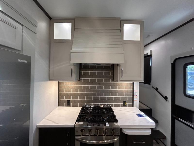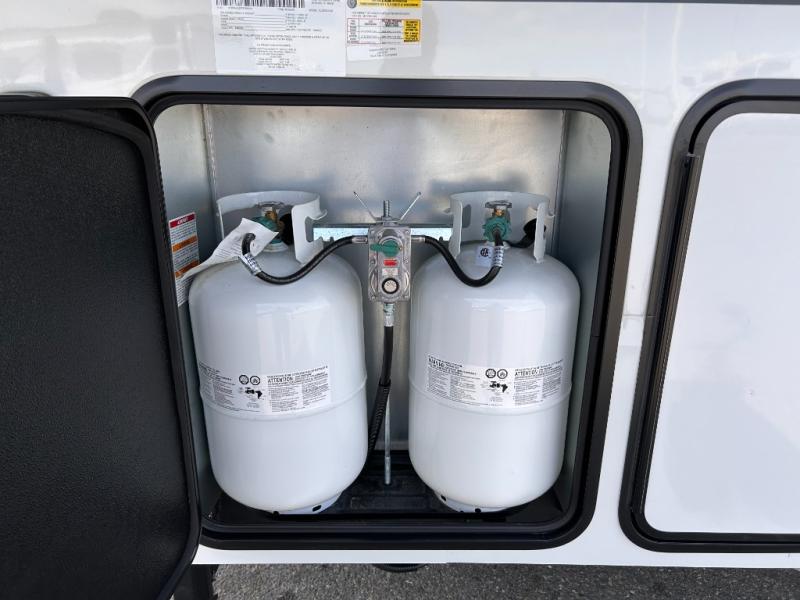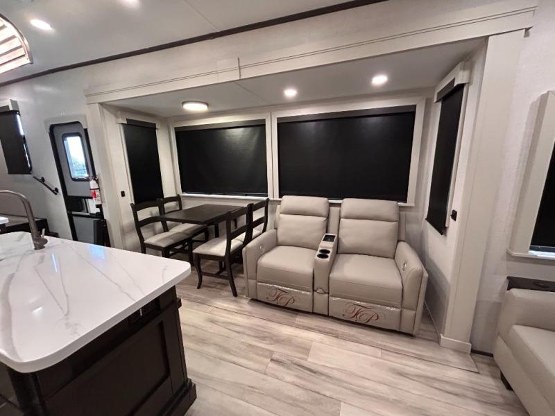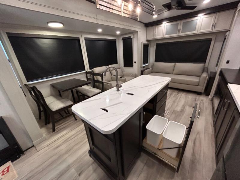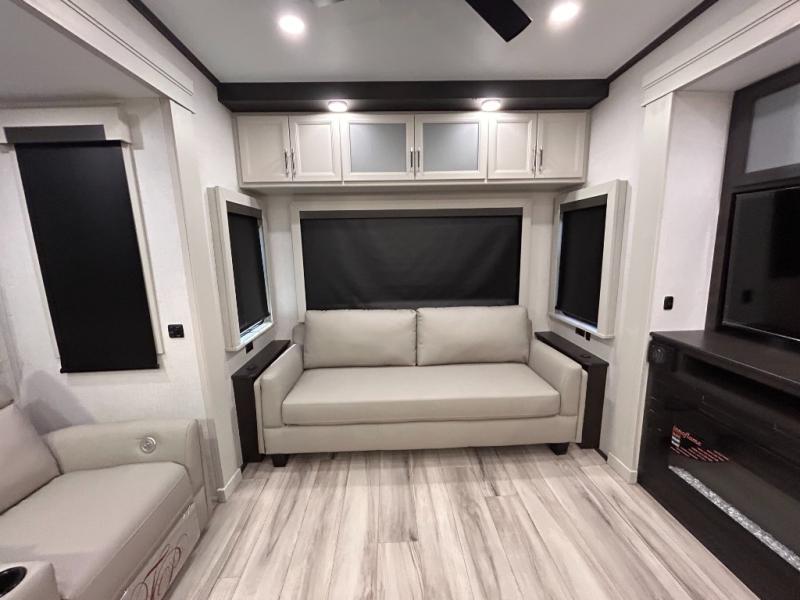 REAR LIVING/ AUTO LEVELING / KING BED / TRIPLE A/C PACKAGE / DUAL VANITY SINK/ TCS COIL SPRING/ SLIDE TOPPERS/ 440W SOLAR & 2000W INVERTER!!