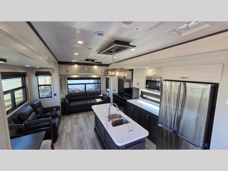 You will feel right at home camping in this fifth wheel! The chef will have lots of countertop space to prepare their best meals along with a kitchen island, two pull-out pantries to store your dishes, and an 18 cu. ft. residential refrigerator to store any leftovers. The free standing dinette offers a comfortable place to enjoy your meals, and the theater seating across from the fireplace and entertainment center will be perfect for movie nights. There is also a rear hide-a-bed sofa sleeper for any guests you may have. You will love the full bath that includes a shower with a seat, a linen closet, plus two bath sinks for convenience. And don't overlook the front bedroom with a sliding door, king bed slide out, and master closet for all your things. You'll also find stackable washer and dryer prep, two drawers, and a Smart HDTV for movies in bed.