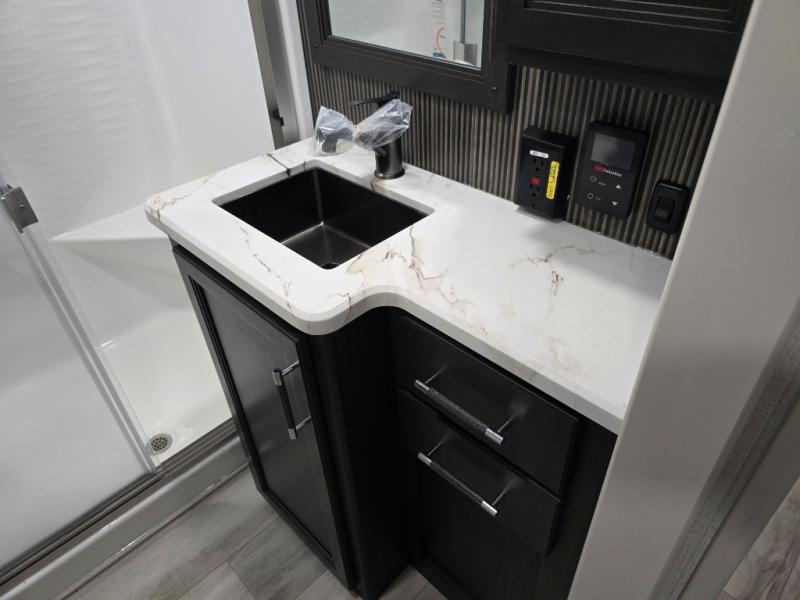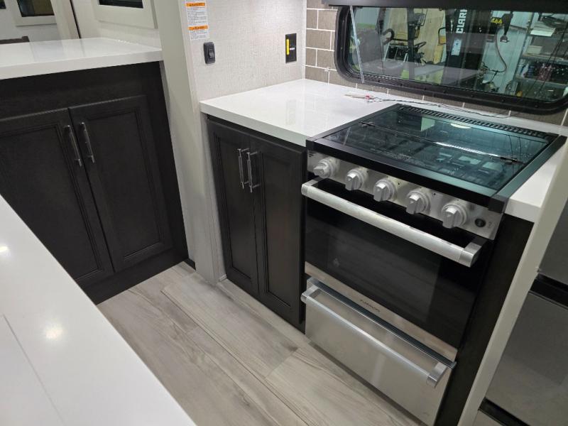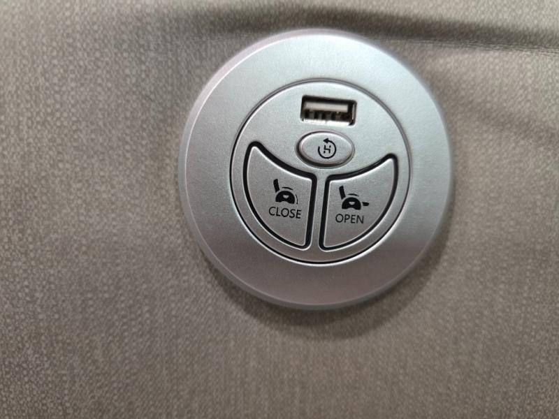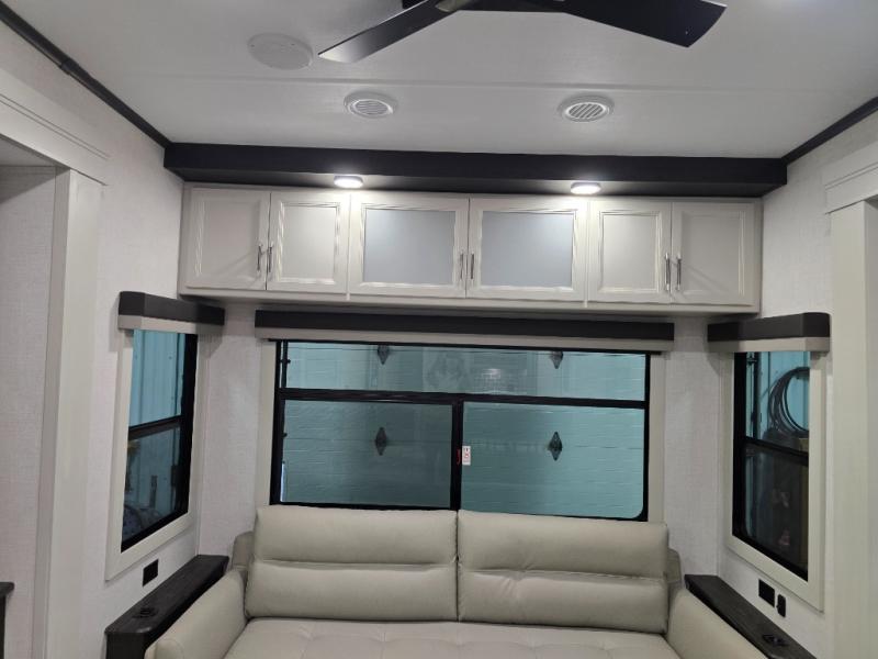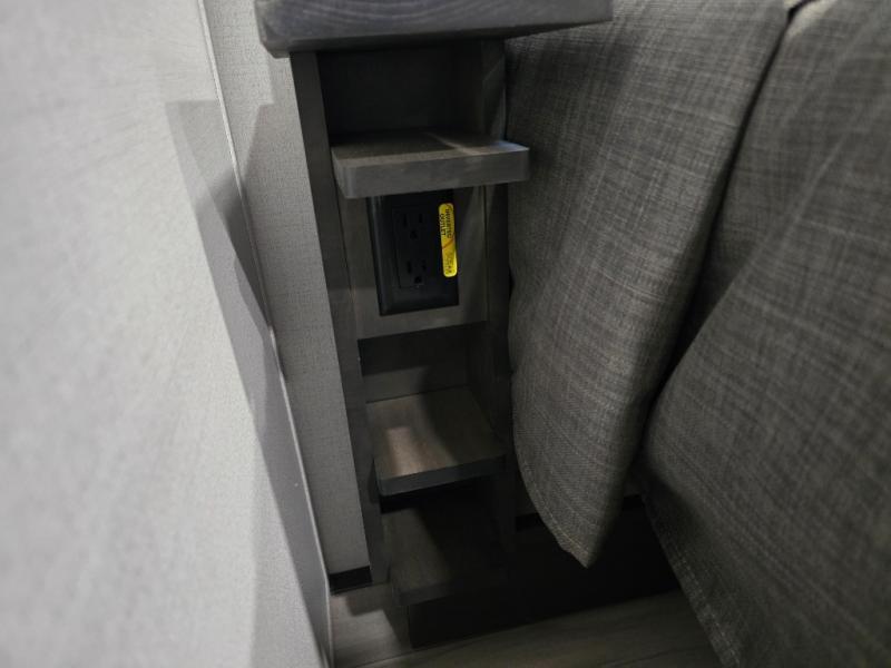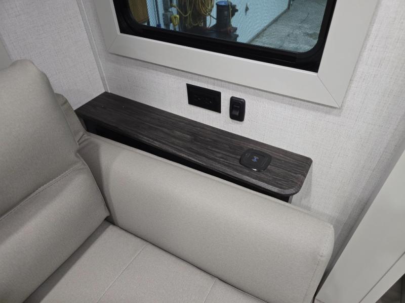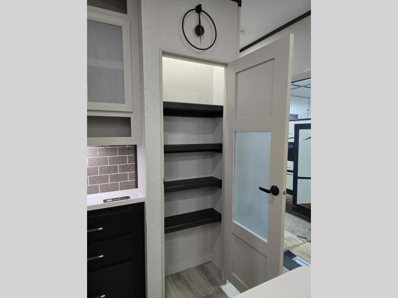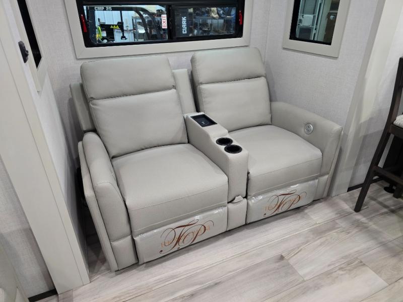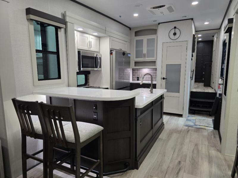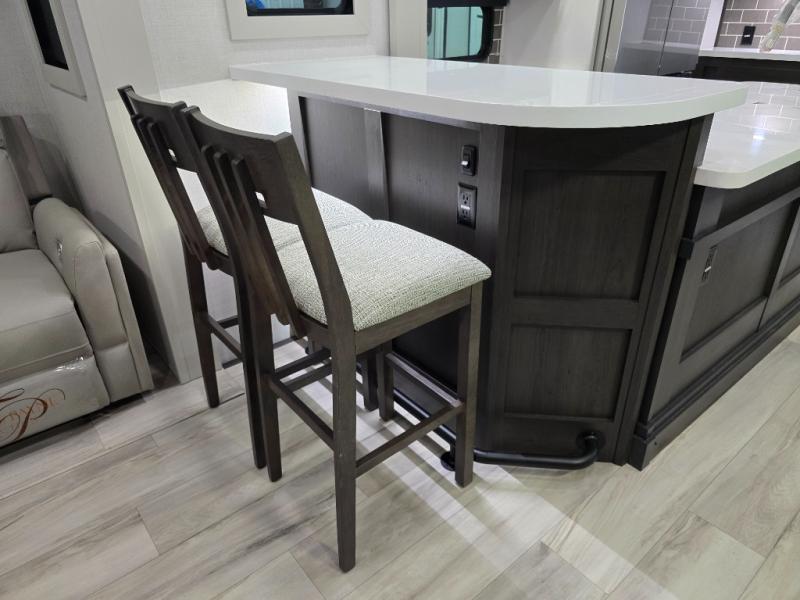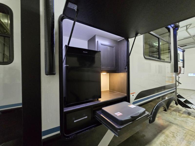 This grand kitchen offers the cook their own space to prepare and serve meals from the large L-shaped counter peninsula bar with stools, and the large pantry and curio will come in handy as well. Dining is also available at the free standing dinette with four chairs and some might even enjoy sitting on the hide-a-bed sofa sleeper. Also available for seating are the theater seats which are equipped with heat, massage, LED lights and USB charging. The master bedroom offers a king bed with storage underneath and additional wardrobe storage plus a space prepped for a washer/dryer option. Having a separate living area from the kitchen gives everyone room to spread out, and outside there are two power awnings offering additional outdoor living areas protected from the elements. The cook will enjoy the outside Grill-n-Chill outside kitchen as well.