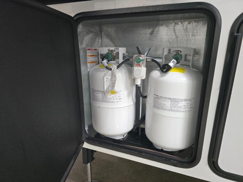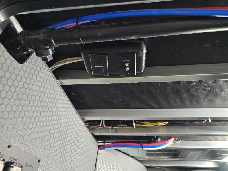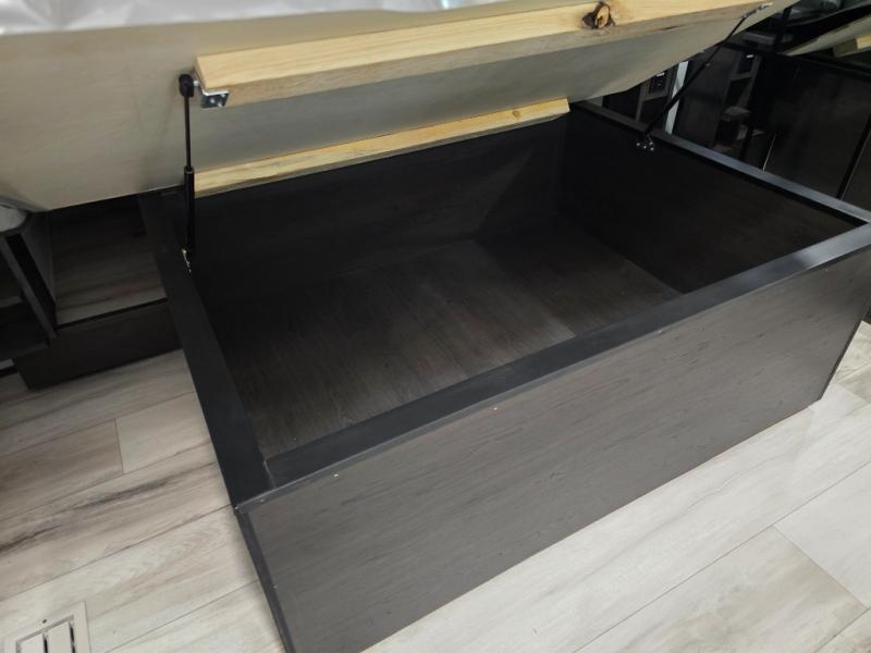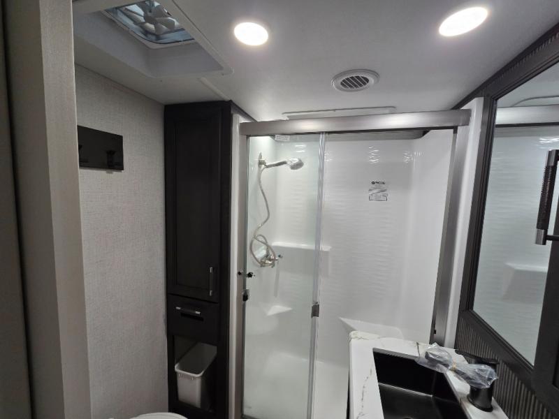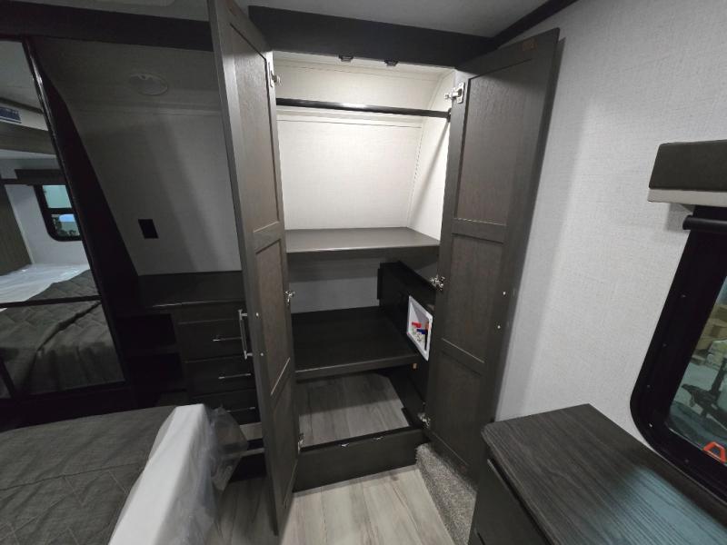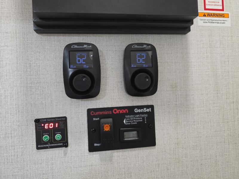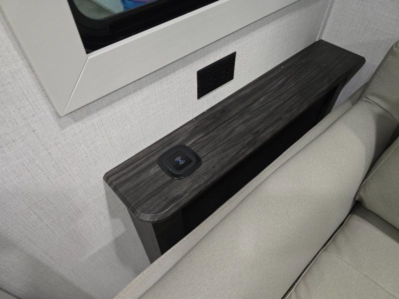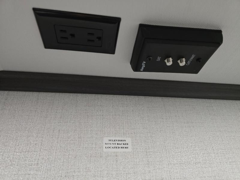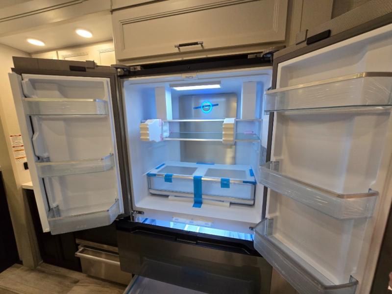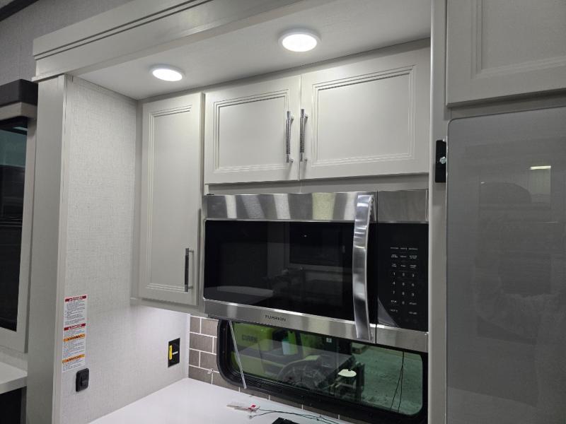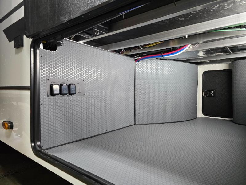 This grand kitchen offers the cook their own space to prepare and serve meals from the large L-shaped counter peninsula bar with stools, and the large pantry and curio will come in handy as well. Dining is also available at the free standing dinette with four chairs and some might even enjoy sitting on the hide-a-bed sofa sleeper. Also available for seating are the theater seats which are equipped with heat, massage, LED lights and USB charging. The master bedroom offers a king bed with storage underneath and additional wardrobe storage plus a space prepped for a washer/dryer option. Having a separate living area from the kitchen gives everyone room to spread out, and outside there are two power awnings offering additional outdoor living areas protected from the elements. The cook will enjoy the outside Grill-n-Chill outside kitchen as well.