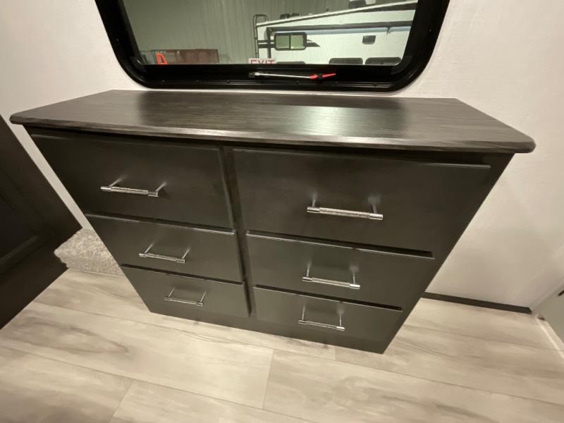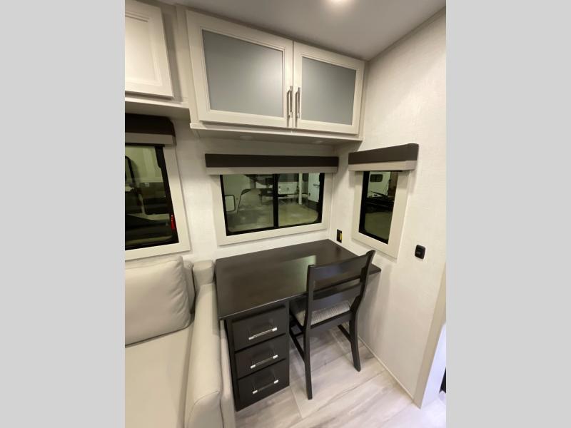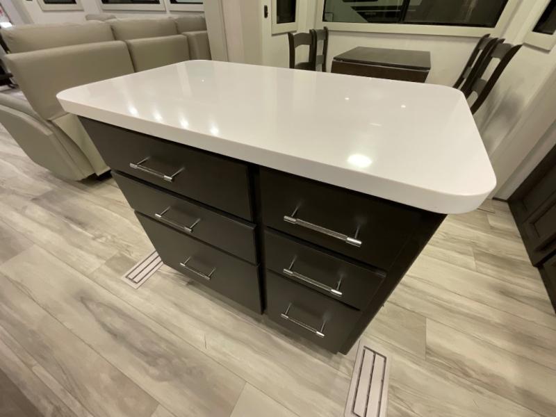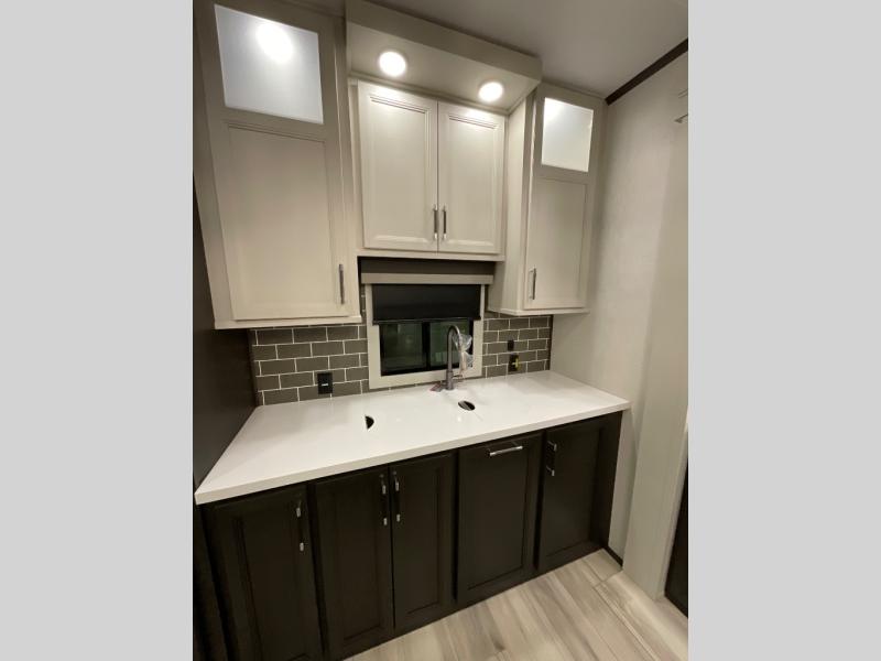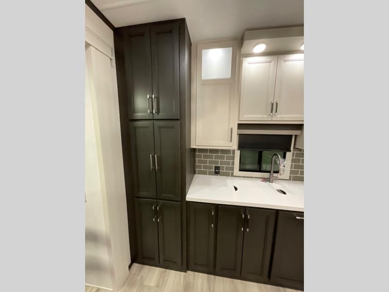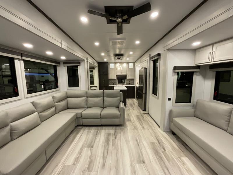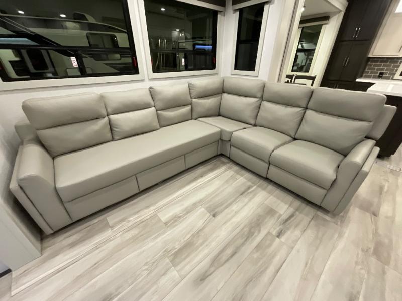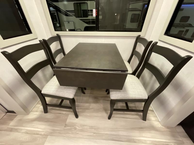 This rear kitchen fifth wheel makes extended stays or weekend trips to the lake enjoyable! The chef of your group will find plenty of counter space with the included kitchen island, plus there is a pantry and 18 cu. ft. residential refrigerator for food storage. A free-standing dinette provides a place to dine together, and the largest L-shaped sofa with recliners will be the perfect spot to relax with a movie. If you have guests, they could sleep here or on the hide-a-bed sofa sleeper. The dual entry bath includes a shower with a seat for added comfort, and the front master bedroom will feel just like home with its king bed slide out and master closet. There is also a dresser and stackable washer and dryer prep if you want to add those appliances!