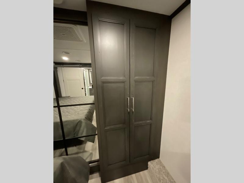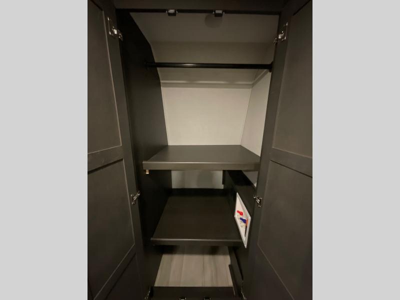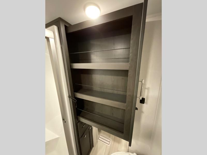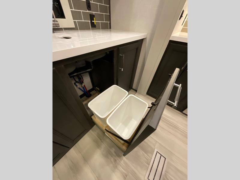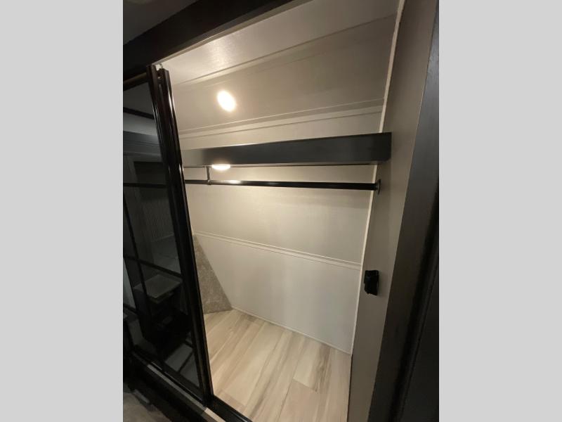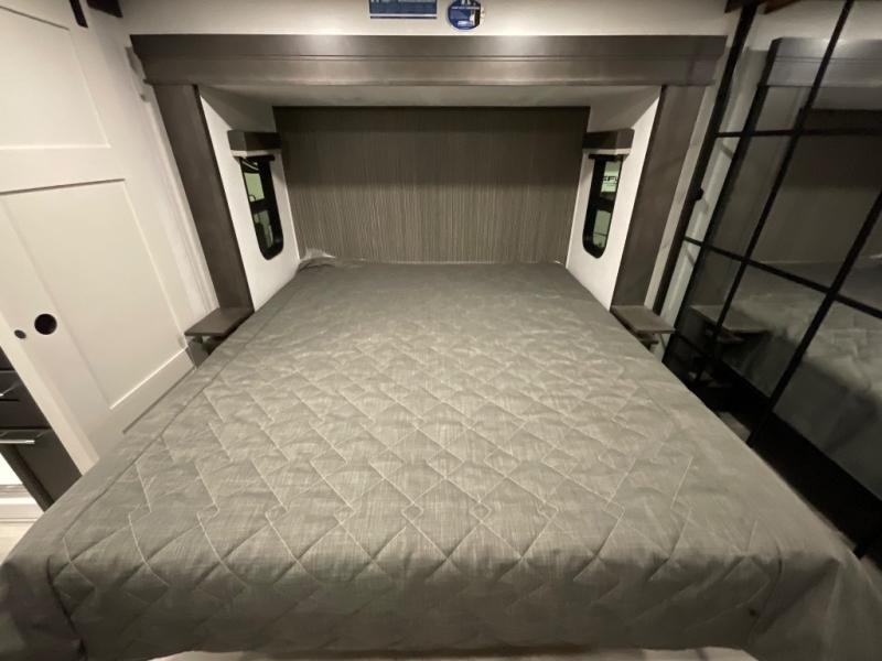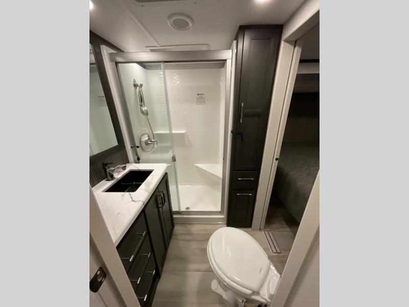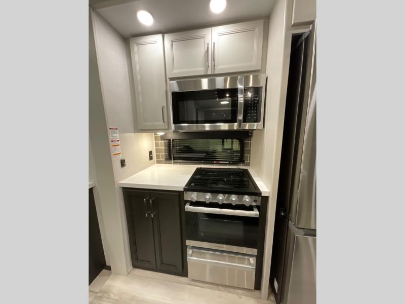 This rear kitchen fifth wheel makes extended stays or weekend trips to the lake enjoyable! The chef of your group will find plenty of counter space with the included kitchen island, plus there is a pantry and 18 cu. ft. residential refrigerator for food storage. A free-standing dinette provides a place to dine together, and the largest L-shaped sofa with recliners will be the perfect spot to relax with a movie. If you have guests, they could sleep here or on the hide-a-bed sofa sleeper. The dual entry bath includes a shower with a seat for added comfort, and the front master bedroom will feel just like home with its king bed slide out and master closet. There is also a dresser and stackable washer and dryer prep if you want to add those appliances!