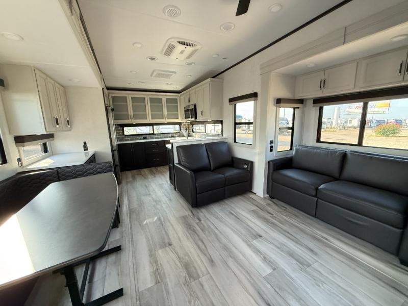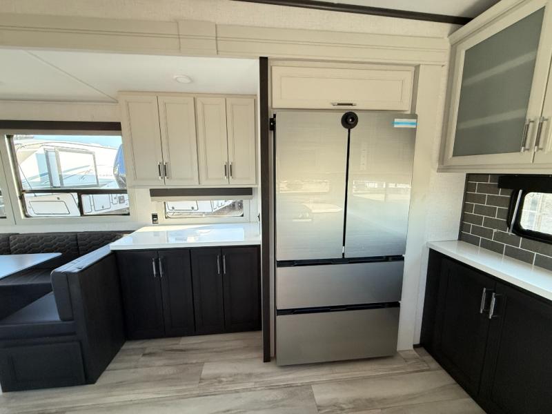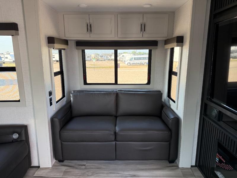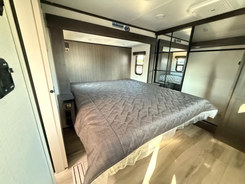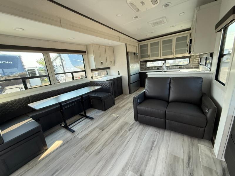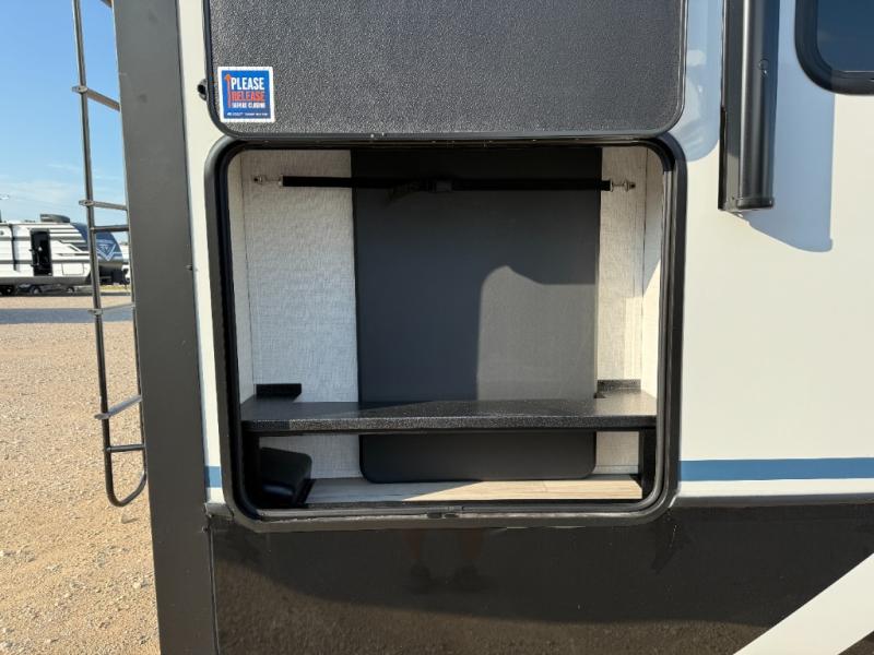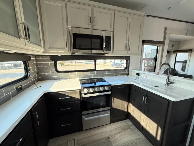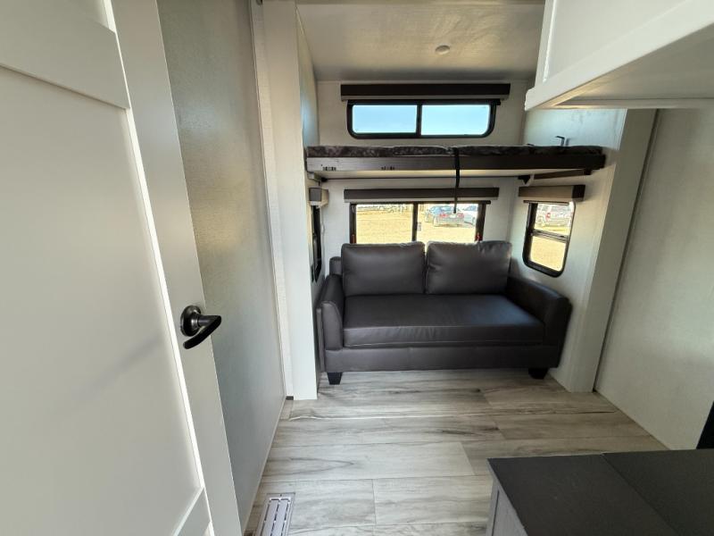 The whole gang will love camping in this fifth wheel since there is space for everyone! A front master bedroom includes a king bed slide out, master closet, and stackable washer and dryer prep if you choose to go full-time. Your guests or little ones will love the middle bunkhouse with a flip bunk above a hide-a-bed sofa, along with a pull-out table and storage space. Everyone can meet in the living area which features dual opposing slides for more space, theater seating, a sleeper sofa, and a U-shaped dinette, providing even more sleeping space. And check out the rear kitchen with its wrap-around counter space, Furrion appliances, and large pantry to keep snacks stocked!