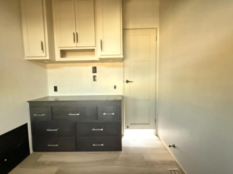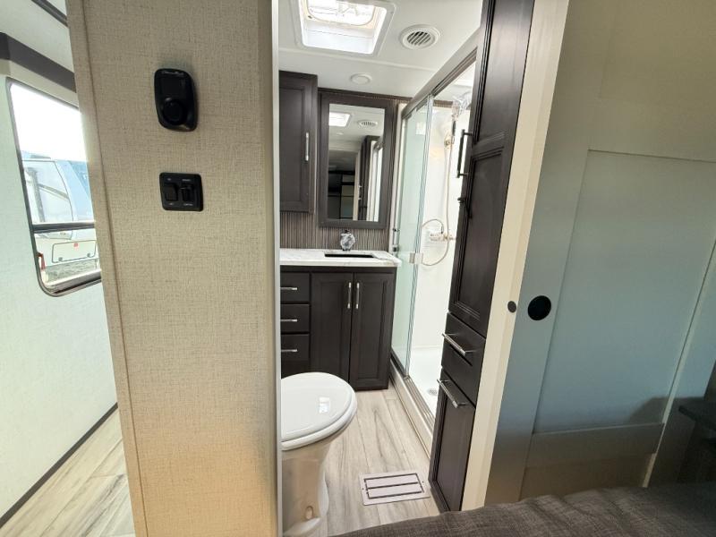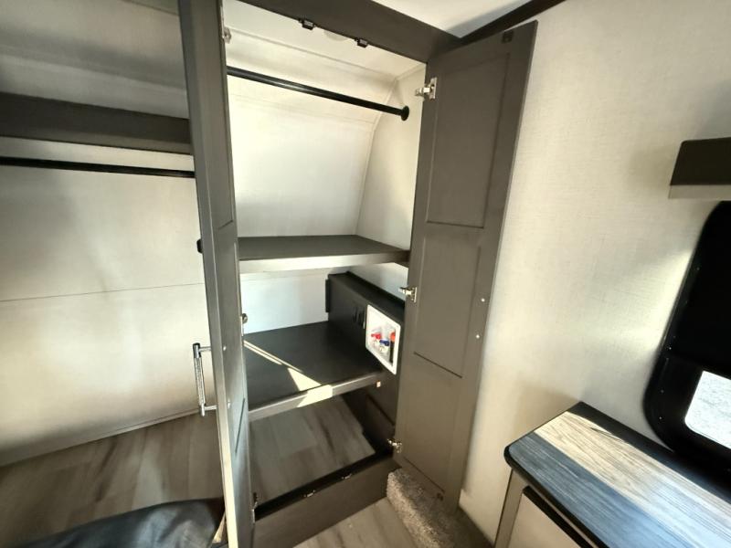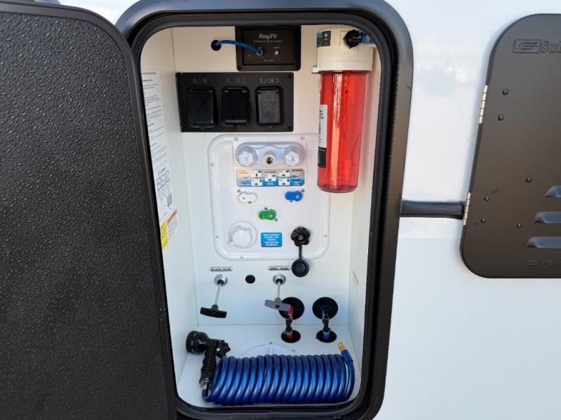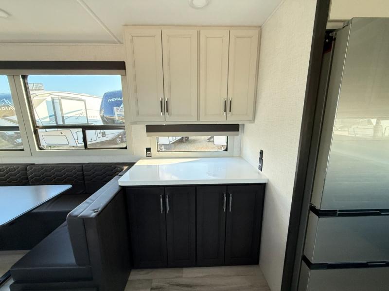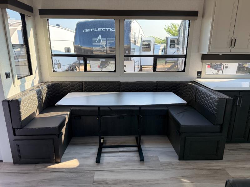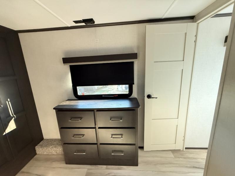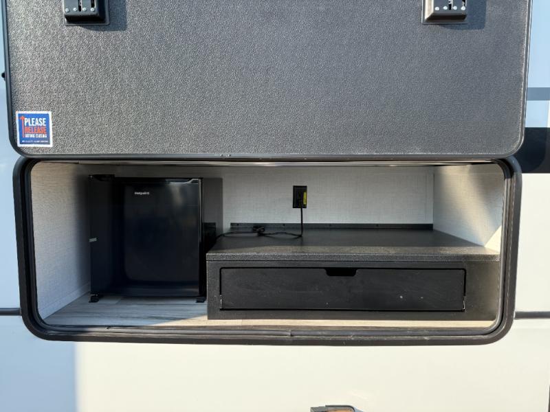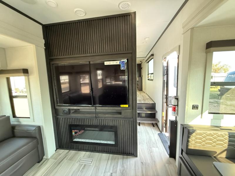 The whole gang will love camping in this fifth wheel since there is space for everyone! A front master bedroom includes a king bed slide out, master closet, and stackable washer and dryer prep if you choose to go full-time. Your guests or little ones will love the middle bunkhouse with a flip bunk above a hide-a-bed sofa, along with a pull-out table and storage space. Everyone can meet in the living area which features dual opposing slides for more space, theater seating, a sleeper sofa, and a U-shaped dinette, providing even more sleeping space. And check out the rear kitchen with its wrap-around counter space, Furrion appliances, and large pantry to keep snacks stocked!