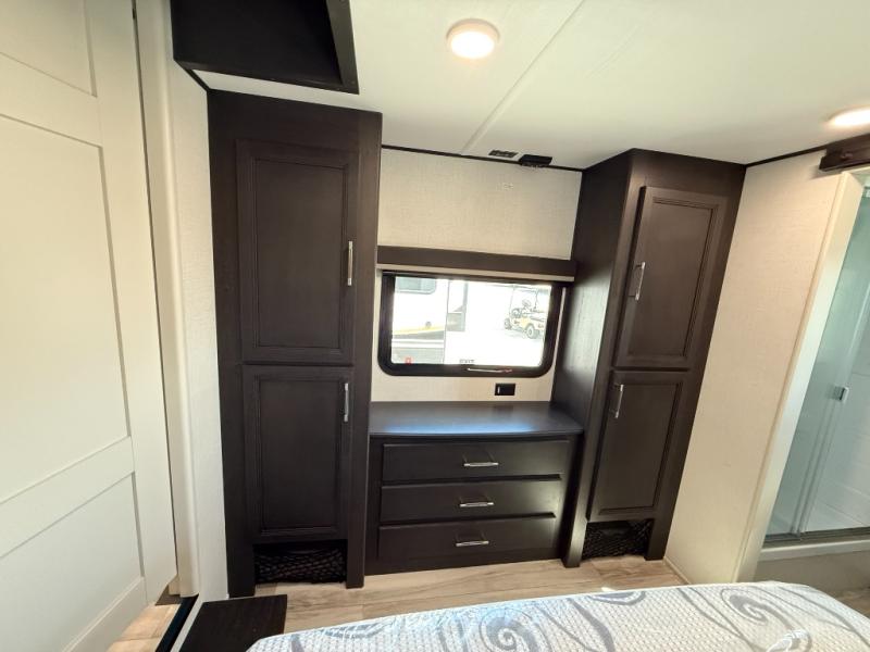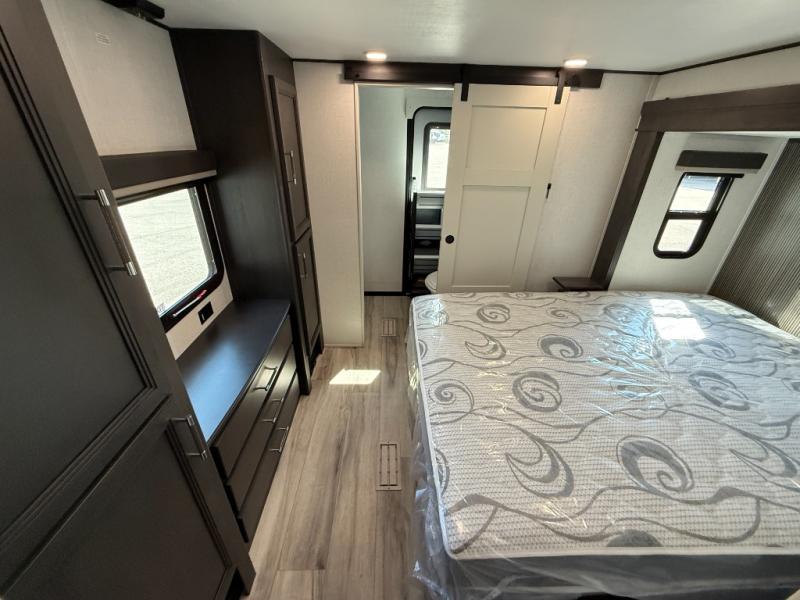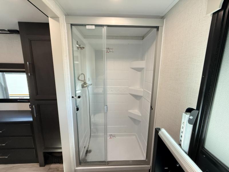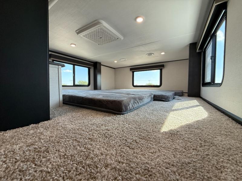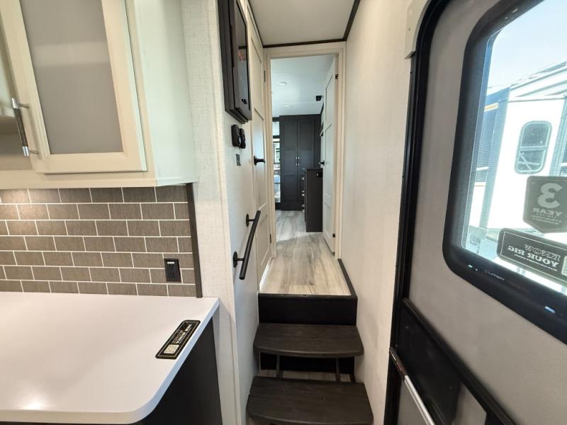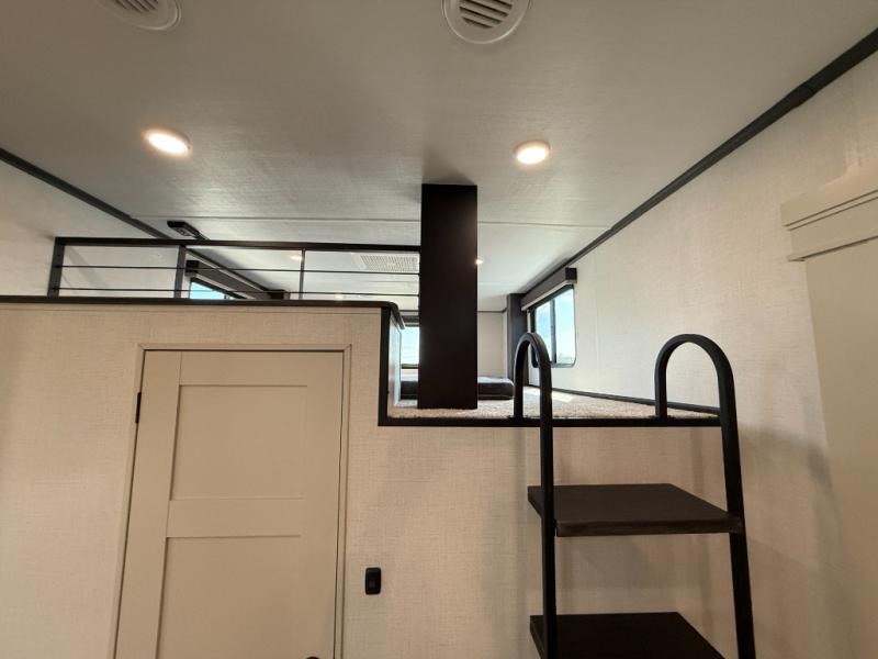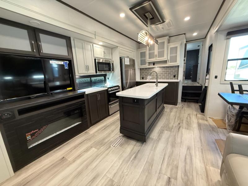 Get ready for family fun in this fifth wheel offering a front master bedroom with a king-size bed slide, plus a second master bedroom for your guests! The second bedroom includes a queen-size bed slide, a loft above the bedroom that sleeps three more, plus a rear full bathroom including a unique rear entry/exit door. And both entrances include the LCl SolidStep. The main living and kitchen area offers dual opposing slides and include theater seating, a free standing dinette, a fireplace, a center island and full kitchen amenities to feed your entire crew.