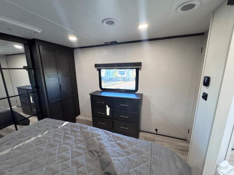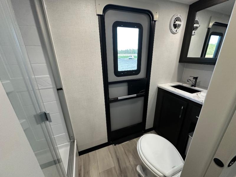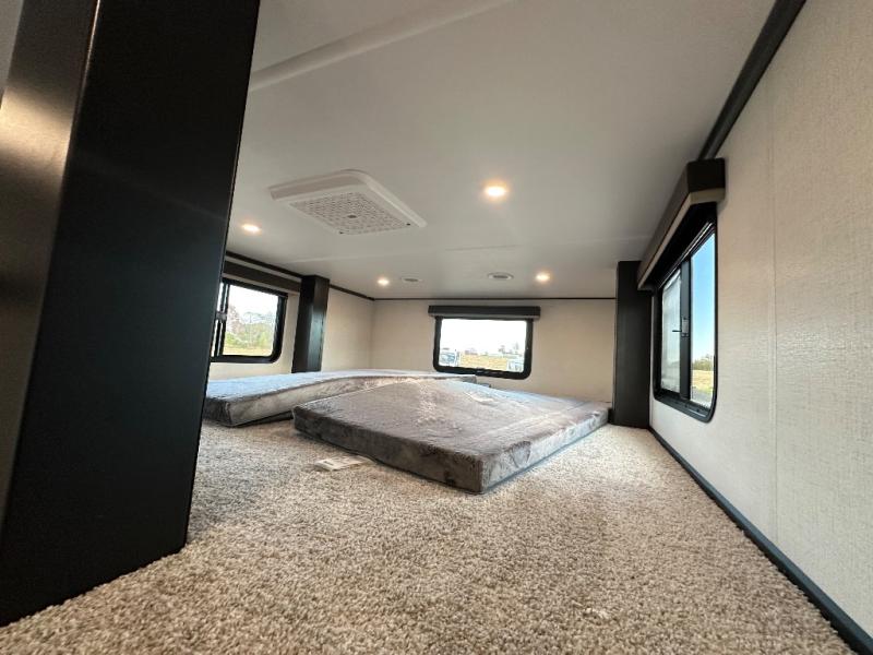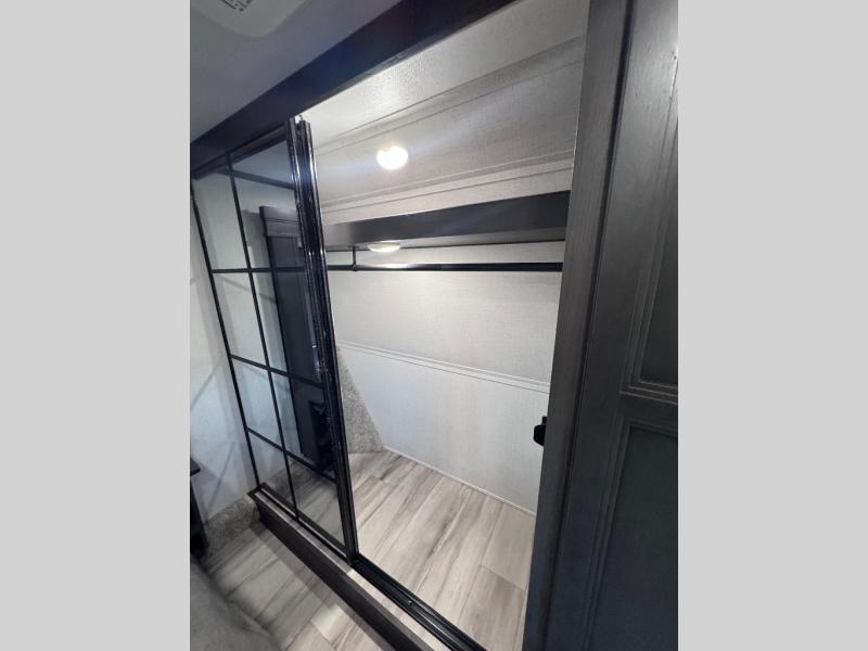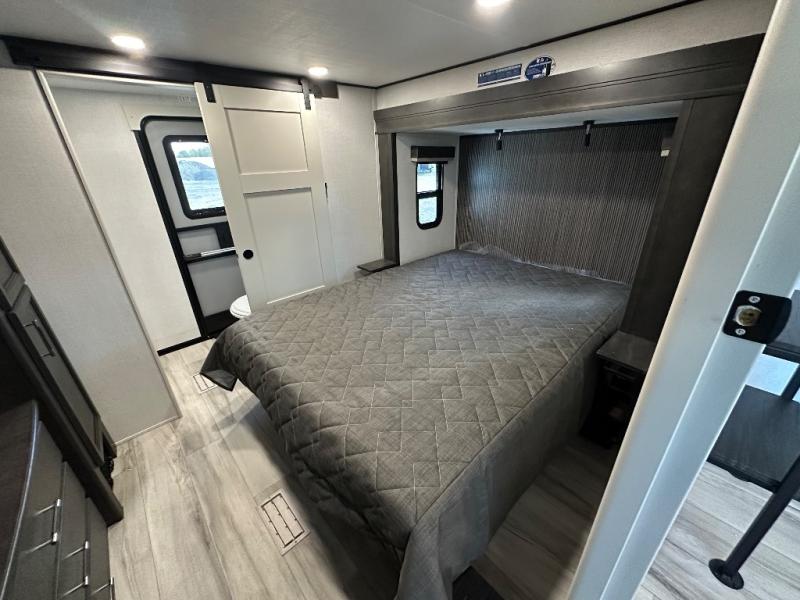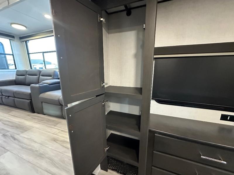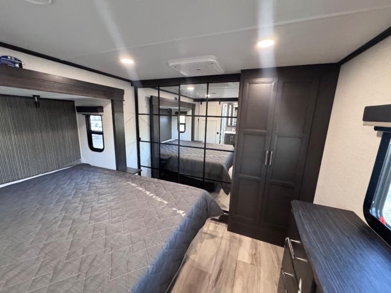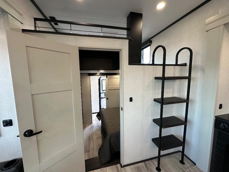 Get ready for family fun in this fifth wheel offering a front master bedroom with a king-size bed slide, plus a second master bedroom for your guests! The second bedroom includes a queen-size bed slide, a loft above the bedroom that sleeps three more, plus a rear full bathroom including a unique rear entry/exit door. And both entrances include the LCl SolidStep. The main living and kitchen area offers dual opposing slides and include theater seating, a free standing dinette, a fireplace, a center island and full kitchen amenities to feed your entire crew.