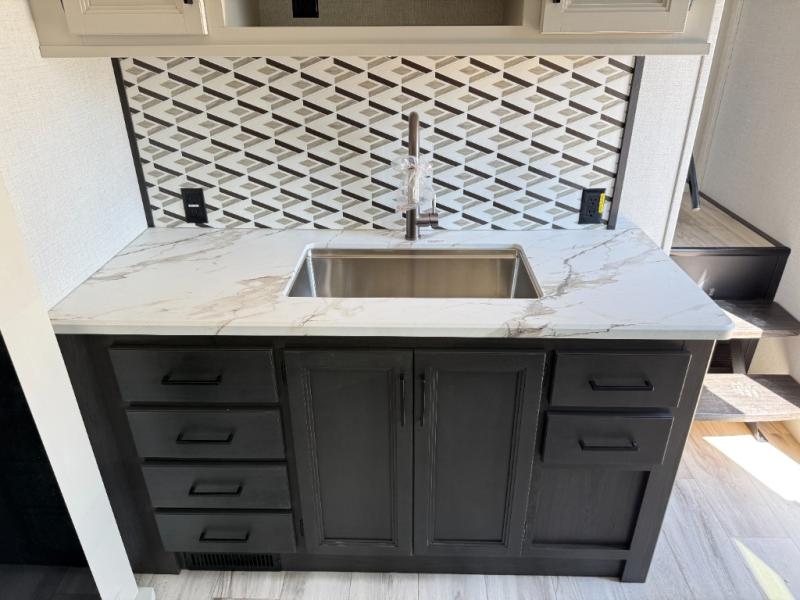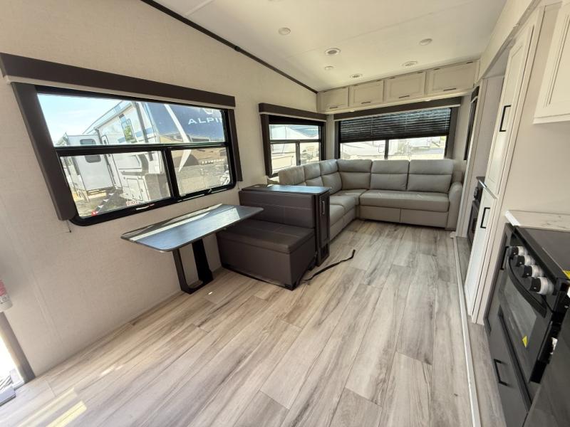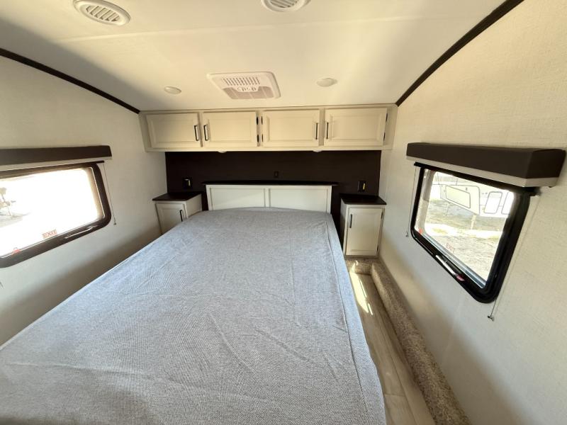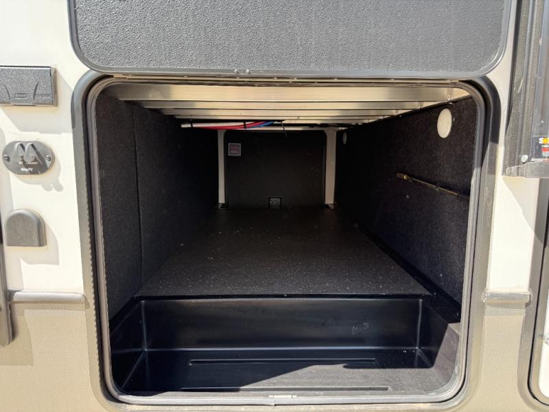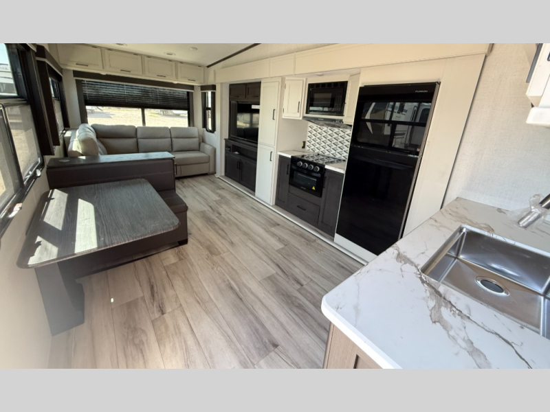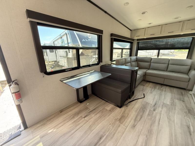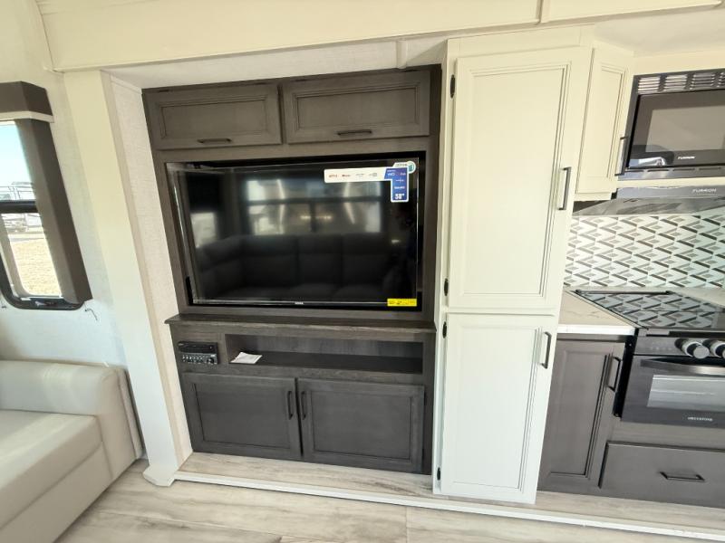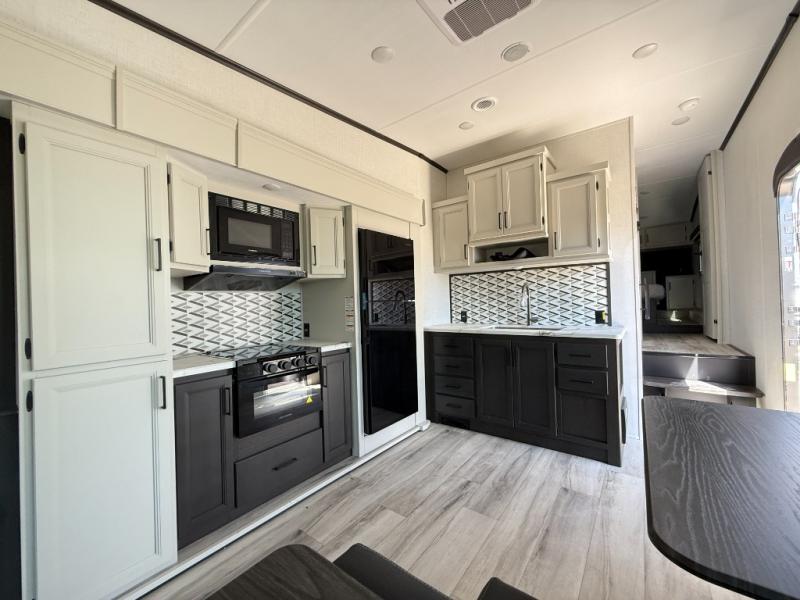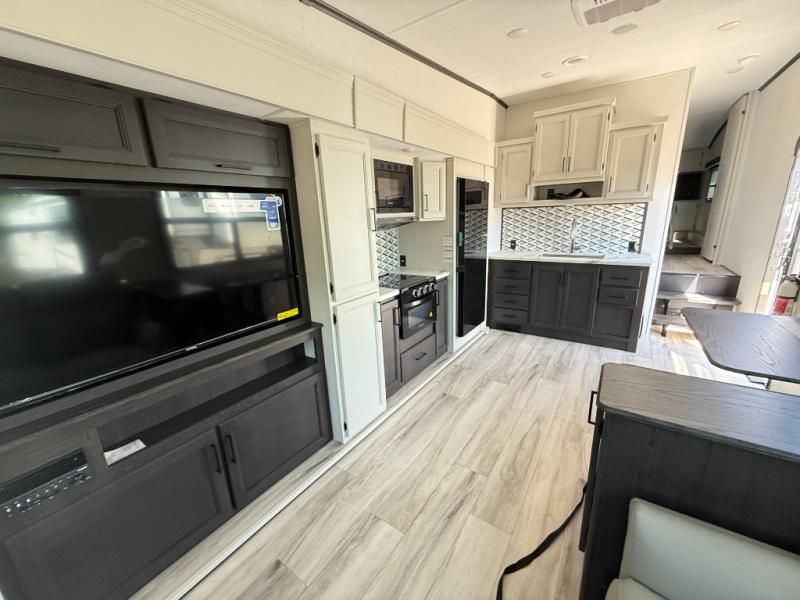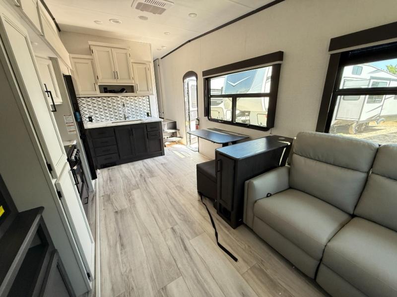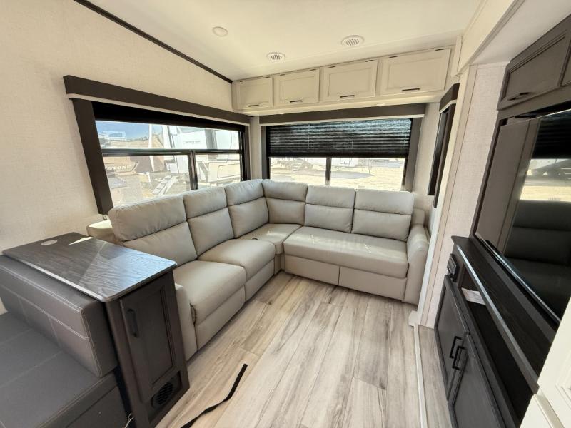 This fifth wheel will be the best RV vehicle for you and your family. Built to offer the ultimate comfort, this fifth wheel has a spacious living area that boasts a tri-fold sofa and sofa with recliners, perfect to rest while enjoying your tour favorites shows in the fabulous entertainment center. You can cook like a Michelin star chef in the incredible kitchen, fitted with a convection microwave, refrigerator, and three-burner range. Also, the overhead cabinets and pantry will allow you to keep all your food and spices organized on the go, and when your meal is done, you can enjoy it in the comfortable dinette. Convenience is our top priority; that is why the full bathroom is equipped with everything needed to take a nice shower. Finally, retreat to the comfortable queen bed, ideal for a deserved good night's rest.