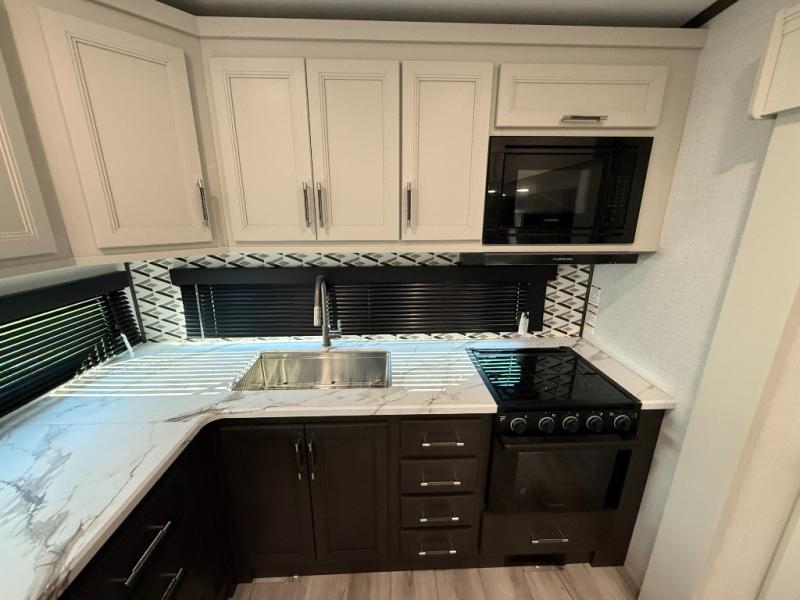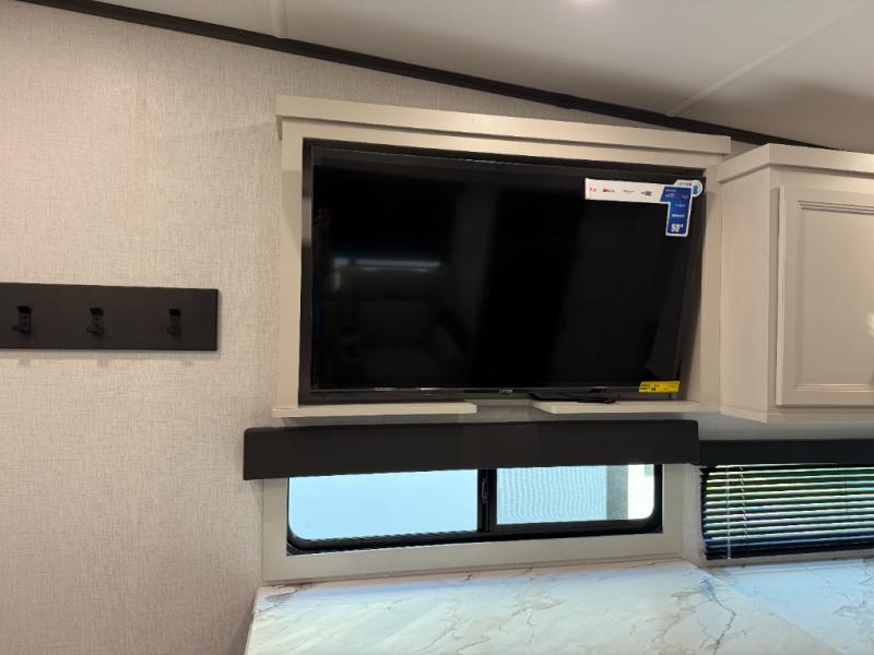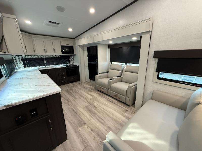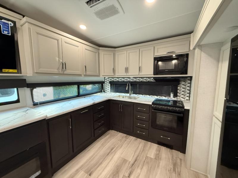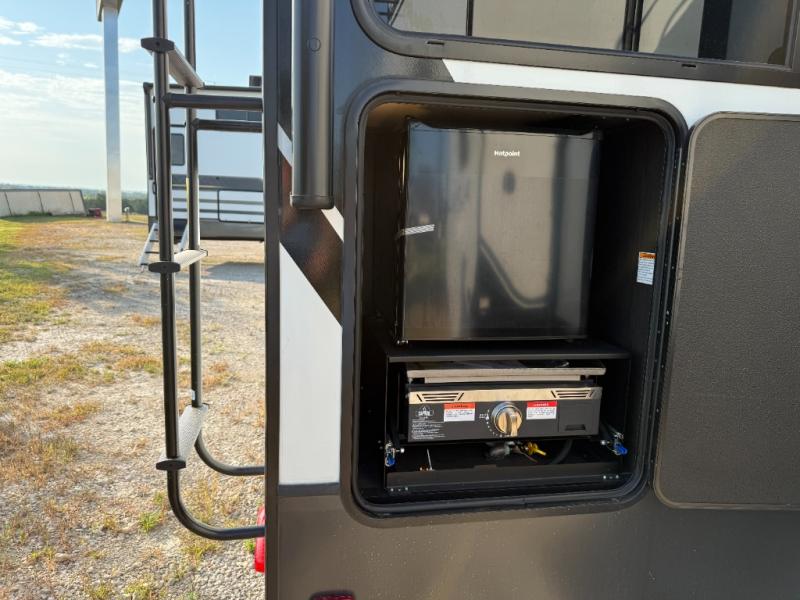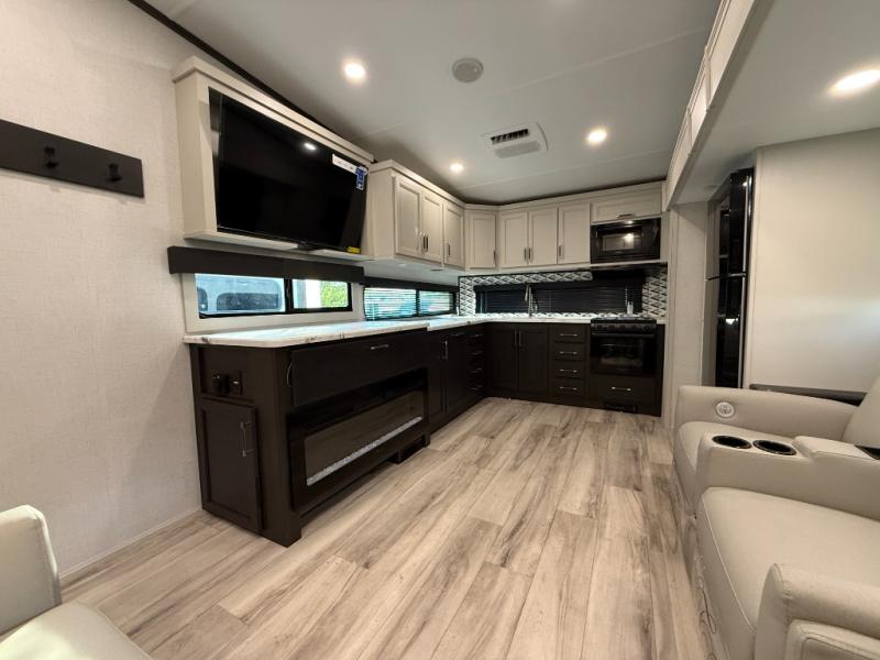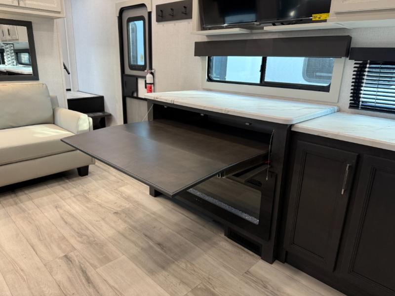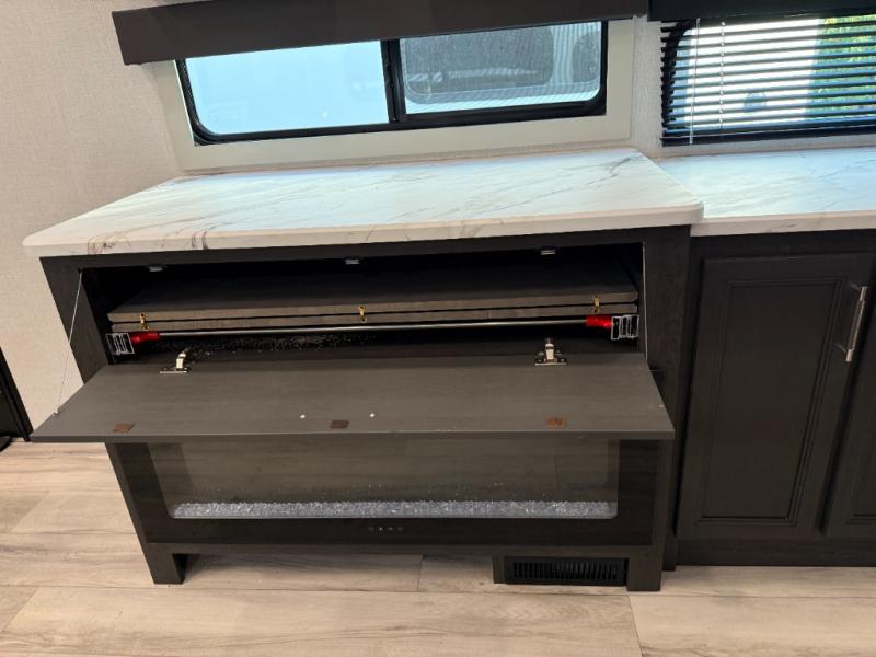 You're sure to love every minute spent in this rear kitchen fifth wheel! There is generous counter space to prep your best meals plus a pull-out dinette table where you can dine together. Additional seating space can be found on the theater seating and hide-a-bed sofa slide out. There is even a fireplace to make this space more cozy. If you enjoy spending time outdoors, there is a Grill-N-Chill outdoor kitchen, 19' power awning, and LCI solid steps. When it's time to call it a night, the queen bed in the private bedroom is sure to be calling your name!