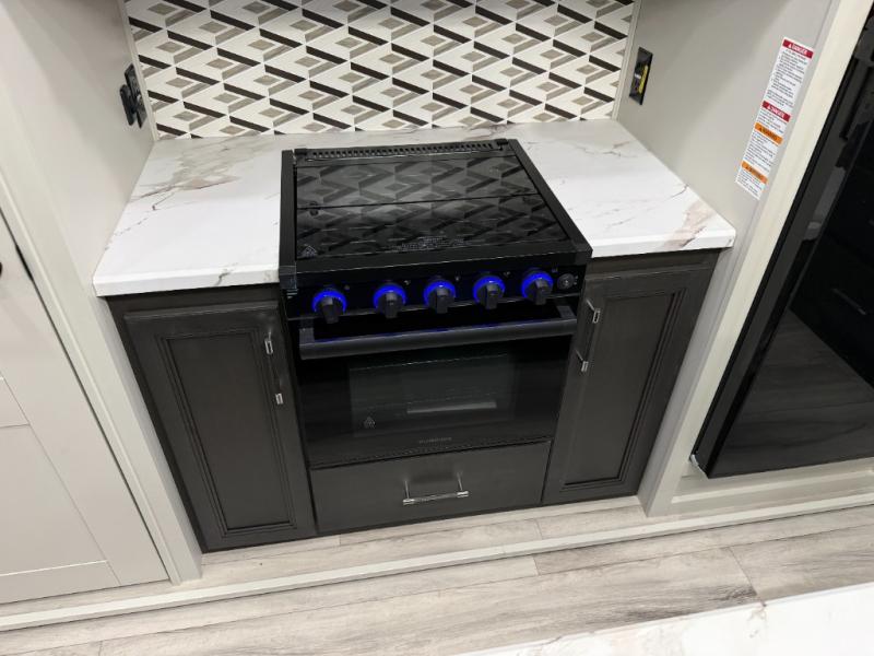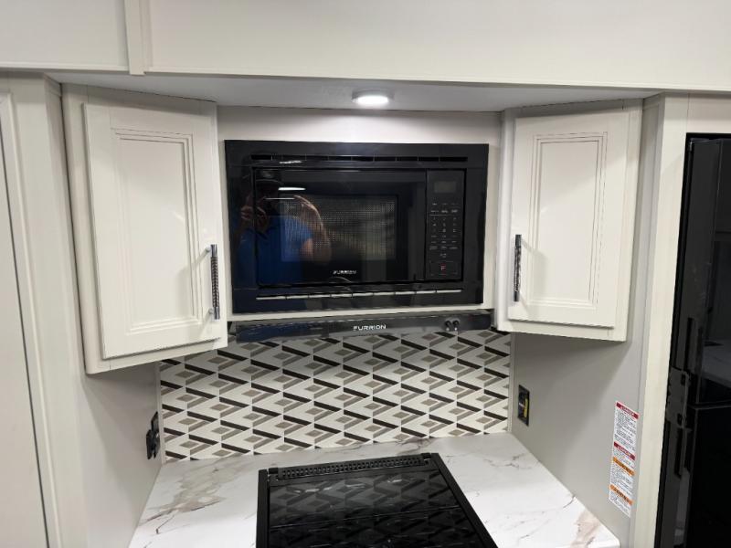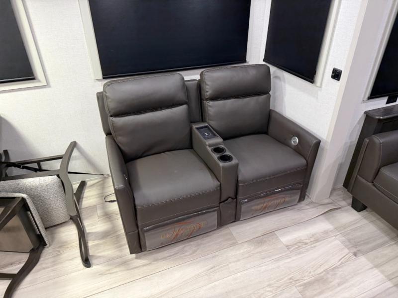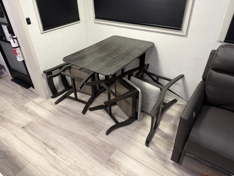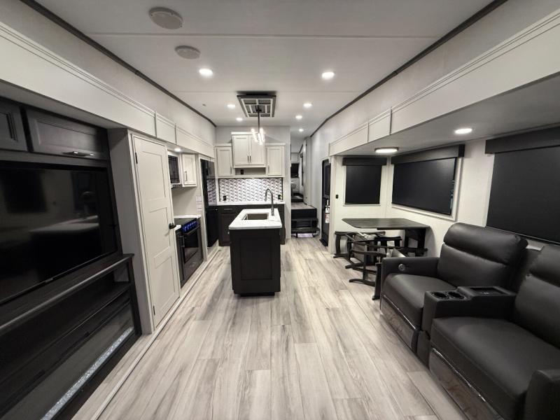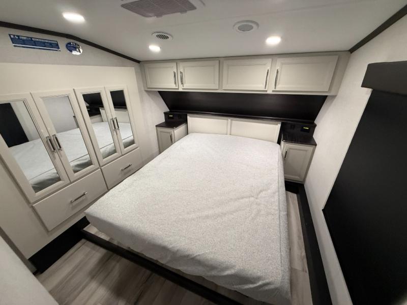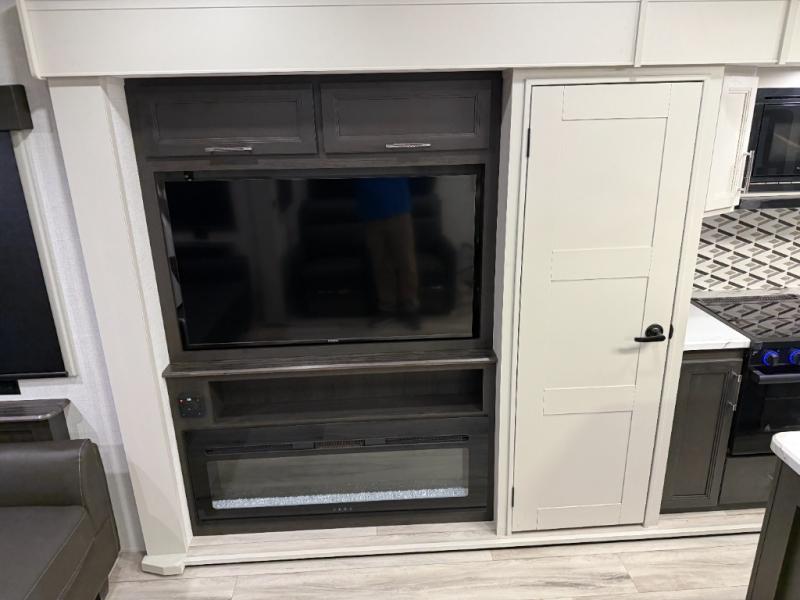 Make each camping trip complete with this fifth wheel in tow! The chef of your group will love making meals each day in the fully equipped kitchen that includes a kitchen island, a hutch, plus a pantry for food storage. The booth dinette will provide a place to dine each day, and the theater seating is right across from the TV with storage behind and a fireplace for easy viewing. And if you're not needing additional sleeping space you can switch out the booth dinette for the optional free-standing dinette! If you have guests, they can sleep on the rear XL sofa sleeper each night that extends to king-size, while you take the front private bedroom. Here, you'll find a queen bed, a wardrobe slide out, plus dual nightstands for your things.