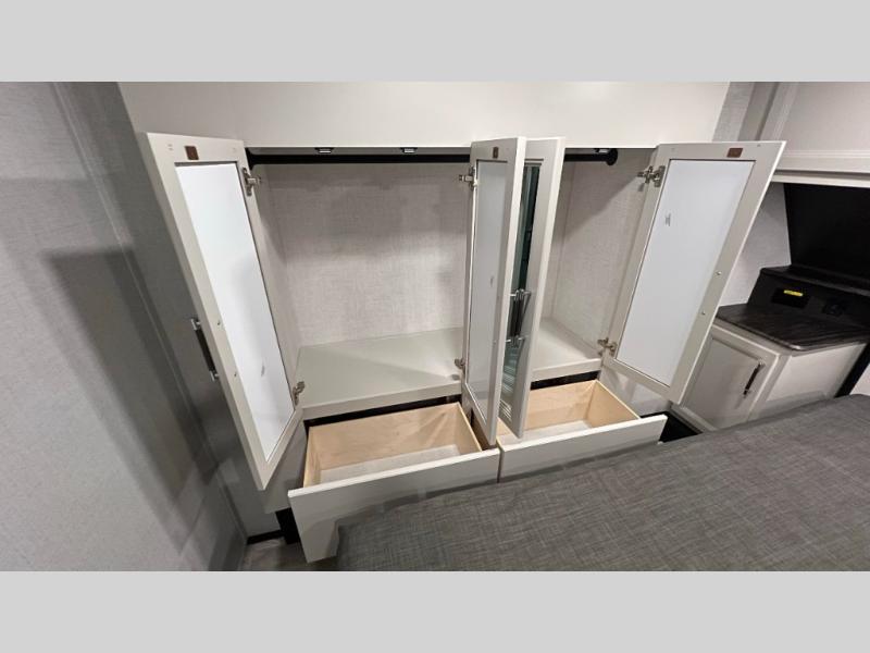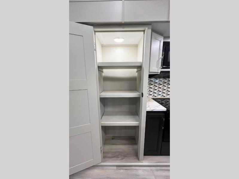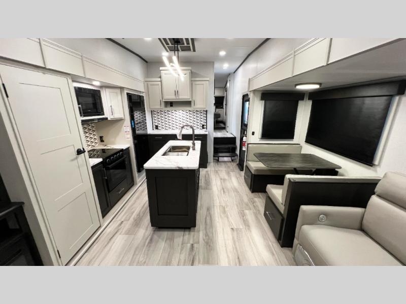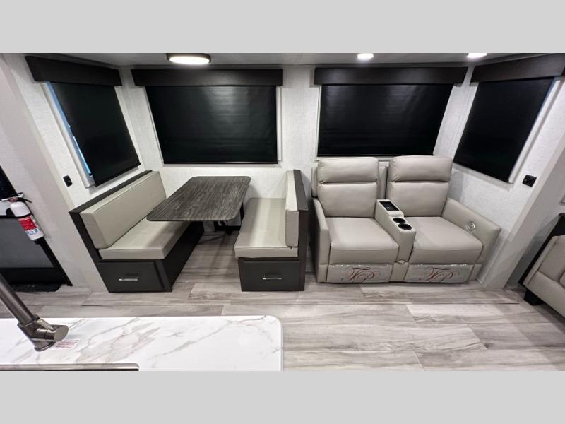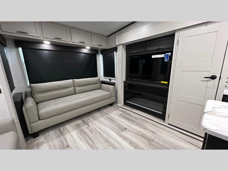 Make each camping trip complete with this fifth wheel in tow! The chef of your group will love making meals each day in the fully equipped kitchen that includes a kitchen island, a hutch, plus a pantry for food storage. The booth dinette will provide a place to dine each day, and the theater seating is right across from the TV with storage behind and a fireplace for easy viewing. And if you're not needing additional sleeping space you can switch out the booth dinette for the optional free-standing dinette! If you have guests, they can sleep on the rear XL sofa sleeper each night that extends to king-size, while you take the front private bedroom. Here, you'll find a queen bed, a wardrobe slide out, plus dual nightstands for your things.