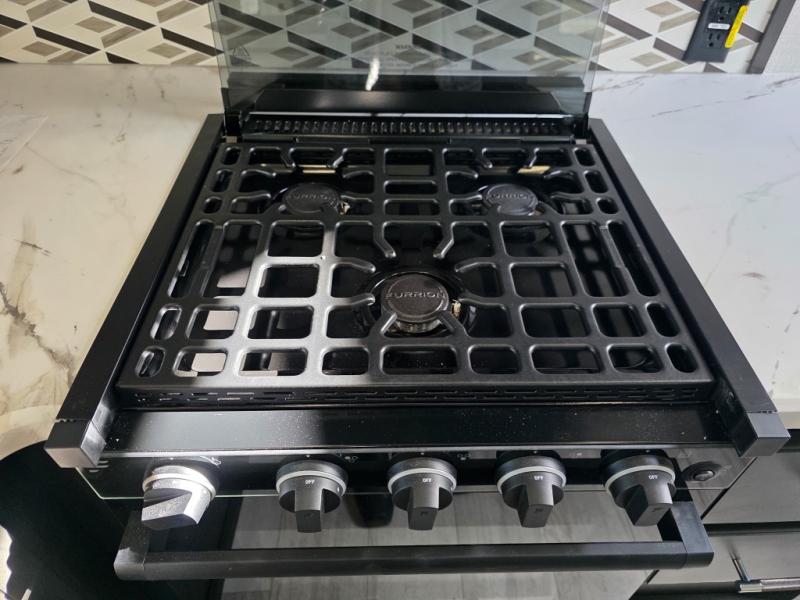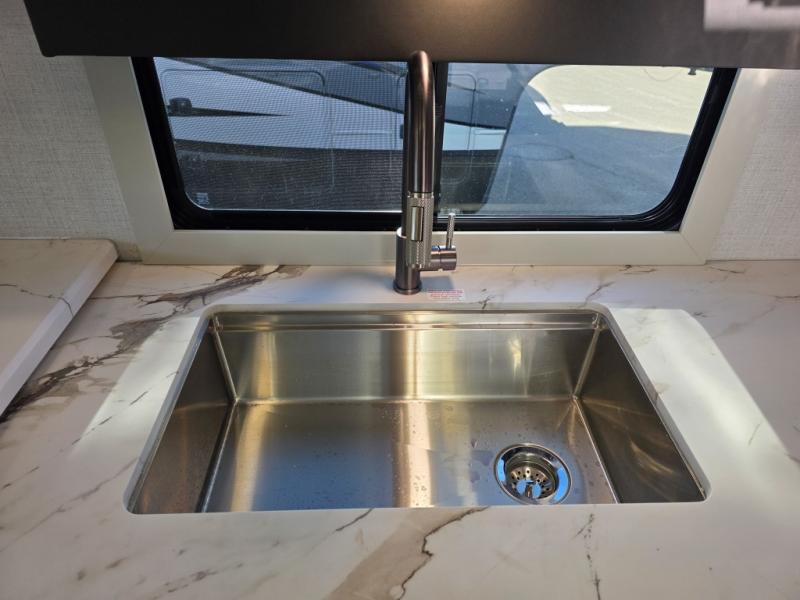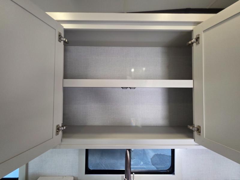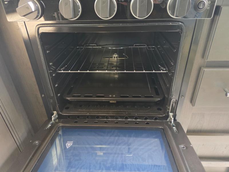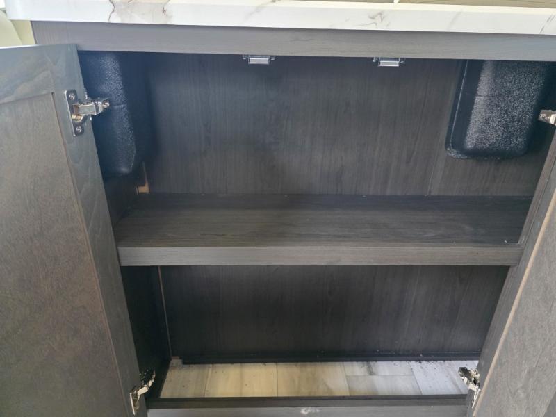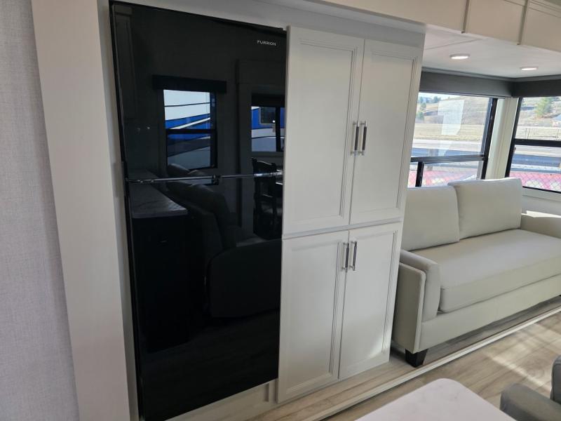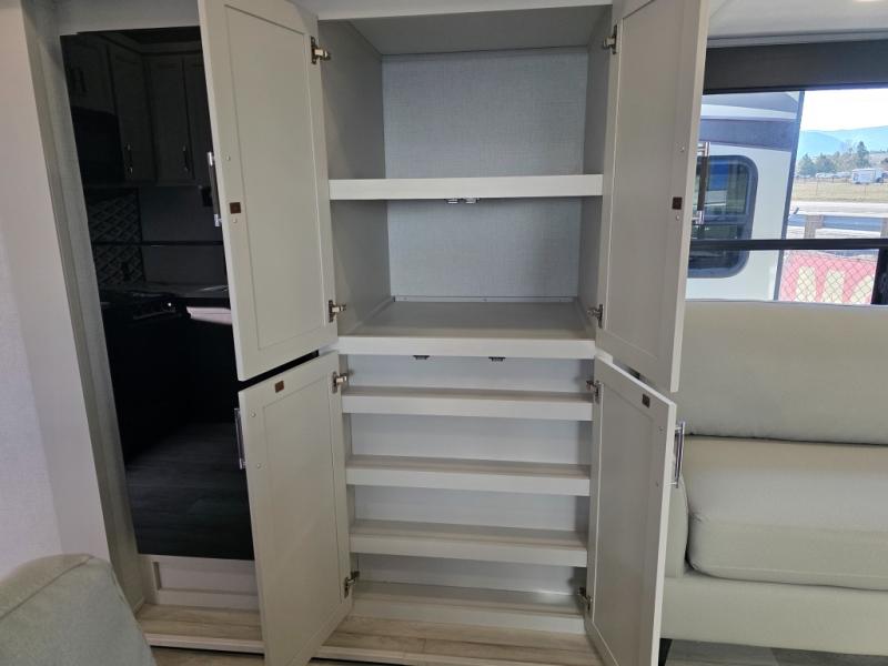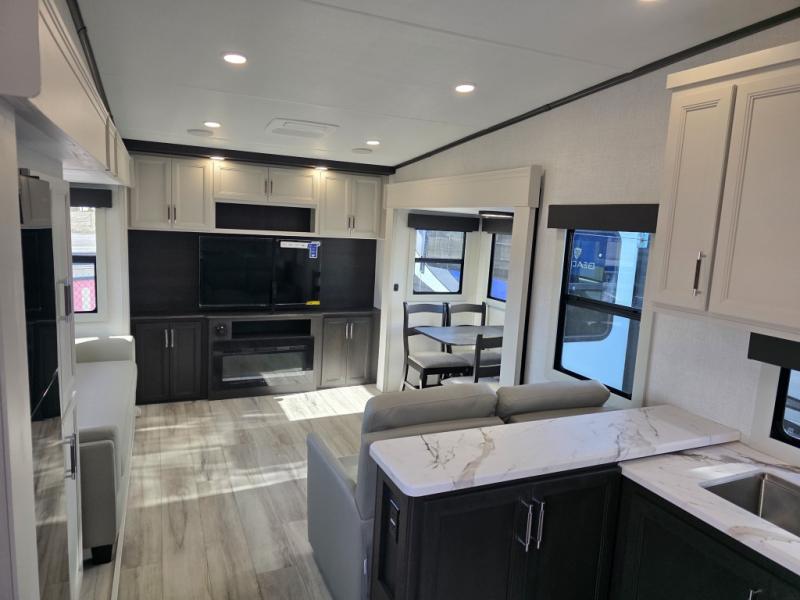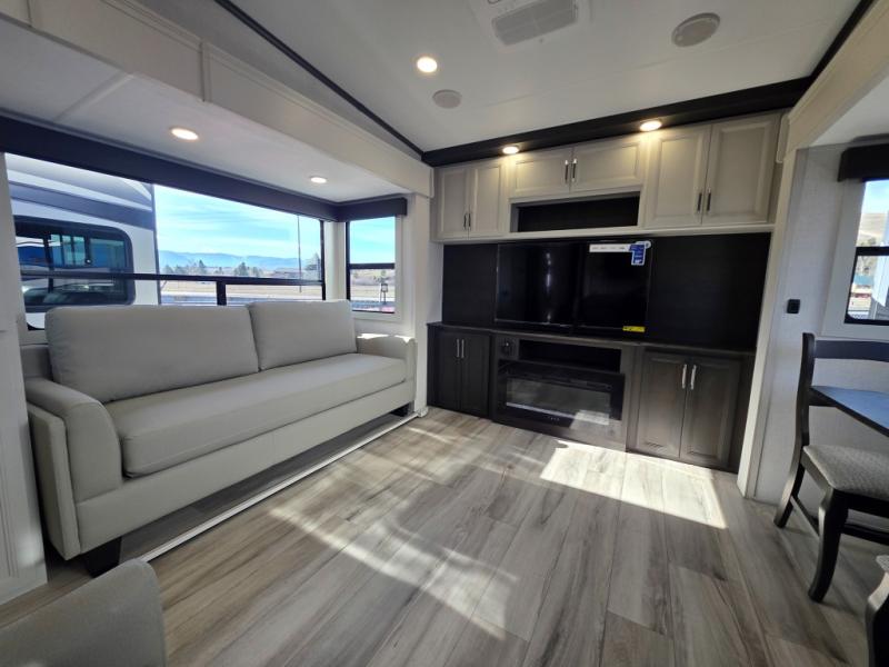 Camping is made easy in this fifth wheel! Once you arrive at the campground, you can enter in through the Composite Stow Away steps and start cooking a delicious meal in the middle kitchen with the 21" Furrion range with Piezo ignition,12V "Solar Friendly" refrigerator, and 0.9 cu. ft. microwave to pop a bag of popcorn for movie night. The rear living area offers a more at-home feel with a rear entertainment center with a fireplace, theater seating, and plenty of space to move about thanks to the opposing slide outs. There is also a free-standing dinette to play card games and enjoy meals and an XL sofa sleeper that extends to a king-size sleeping space. The full bath includes a 48" x 30" shower with a glass door and a skylight for more standing space, and the front private bedroom includes a queen bed for a great night's rest. You'll also find a wardrobe slide here and two two nightstands with an outlet to charge your electronics.