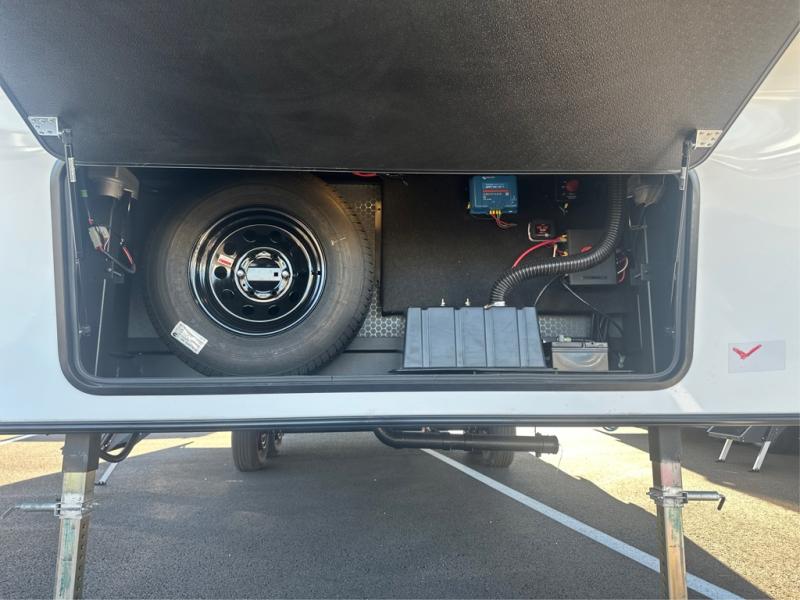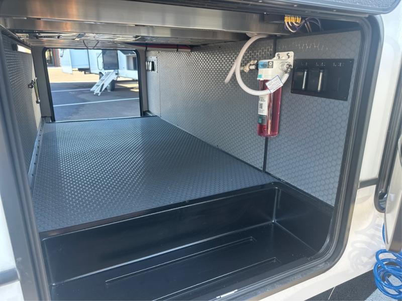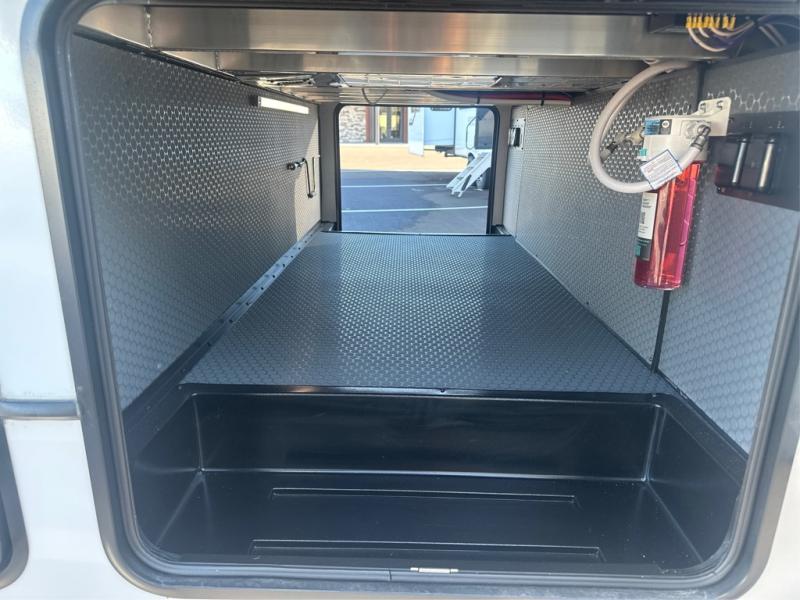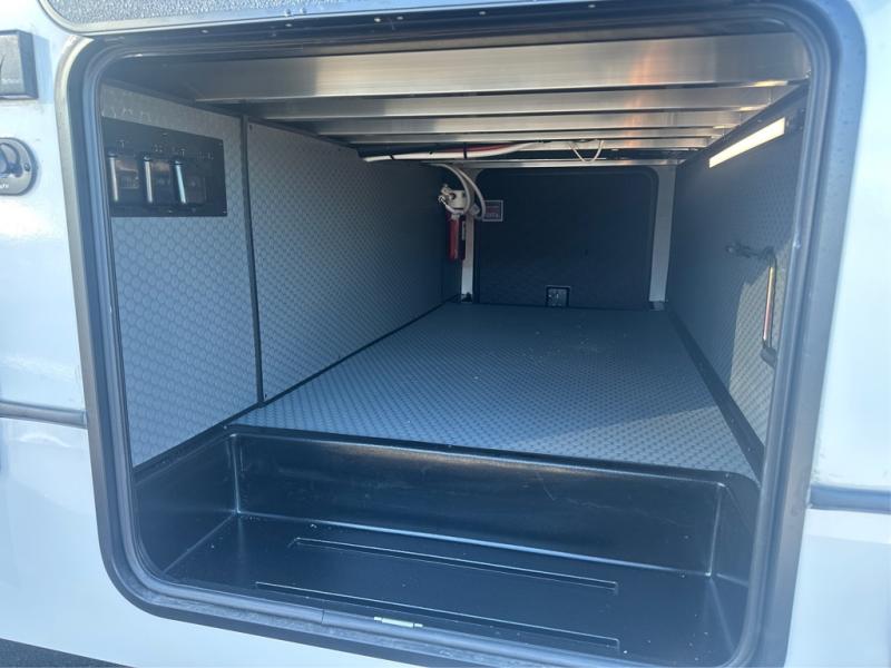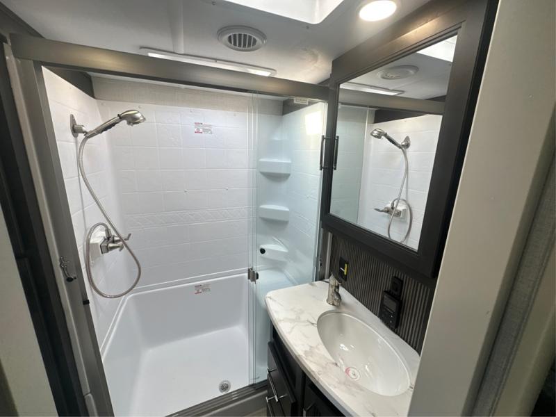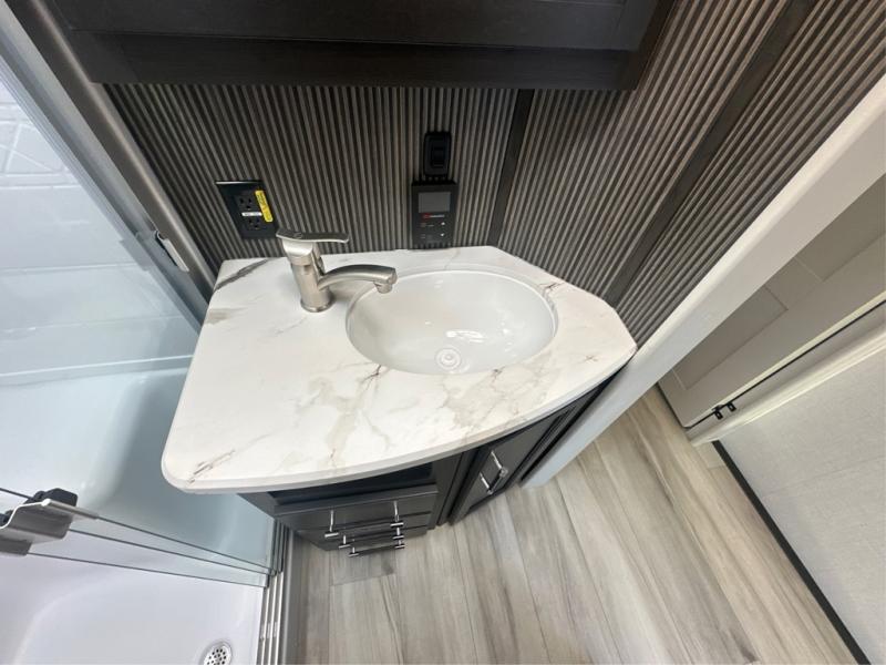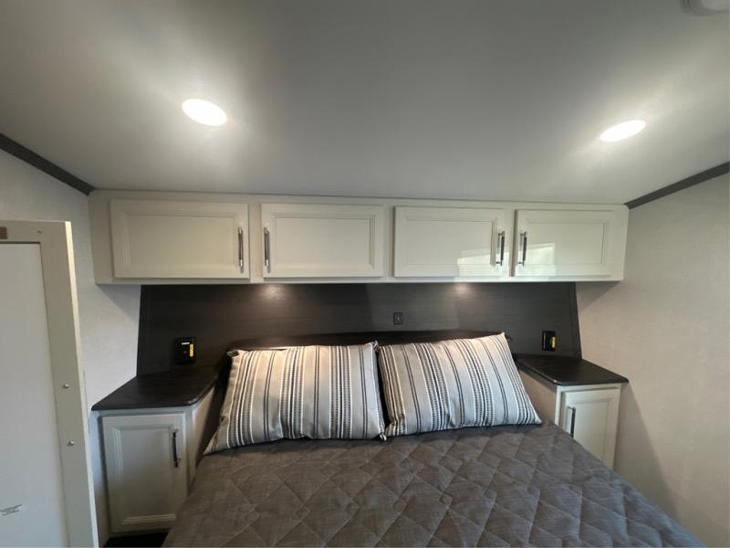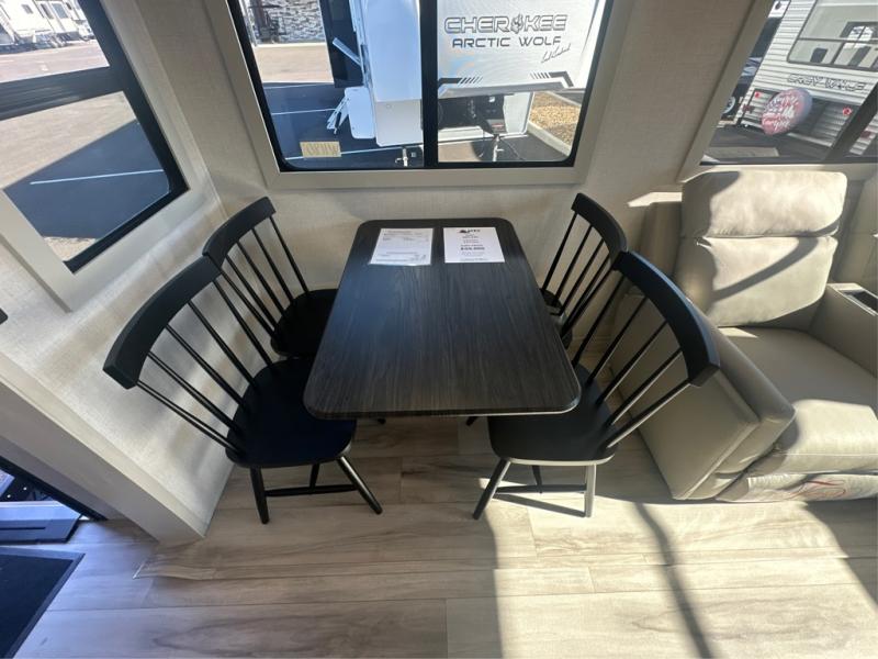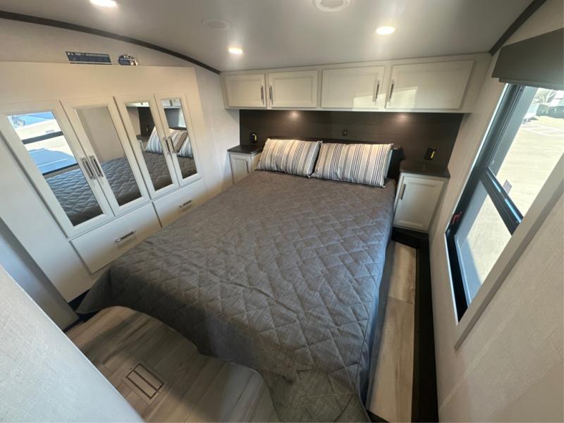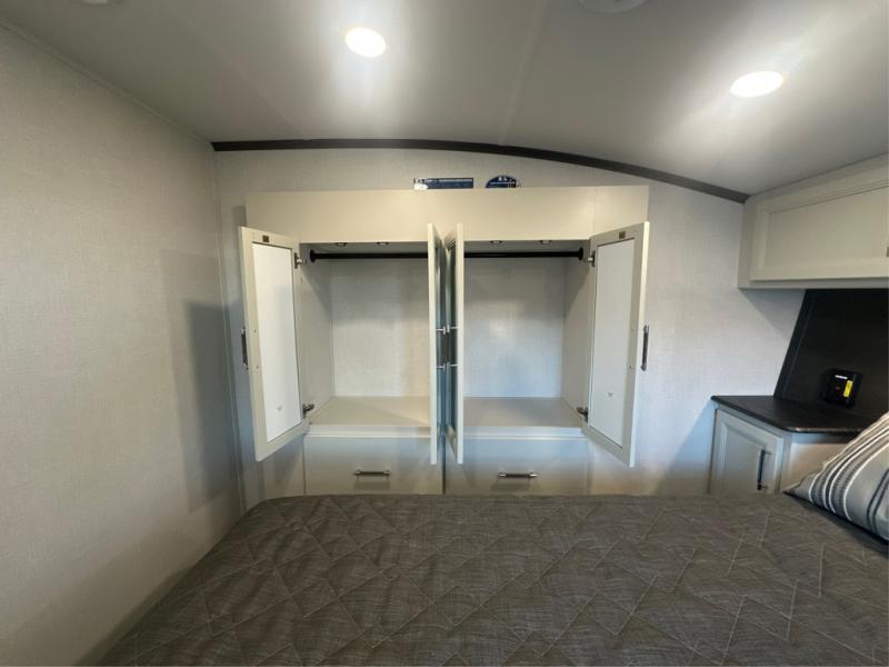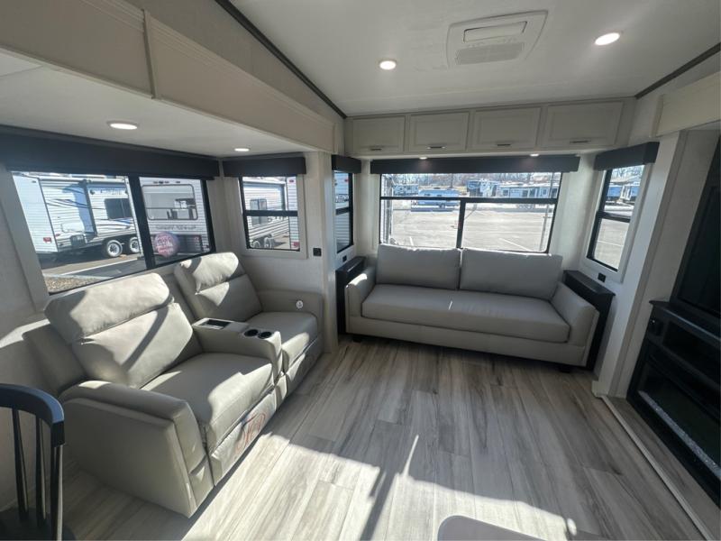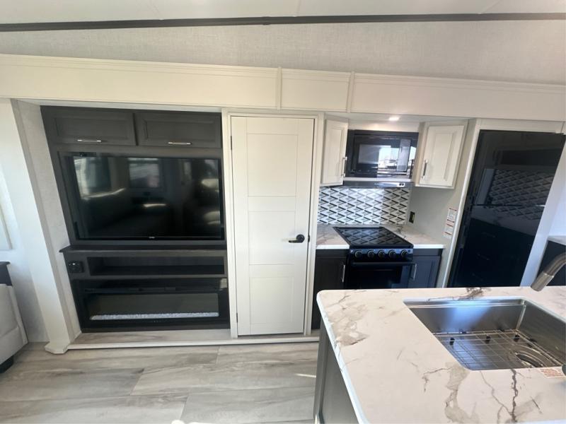 Camping is made easy in this fifth wheel! Once you arrive at the campground, you can enter in through the Composite Stow Away steps and start cooking a delicious meal in the middle kitchen with the 21" Furrion range with Piezo ignition,12V "Solar Friendly" refrigerator, and 0.9 cu. ft. microwave to pop a bag of popcorn for movie night. The rear living area offers a more at-home feel with a rear entertainment center with a fireplace, theater seating, and plenty of space to move about thanks to the opposing slide outs. There is also a free-standing dinette to play card games and enjoy meals and an XL sofa sleeper that extends to a king-size sleeping space. The full bath includes a 48" x 30" shower with a glass door and a skylight for more standing space, and the front private bedroom includes a queen bed for a great night's rest. You'll also find a wardrobe slide here and two two nightstands with an outlet to charge your electronics.