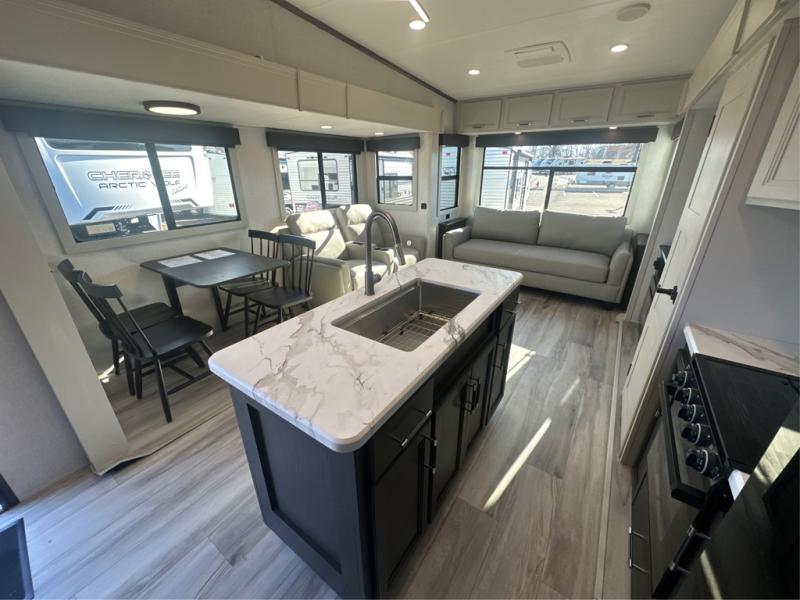 With any Arcadia Super Lite fifth wheel by Keystone, you will enjoy easy-to-tow lengths, unmatched storage, and plenty of windows to let the outdoor views in. The structural I-beam frame will provide a strong foundation to your RV, and the Full pass-through storage for all your equipment and camping gear. You will be able to camp in cold and hot climates thanks to the Peak Weather Package that includes a heated and enclosed underbelly, two Furrion A/C for cool temperatures in the summer, and Keystone's exclusive HyperDeck floor that adds an additional layer of insulation to your floor. The interior will make you feel at home with residential hardware, seamless pressed countertops, black roller shades, and ample storage space. Sometimes the best things come in smaller packages; choose a Arcadia Super Lite today!