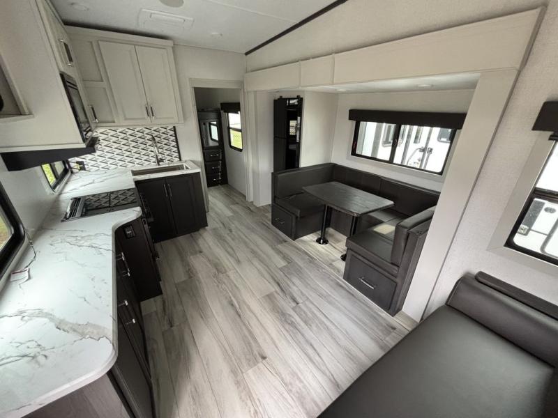 With any Arcadia Super Lite fifth wheel by Keystone, you will enjoy easy-to-tow lengths, unmatched storage, and plenty of windows to let the outdoor views in. The structural I-beam frame will provide a strong foundation to your RV, and the Full pass-through storage for all your equipment and camping gear. You will be able to camp in cold and hot climates thanks to the Peak Weather Package that includes a heated and enclosed underbelly, two Furrion A/C for cool temperatures in the summer, and Keystone's exclusive HyperDeck floor that adds an additional layer of insulation to your floor. The interior will make you feel at home with residential hardware, seamless pressed countertops, black roller shades, and ample storage space. Sometimes the best things come in smaller packages; choose a Arcadia Super Lite today!