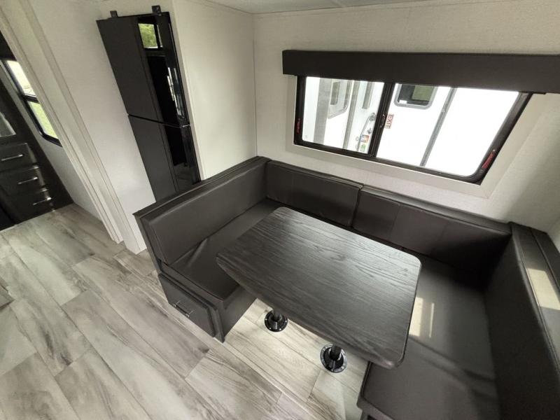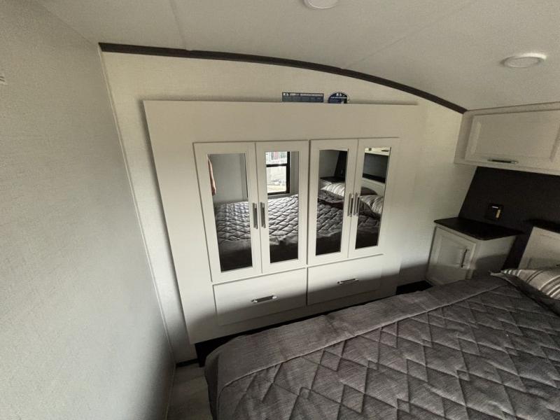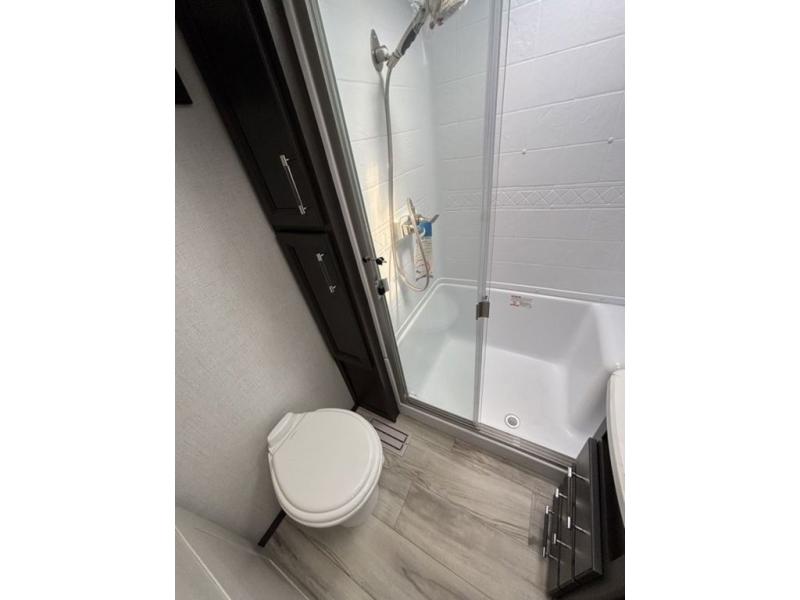 This Arcadia Super Lite model is thoughtfully designed to accommodate both comfort and functionality for the whole gang. In the back, the spacious bunkhouse features three bunks, a built-in dresser, and a convenient pull-out counter/desk, perfect for activities for the little ones or extra workspace. At the heart of the unit, the cozy middle living area includes a large U-shaped dinette, creating the ideal space for shared meals, game nights, or relaxing together. The full bathroom offers enhanced accessibility with a built-in seat in the shower, making it comfortable for everyone. Up front, the private bedroom provides a restful retreat with a queen bed and a wardrobe slide-out, offering plenty of room to store clothes and belongings.