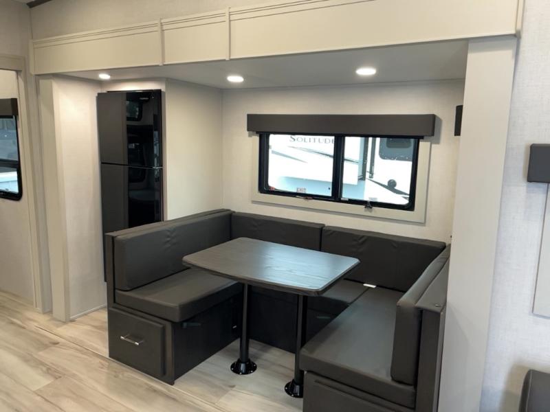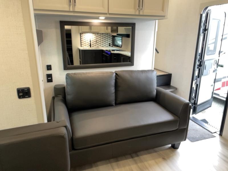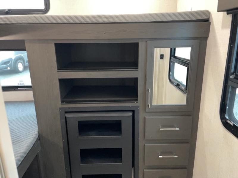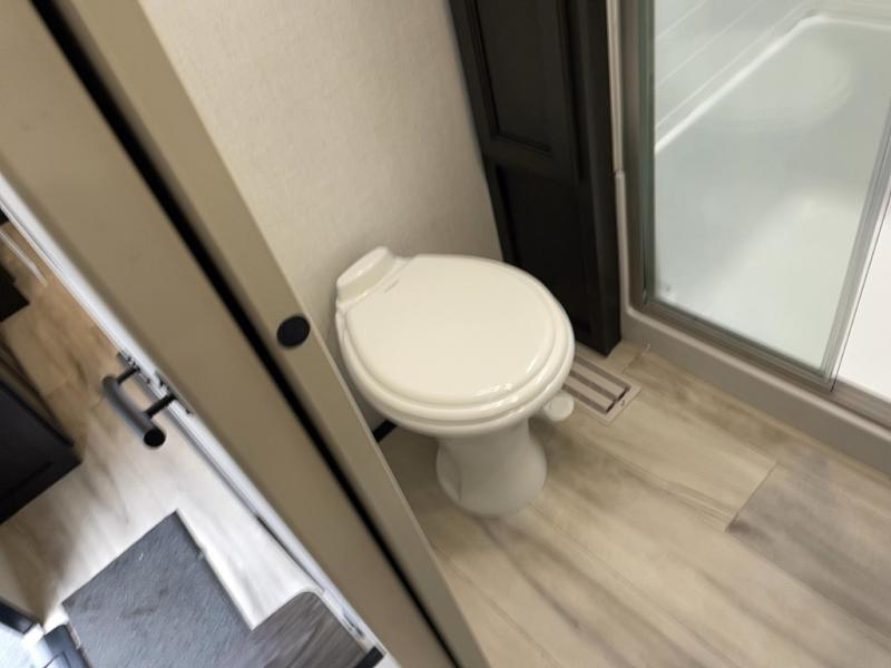 This Arcadia Super Lite model is thoughtfully designed to accommodate both comfort and functionality for the whole gang. In the back, the spacious bunkhouse features three bunks, a built-in dresser, and a convenient pull-out counter/desk, perfect for activities for the little ones or extra workspace. At the heart of the unit, the cozy middle living area includes a large U-shaped dinette, creating the ideal space for shared meals, game nights, or relaxing together. The full bathroom offers enhanced accessibility with a built-in seat in the shower, making it comfortable for everyone. Up front, the private bedroom provides a restful retreat with a queen bed and a wardrobe slide-out, offering plenty of room to store clothes and belongings.