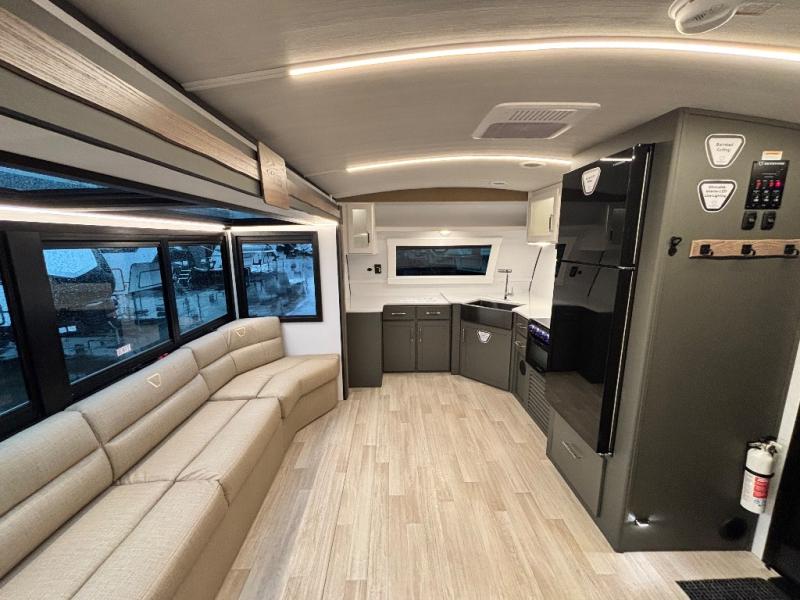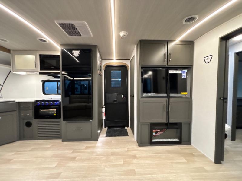 It won't be hard to feel right at home in this dual entry, front kitchen travel trailer! You will be impressed by the generous amount of solid surface countertops, along with an entryway pantry, a three burner range, and a 10 cu. ft. refrigerator. A Do-More dinette table and tri-fold sofa sit within a slide for more space, and the entertainment center with a fireplace is in great viewing for movie night. A walk-thru bath leads to the rear master bedroom, complete with a king bed slide, hanging storage, a wardrobe, and a dresser for ample storage space