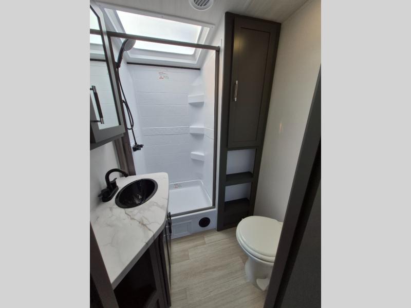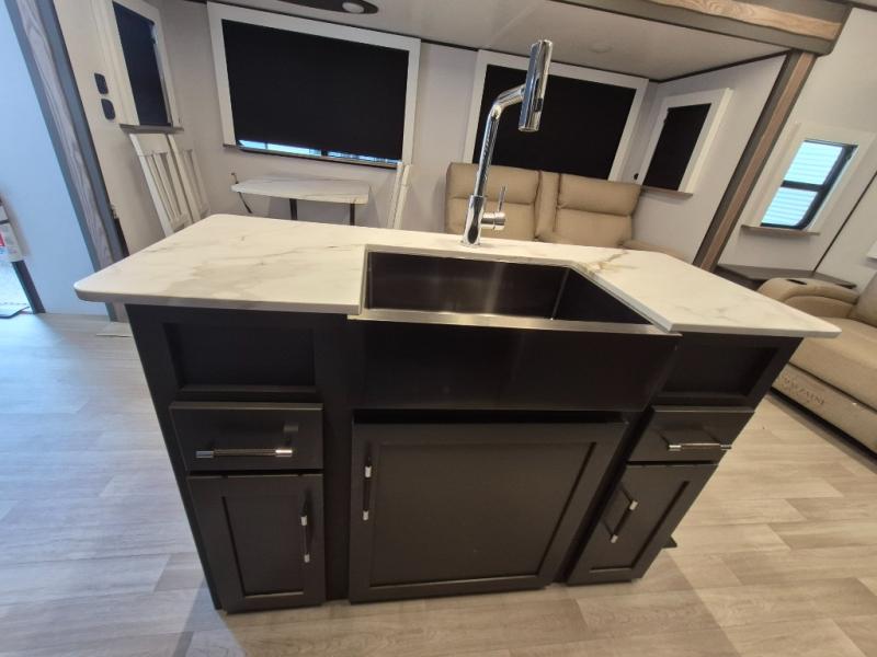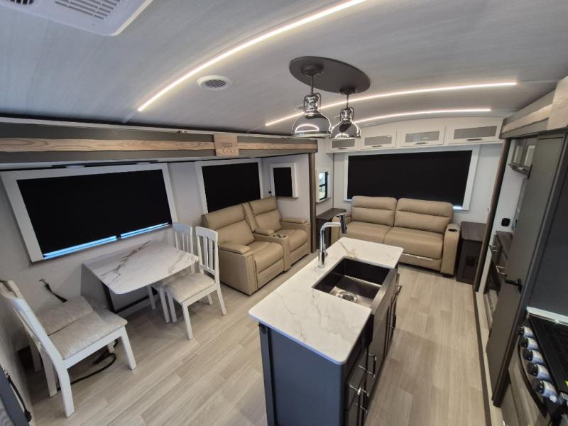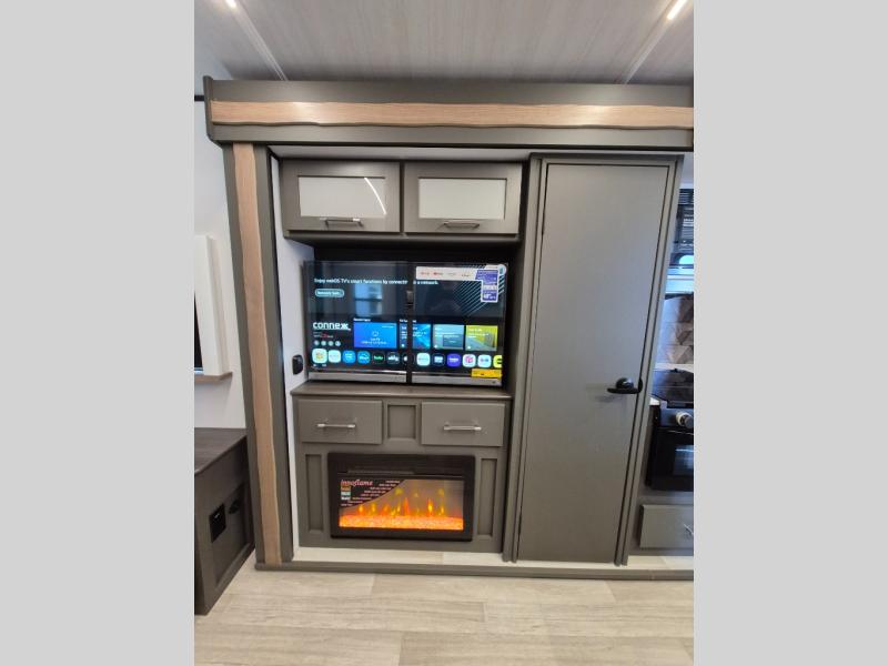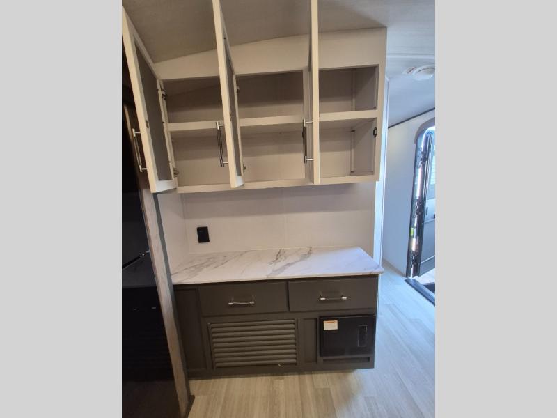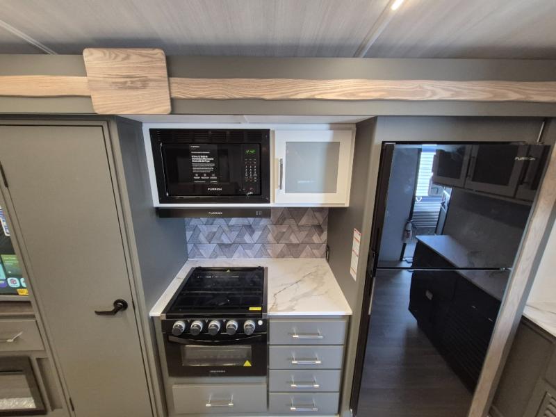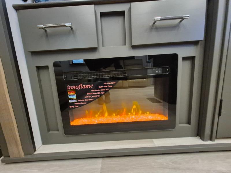 Weekend trips to the campground are made easy in this travel trailer! There are dual opposing slides in the combined kitchen and living area to provide you with ample space to stretch out. A kitchen island will come in handy when prepping meals, plus you'll have all the appliances needed to cook them. You will find comfortable seating on the rear tri-fold sofa sleeper, Do-More dinette table, and theater seats across from the entertainment center and fireplace. When you're ready to call it a night, the front private bedroom with a queen bed will be calling your name, and the full bath onboard will let you freshen up each day!