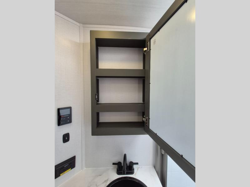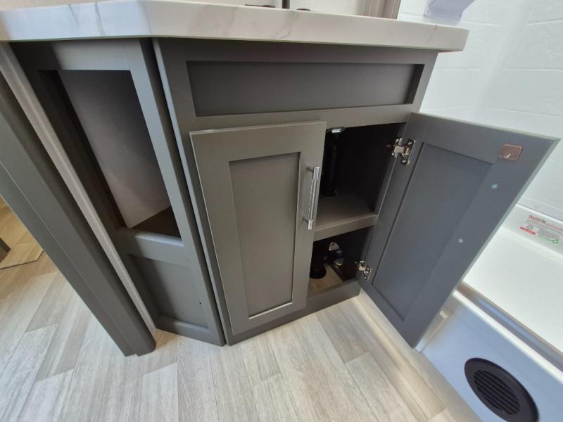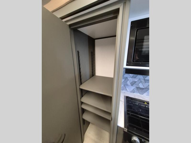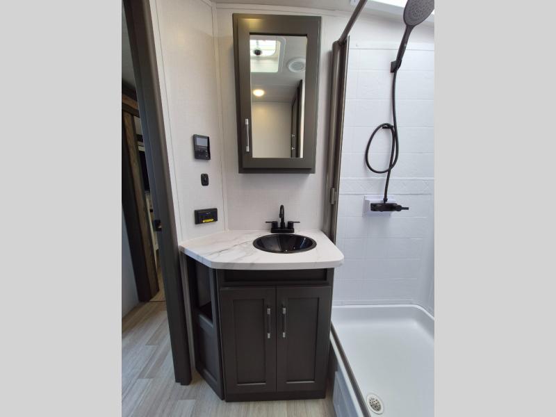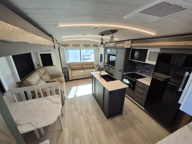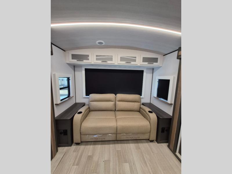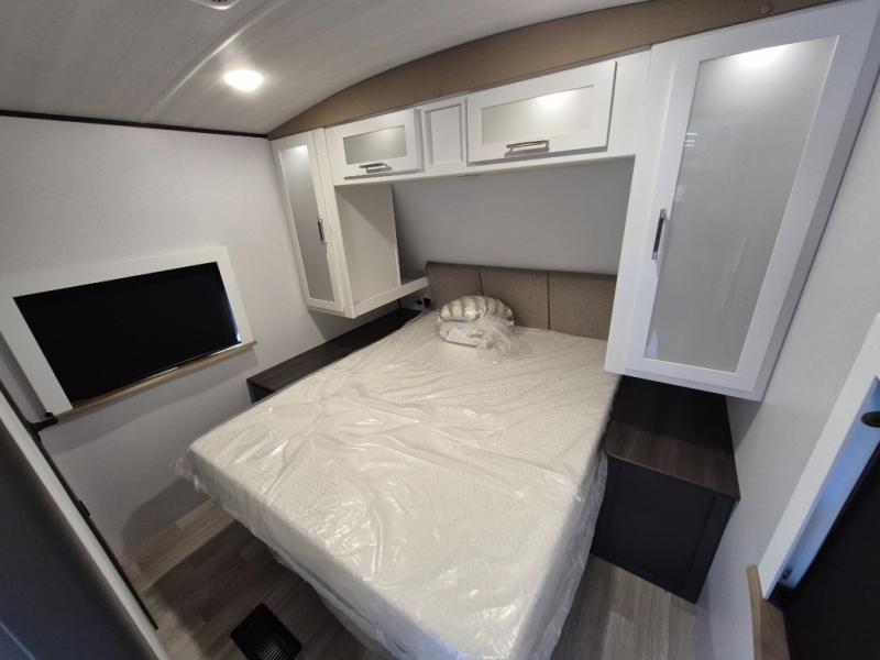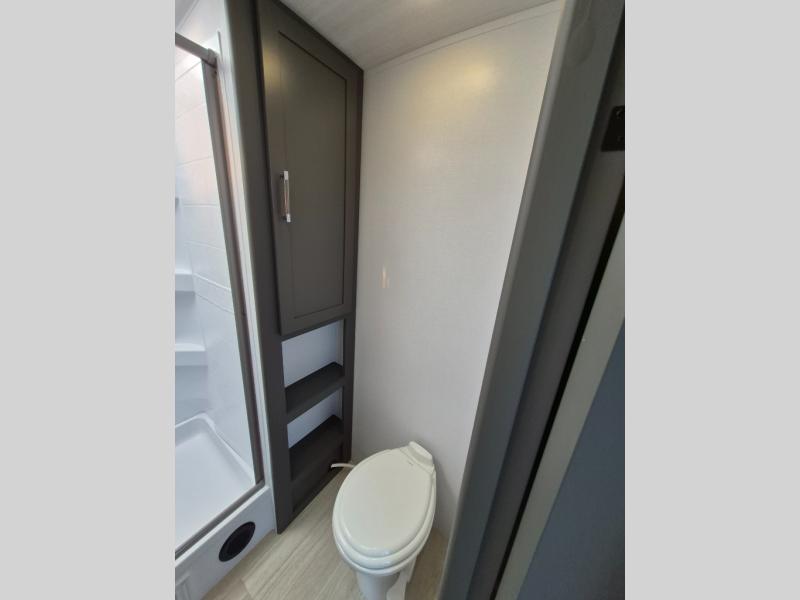 Weekend trips to the campground are made easy in this travel trailer! There are dual opposing slides in the combined kitchen and living area to provide you with ample space to stretch out. A kitchen island will come in handy when prepping meals, plus you'll have all the appliances needed to cook them. You will find comfortable seating on the rear tri-fold sofa sleeper, Do-More dinette table, and theater seats across from the entertainment center and fireplace. When you're ready to call it a night, the front private bedroom with a queen bed will be calling your name, and the full bath onboard will let you freshen up each day!