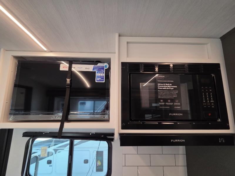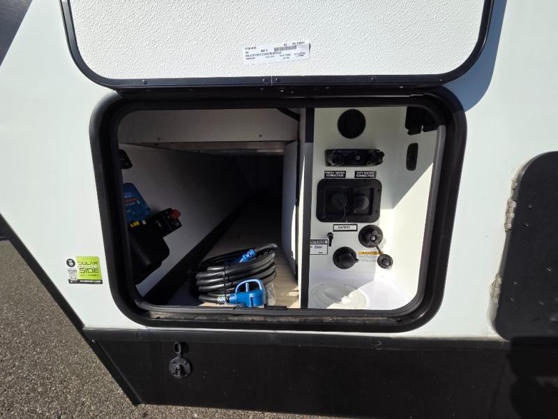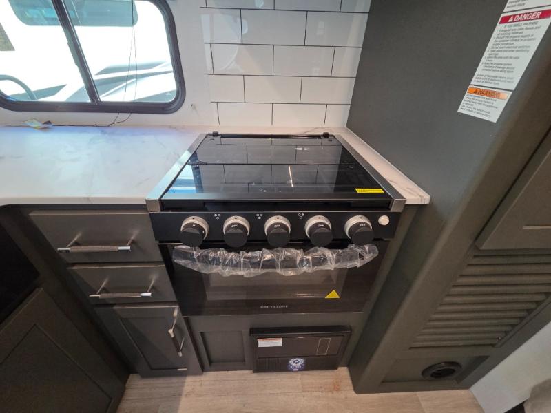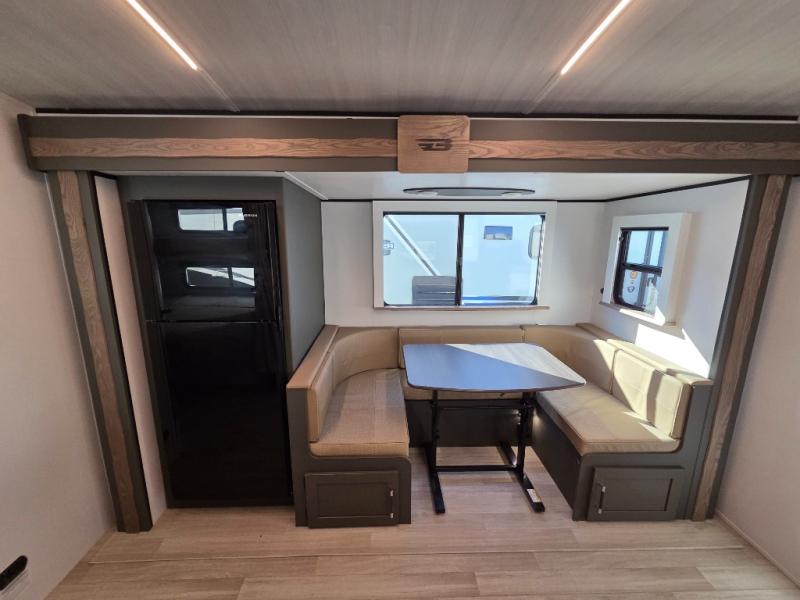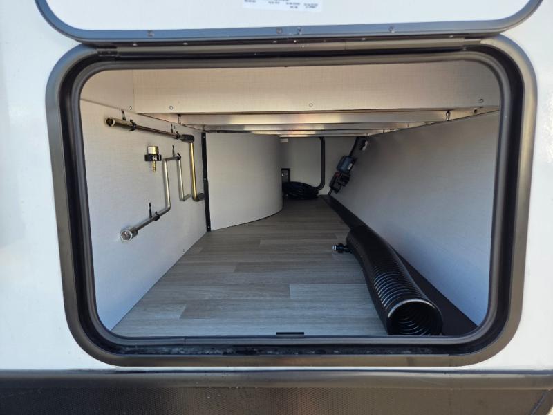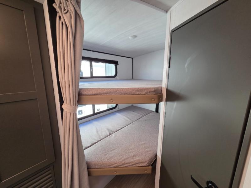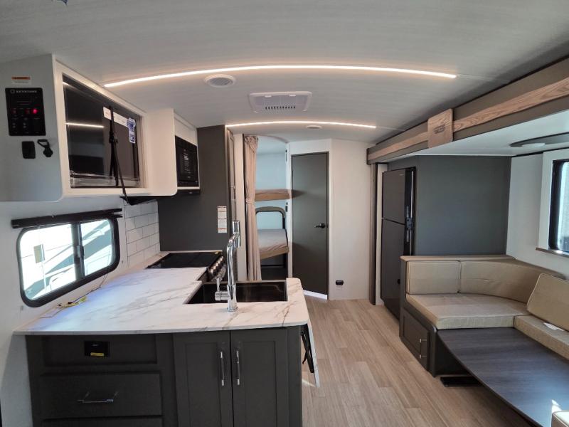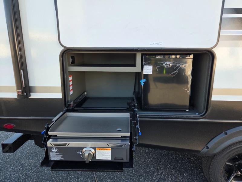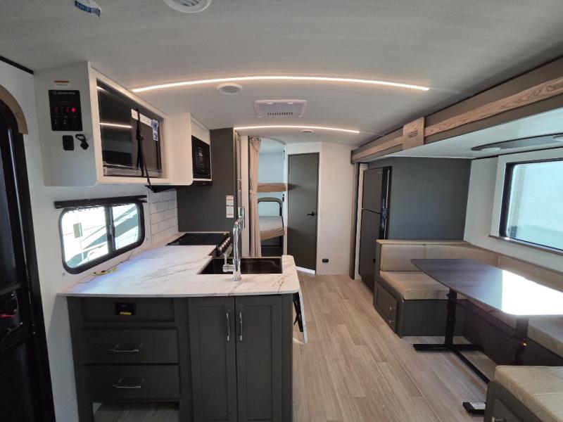You can easily sleep eight in this travel trailer thanks to the 51" x 74" double-size bunks, the U-shaped Do-More dinette table, and the queen bed in the front bedroom. There is a laundry chute in the bedroom that will go straight to the pass-through storage for convenience. Whip up your best meals on the three burner cooktop, or use the microwave oven. You can dine around the dinette, or take your plate outdoors to sit under the 15' awning, plus there is an outdoor kitchen with a griddle, mini fridge and shelf.
