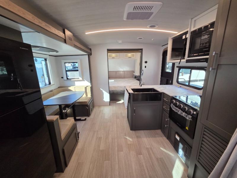 The Bullet Crossfire by Keystone are the perfect lightweight travel travel for rookie campers to seasoned RVers! Each one is built with a one-piece polypropylene underbelly, a fully walkable roof, and a high impact thermoset resin painted front cap for added durability. There is also a Dexter Torsion axle rubber ride suspension and Goodyear Endurance tires for a smooth tow plus a power tongue jack and power stabilizer jacks for easy set up. The interior will have you feeling right at home with deluxe night shades, updated Tranquil Timber decor, residential Beauflor vinyl flooring, and seamless kitchen countertops.