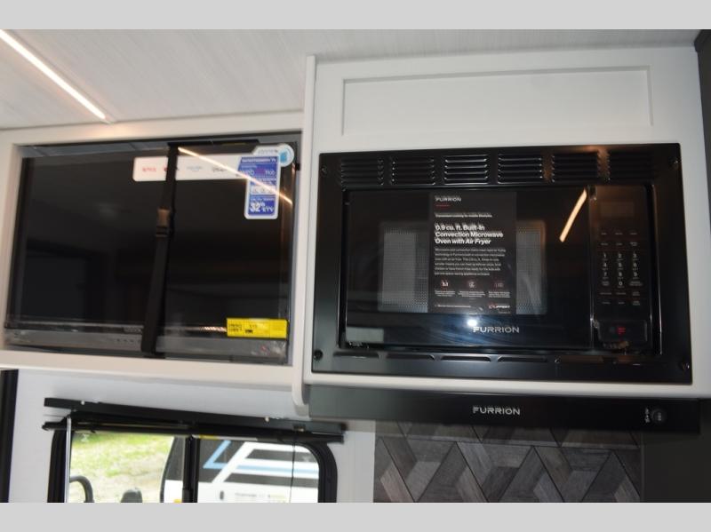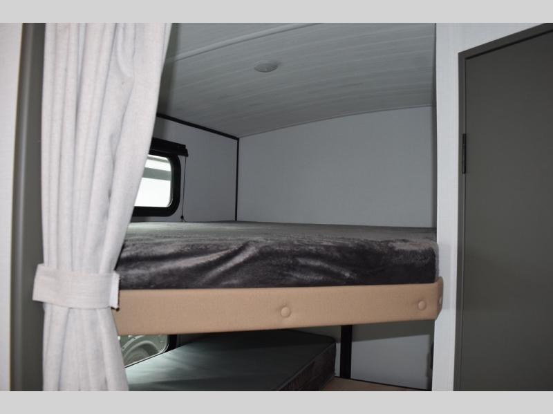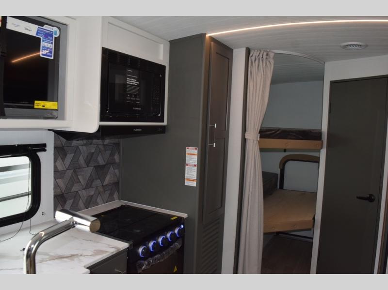 You can easily sleep eight in this travel trailer thanks to the 51" x 74" double-size bunks, the U-shaped Do-More dinette table, and the queen bed in the front bedroom. There is a laundry chute in the bedroom that will go straight to the pass-through storage for convenience. Whip up your best meals on the three burner cooktop, or use the microwave oven. You can dine around the dinette, or take your plate outdoors to sit under the 15' awning, plus there is an outdoor kitchen with a griddle, mini fridge and shelf.