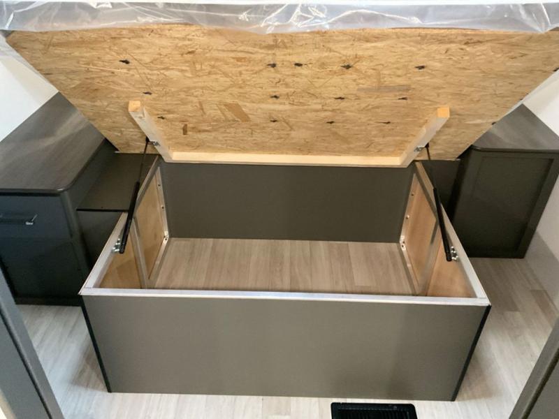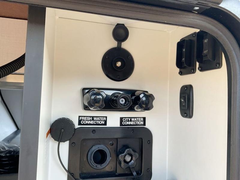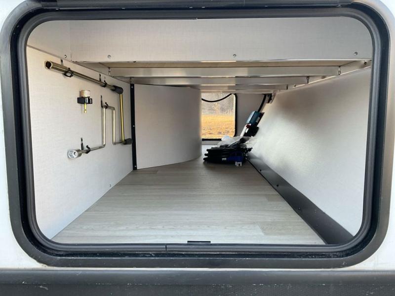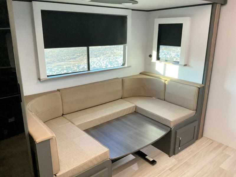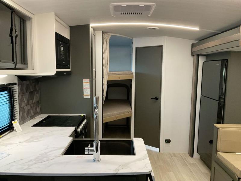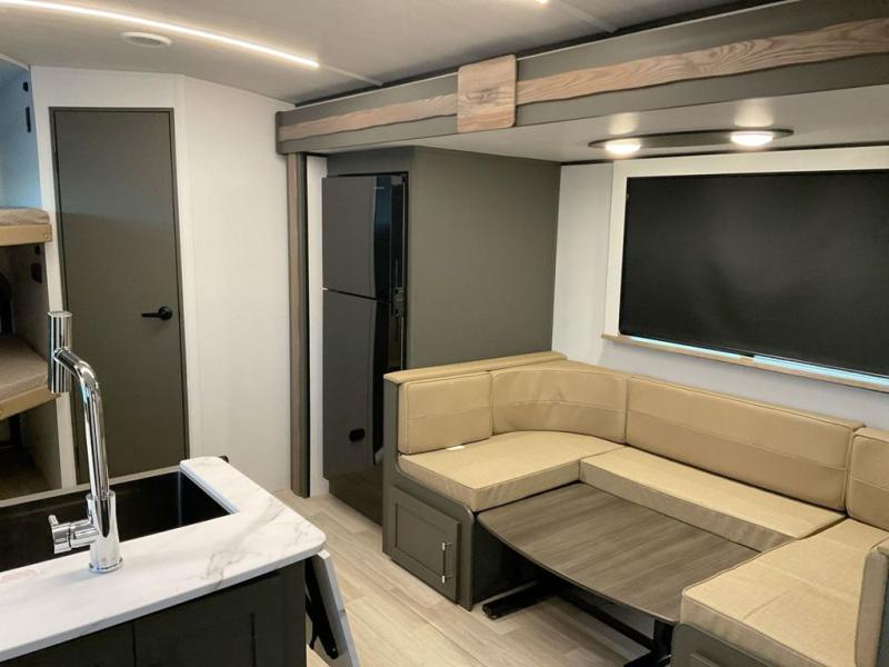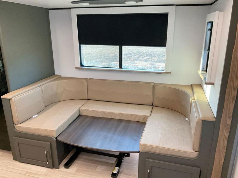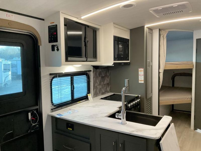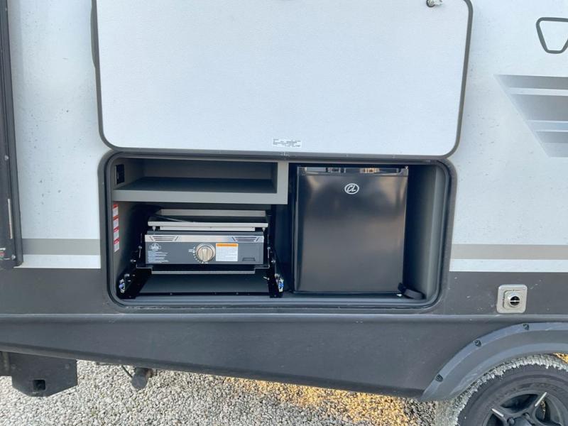You can easily sleep eight in this travel trailer thanks to the 51" x 74" double-size bunks, the U-shaped Do-More dinette table, and the queen bed in the front bedroom. There is a laundry chute in the bedroom that will go straight to the pass-through storage for convenience. Whip up your best meals on the three burner cooktop, or use the microwave oven. You can dine around the dinette, or take your plate outdoors to sit under the 15' awning, plus there is an outdoor kitchen with a griddle, mini fridge and shelf.