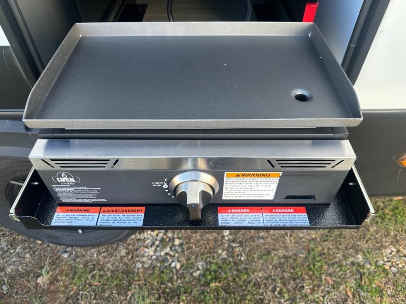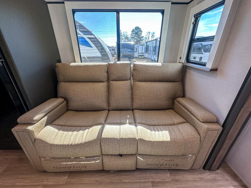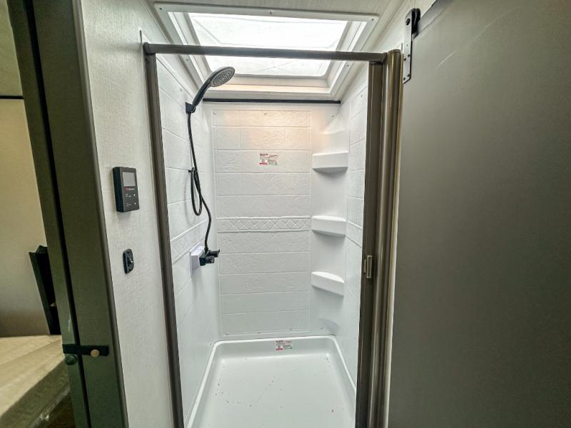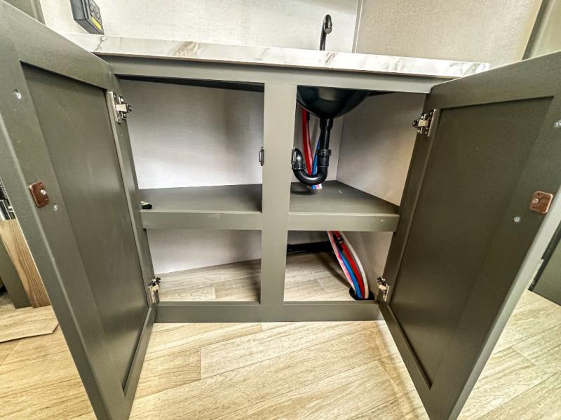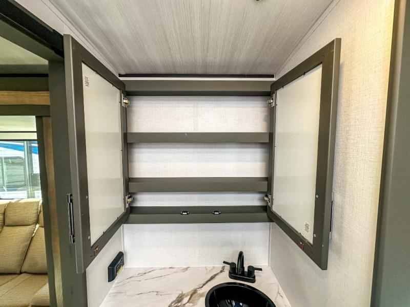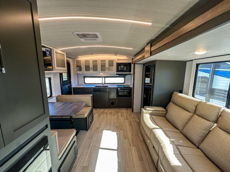 One step inside this dual entry travel trailer and you'll be sold! The rear kitchen features ample counter space to prep meals, and the booth dinette provides a place to dine together. There is also an outdoor kitchen with a griddle and mini fridge plus a 19' awning if you want to cook and eat outdoors. Two pantries and a 12V refrigerator will let you keep food stocked, and the tri-fold sofa slide provides sleeping space for guests. A walk-thru bath will create a front master bedroom you are sure to love, complete with a queen bed plus dual nightstands and dual wardrobes to keep everything tidy!
