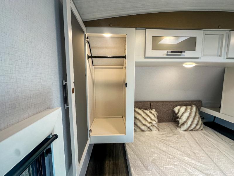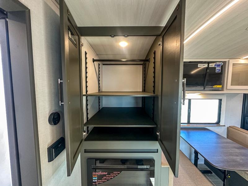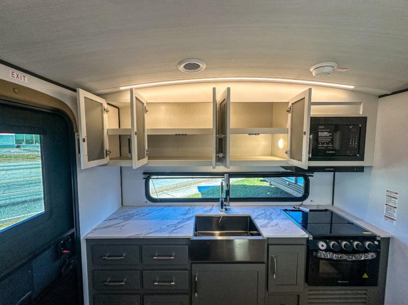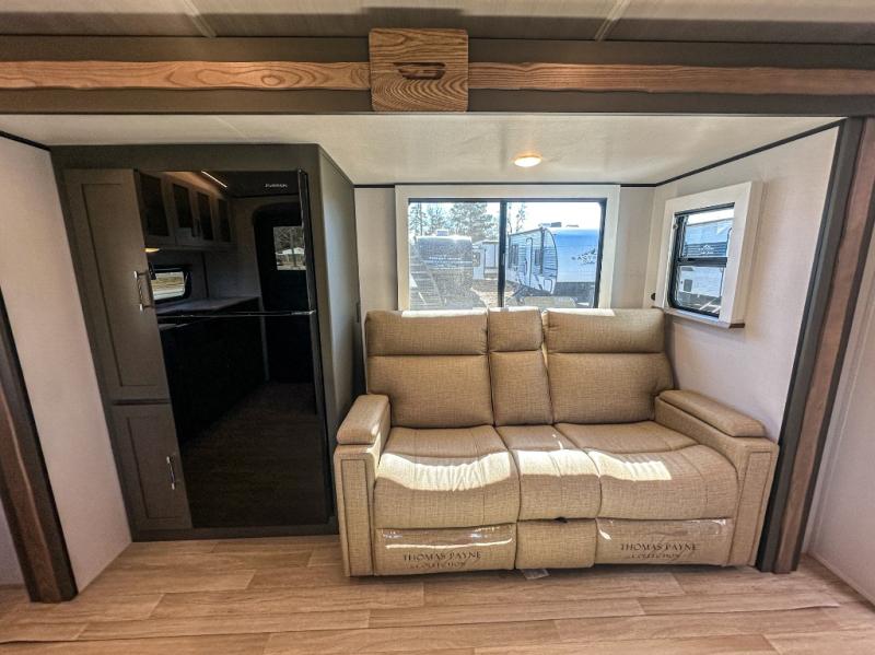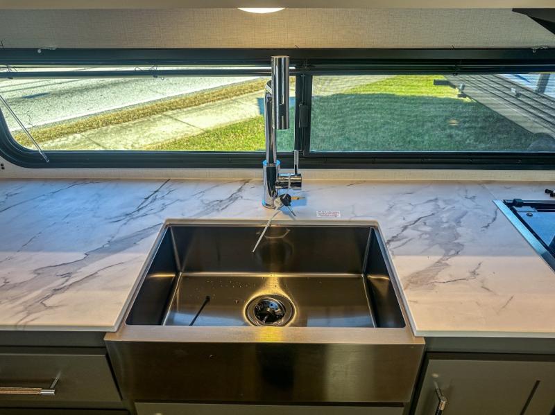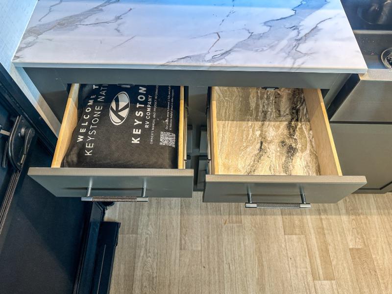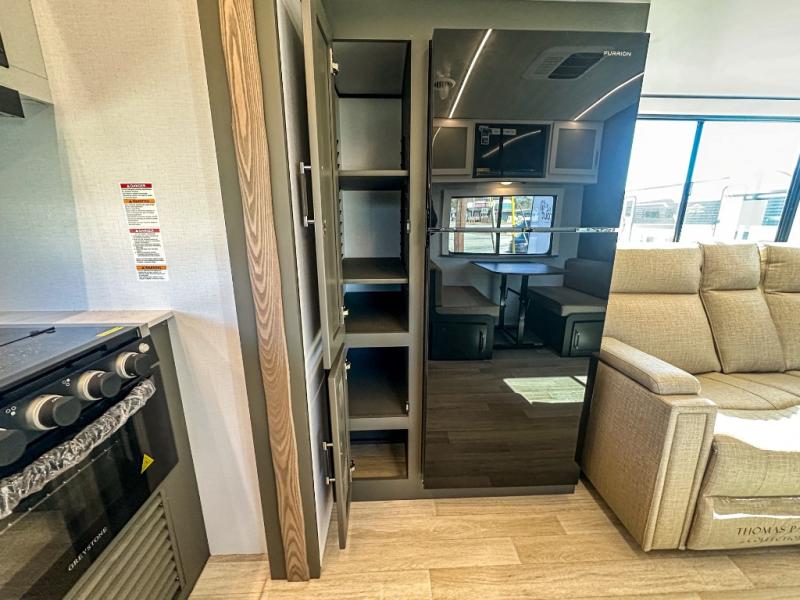 One step inside this dual entry travel trailer and you'll be sold! The rear kitchen features ample counter space to prep meals, and the booth dinette provides a place to dine together. There is also an outdoor kitchen with a griddle and mini fridge plus a 19' awning if you want to cook and eat outdoors. Two pantries and a 12V refrigerator will let you keep food stocked, and the tri-fold sofa slide provides sleeping space for guests. A walk-thru bath will create a front master bedroom you are sure to love, complete with a queen bed plus dual nightstands and dual wardrobes to keep everything tidy!