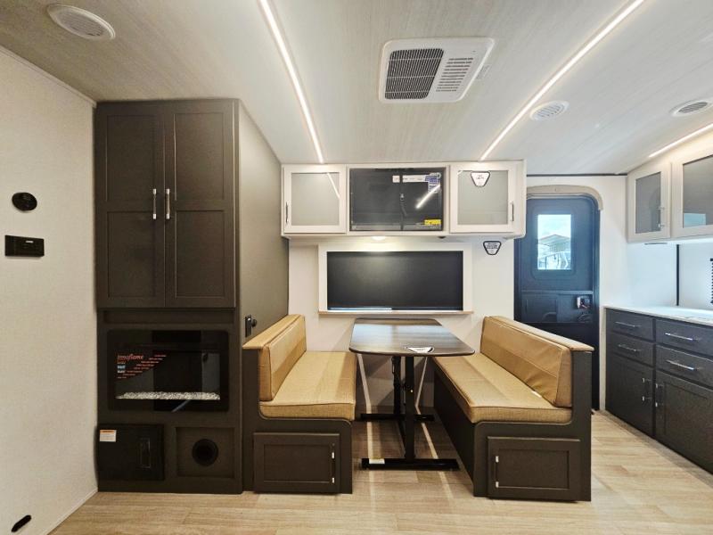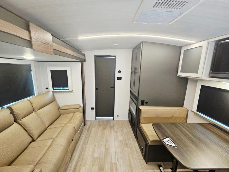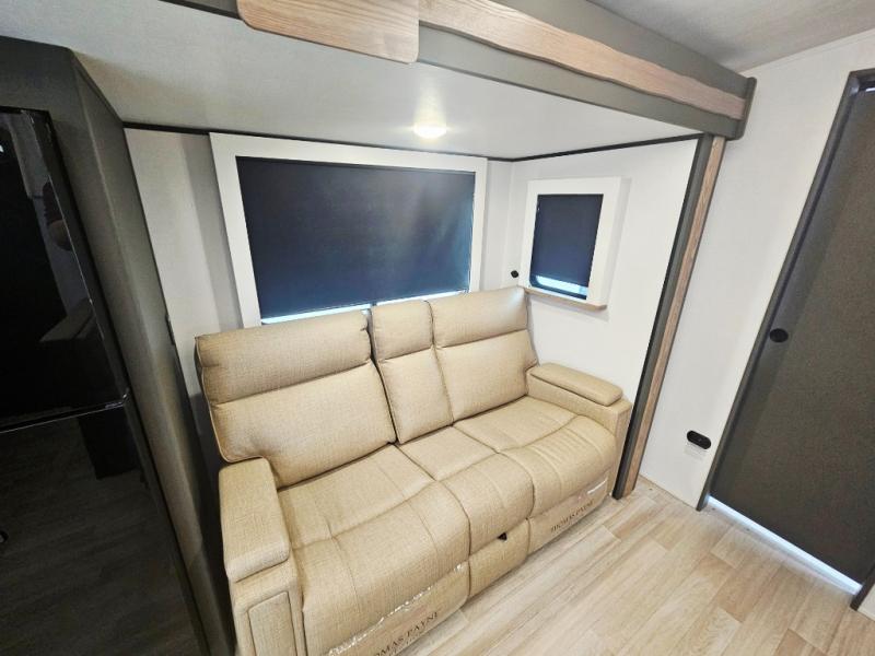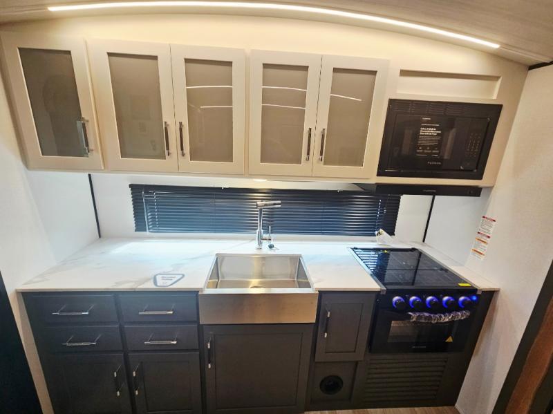 One step inside this dual entry travel trailer and you'll be sold! The rear kitchen features ample counter space to prep meals, and the do-more dinette table provides a place to dine together. There is also an outdoor kitchen with a griddle and mini fridge plus a 19' awning if you want to cook and eat outdoors. Two pantries and a 12V refrigerator will let you keep food stocked, and the tri-fold sofa slide provides sleeping space for guests. A walk-thru bath will create a front master bedroom you are sure to love, complete with a queen bed plus dual nightstands and dual wardrobes to keep everything tidy!